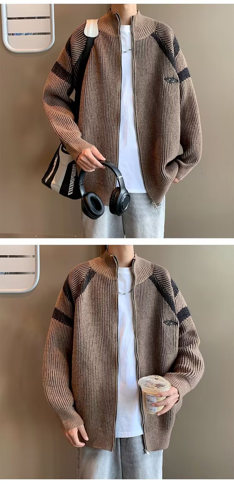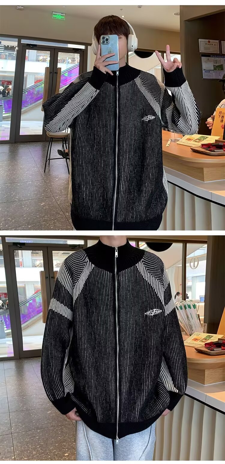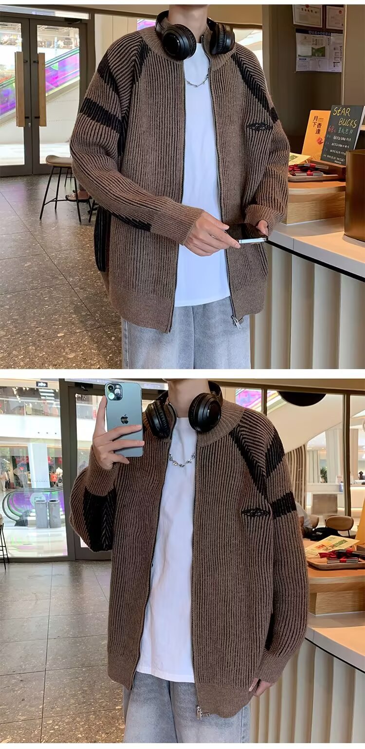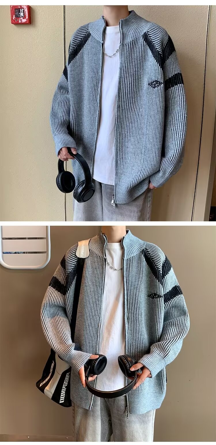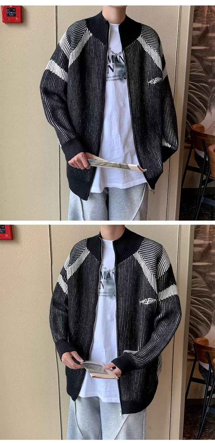 틈새 디자인 센스 수직 스트라이프 지퍼 수직 칼라 니트 카디건 남자 트렌디 스트리트 올 매치 콘트라스트 컬러 스웨터 재킷