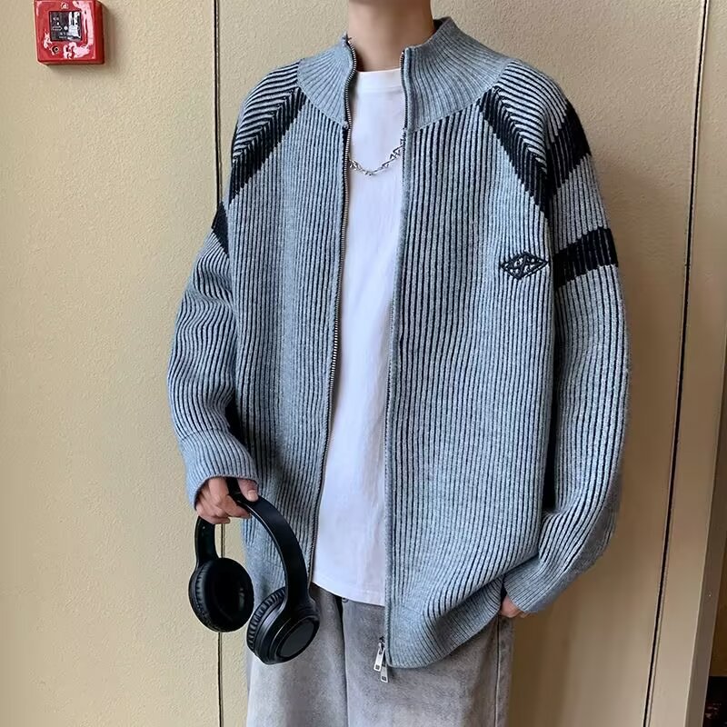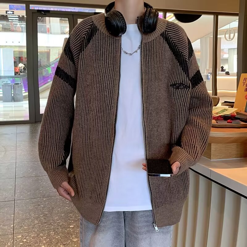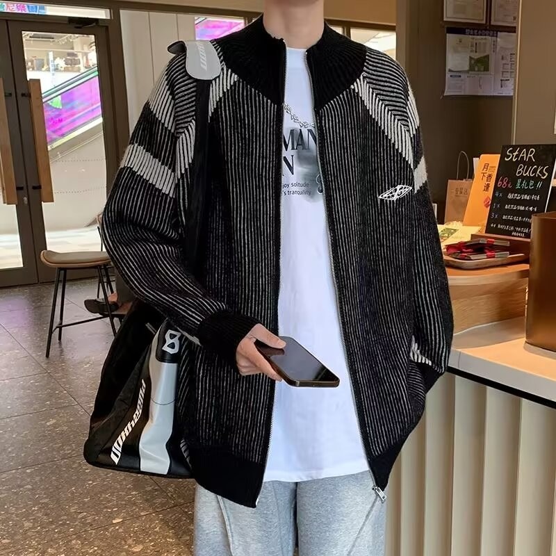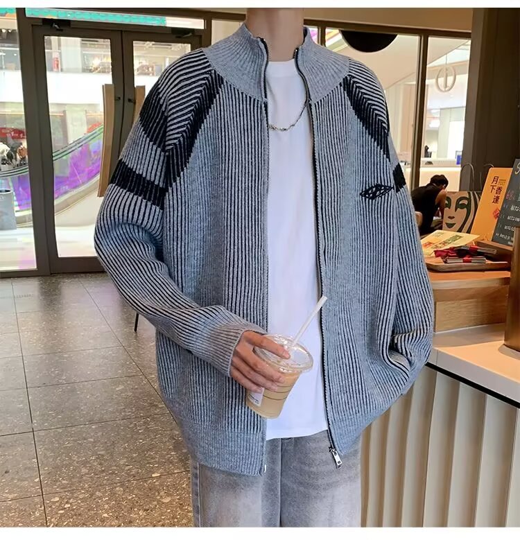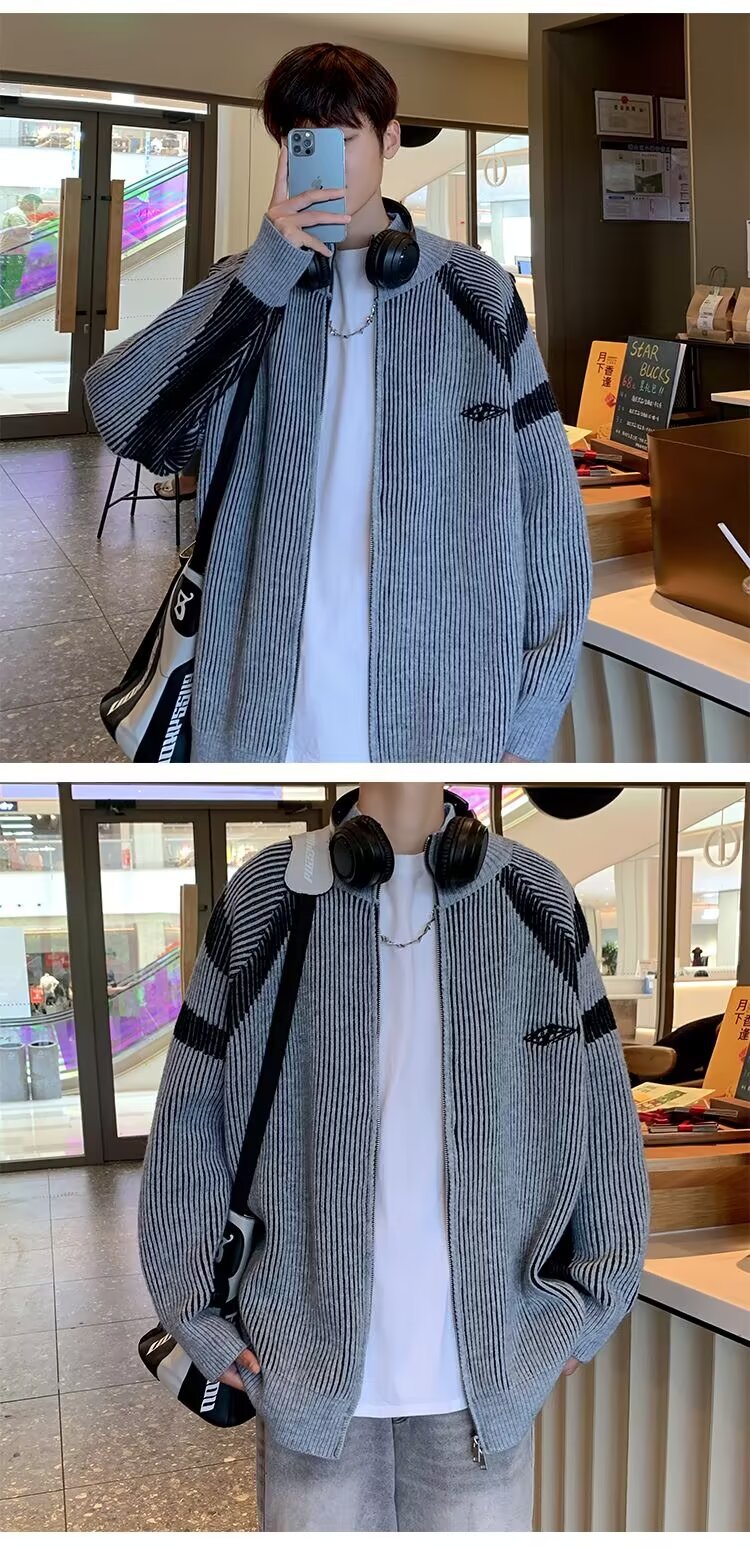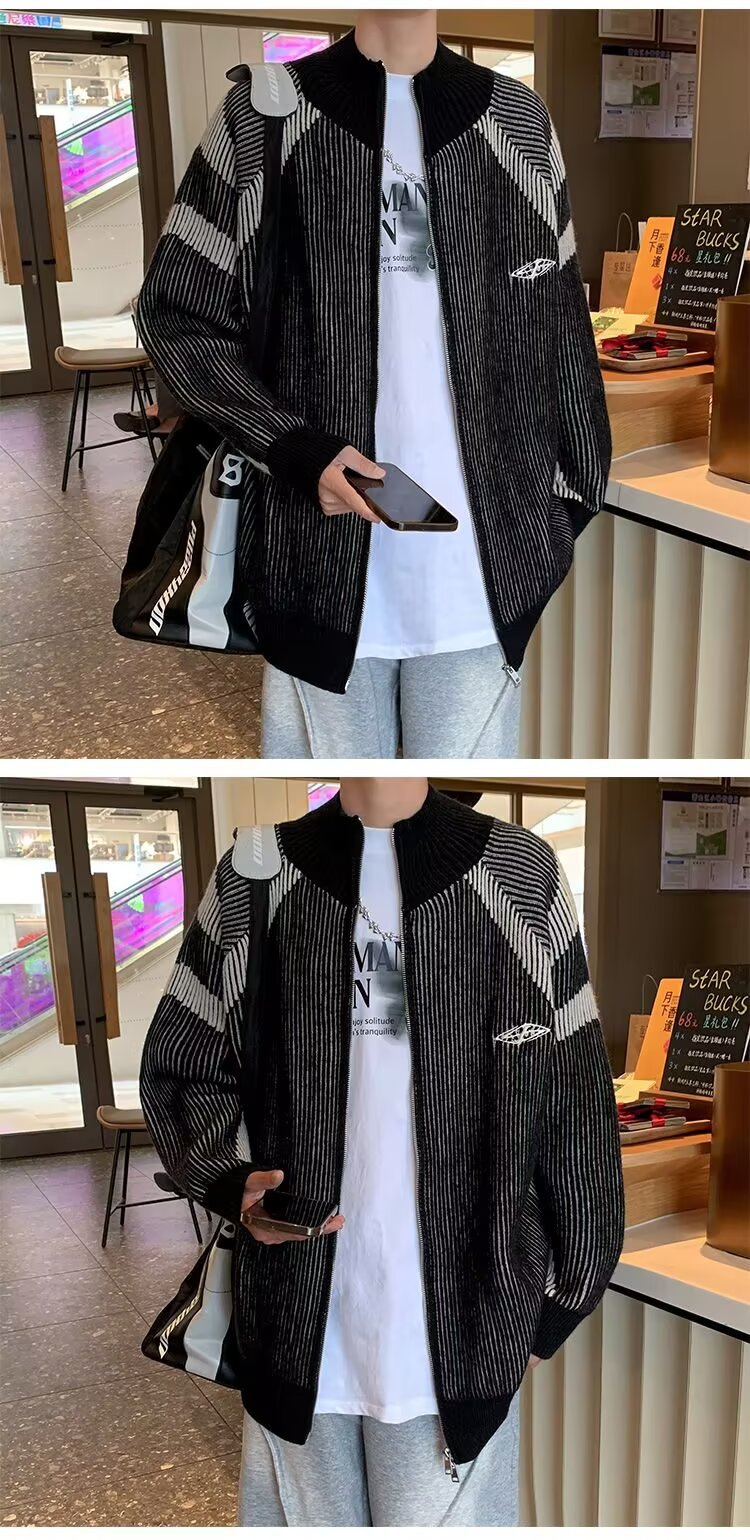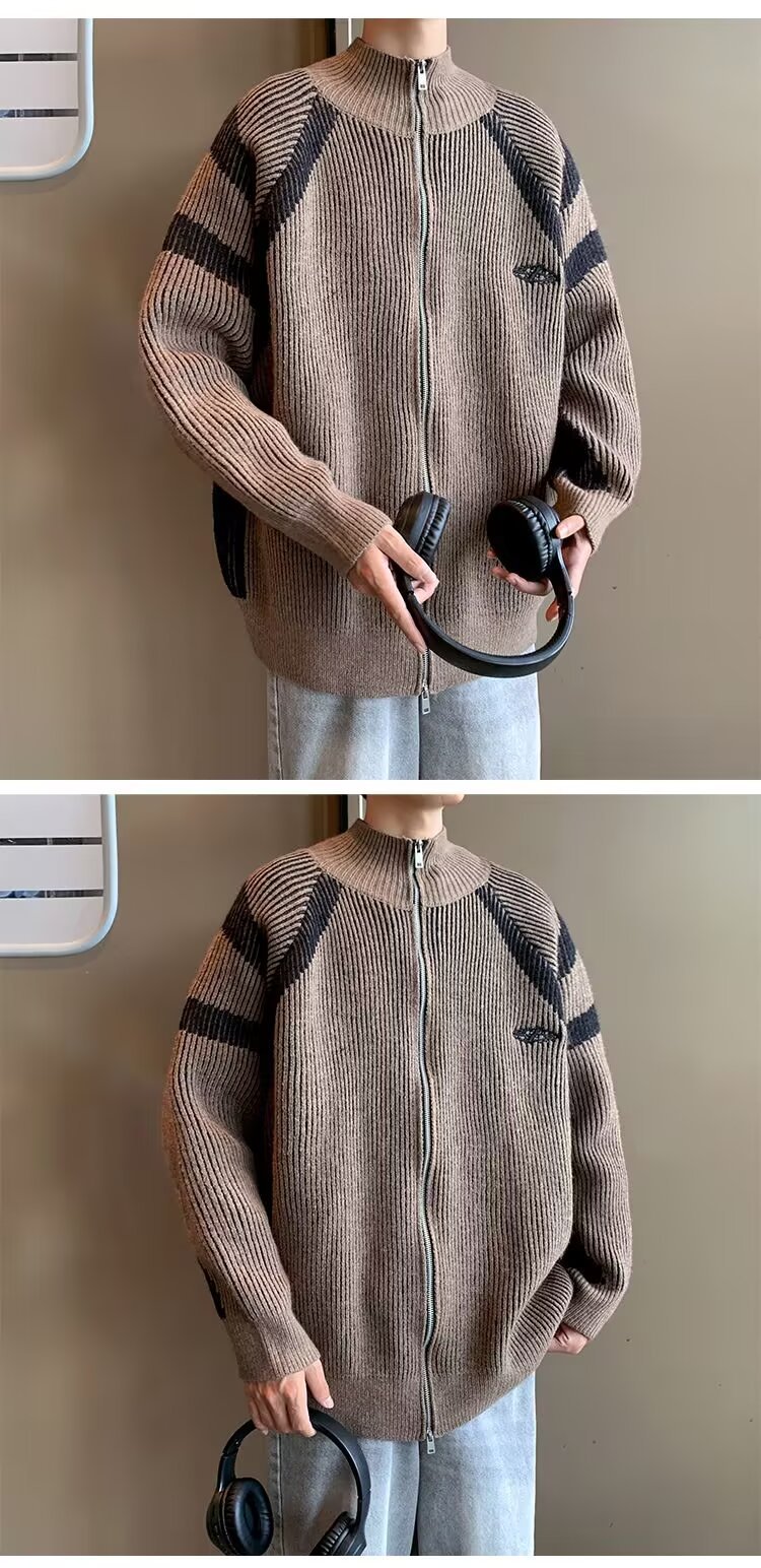 틈새 디자인 센스 수직 스트라이프 지퍼 수직 칼라 니트 카디건 남자 트렌디 스트리트 올 매치 콘트라스트 컬러 스웨터 재킷