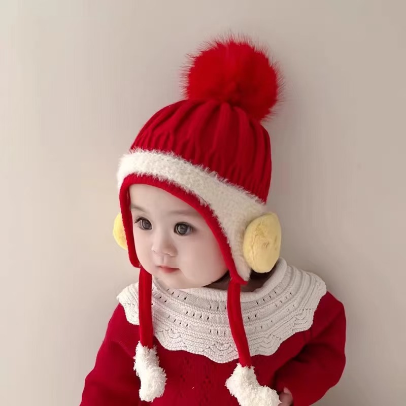 • 빨간 병아리 공 귀 보호 모자