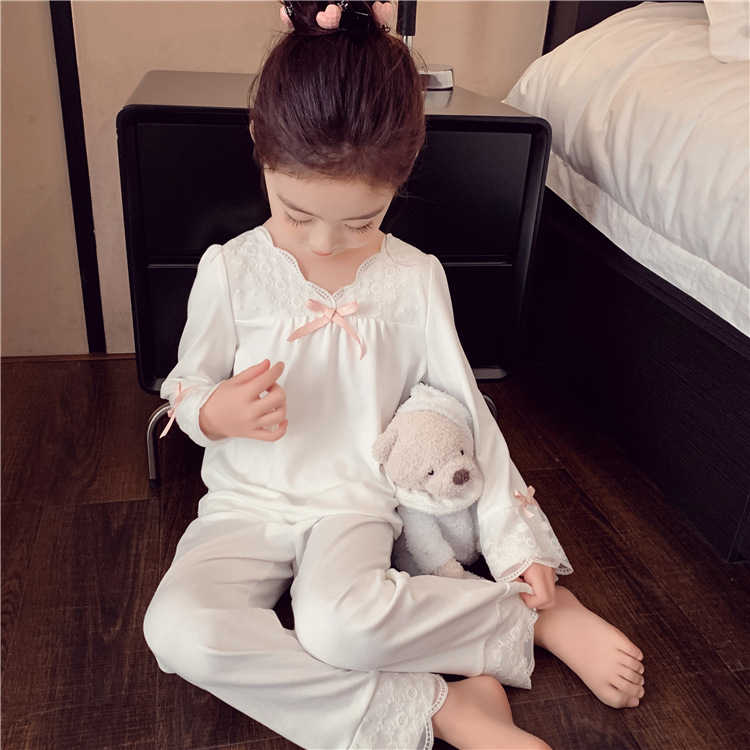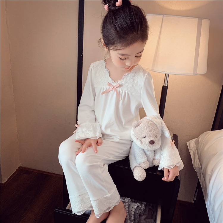 소녀 홈 의류 세트 봄과 가을 새로운 레이스 레이스 어린이 느슨한 긴팔 파자마 달콤한 투피스 세트