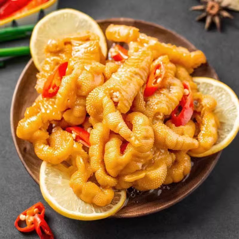 불이없는 뼈없는 레몬 뼈없는 닭 발 매운 음식 식욕을 돋우는 간식 절인 고추 신 매운 닭 발 레몬 뼈없는
