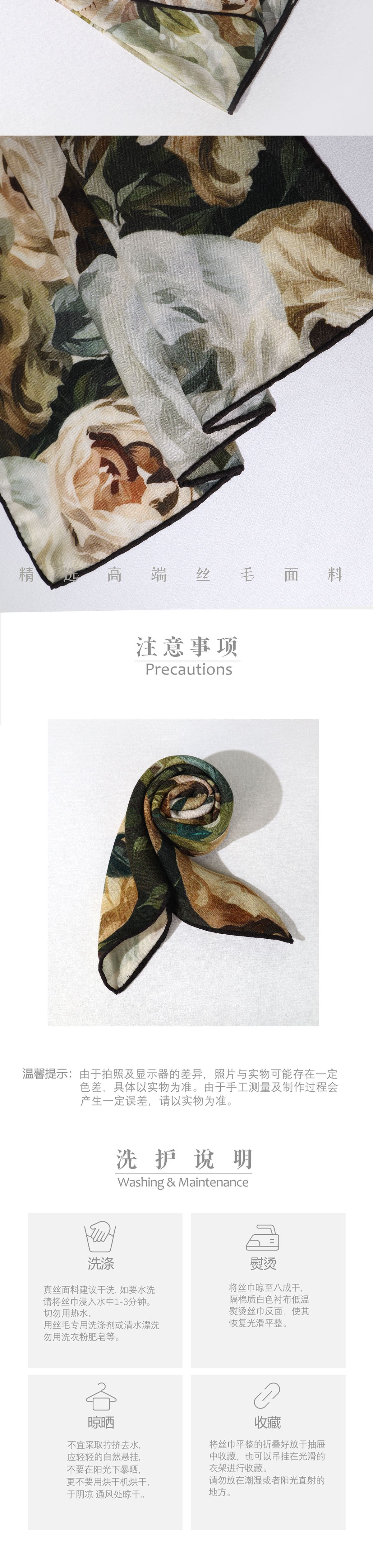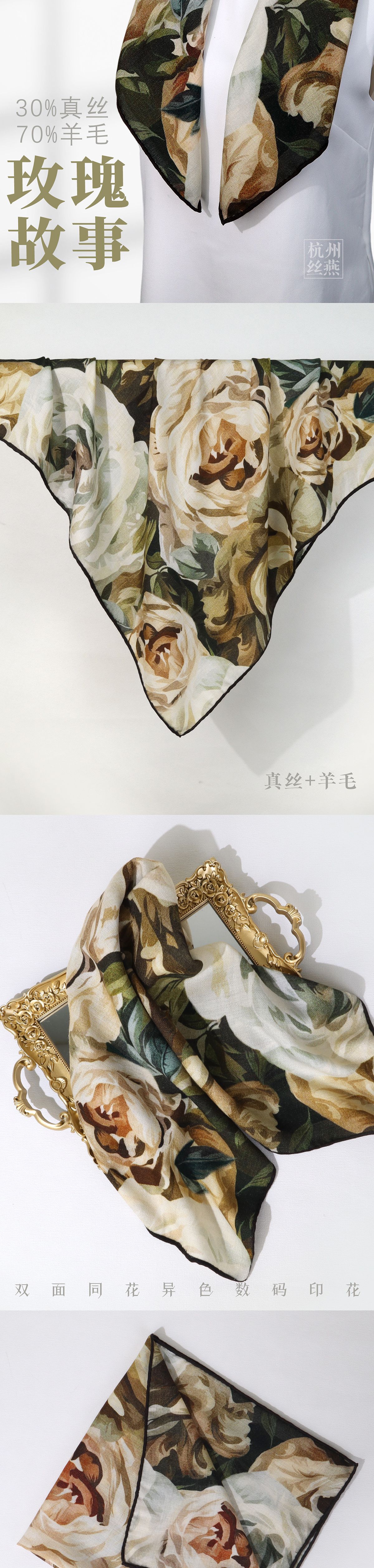 [장미이야기] 신비 · 로맨틱 양면 실크 양모 스카프 다재다능한 70 대 여성 위한 실크 양모 중형 스퀘어 스카프
