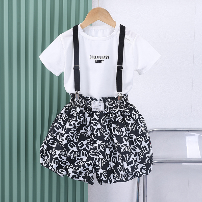 소녀의 최고 여름 편지 인쇄 반팔 올매치 새로운 스타일 중년 어린이 세트 스트랩 반바지 투피스 세트