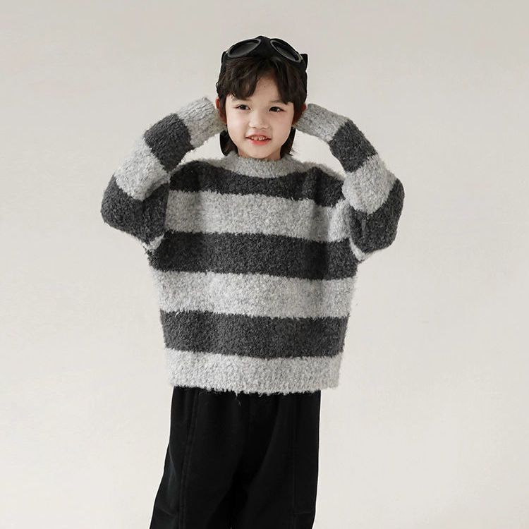 소년 스웨터 레트로 두꺼운 니트 셔츠 2024 가을과 겨울 새 기모 따뜻한 크루 넥베이스 셔츠