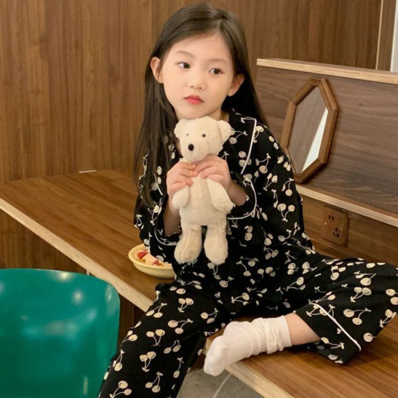 새로운 소녀 귀여운 체리 잠옷 세트 어린이 어린 소녀 얇은 봄과 가을 중대 어린이 외출 가정 옷스토어 가기