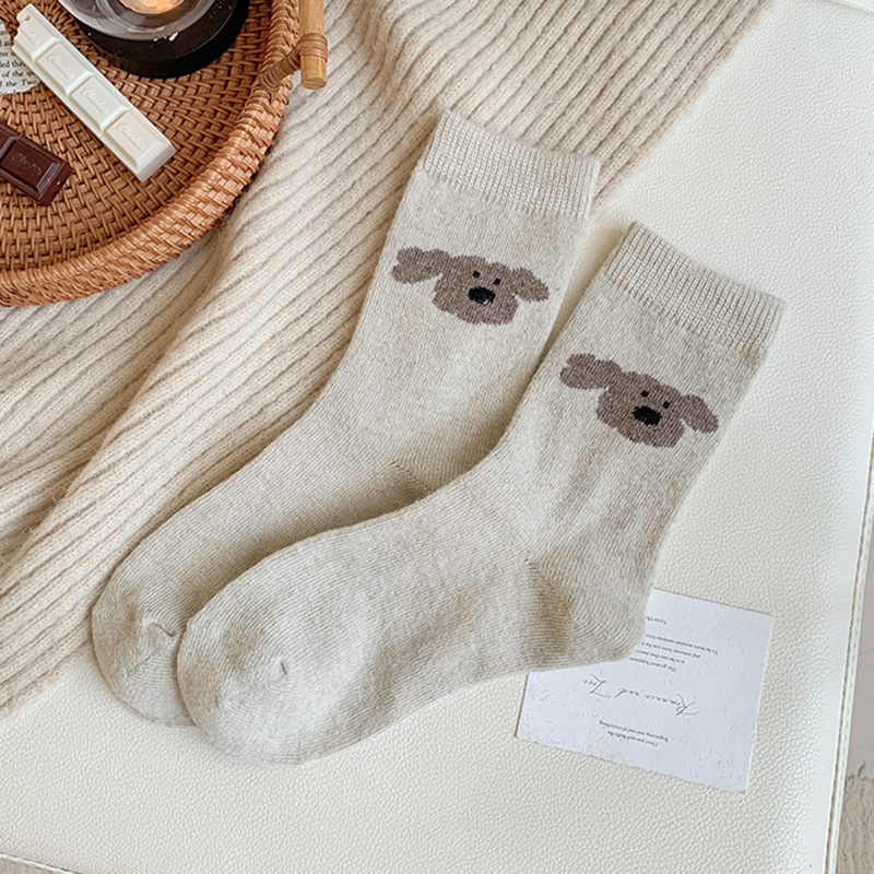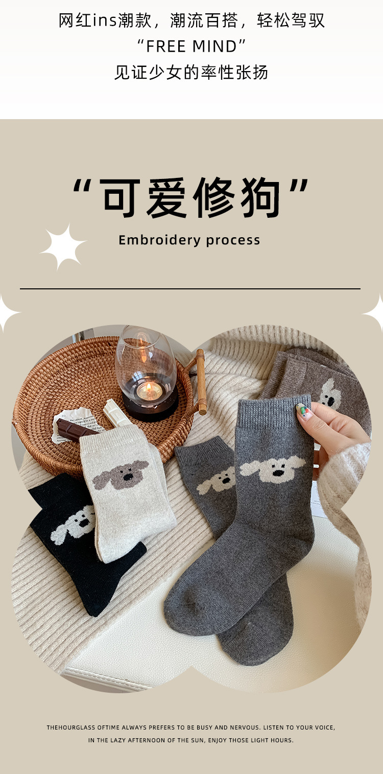 가을과 겨울 두꺼운 강아지 양모 양말 일본식 인스타그램 스타일 트렌디 올매치 귀여운 만화 중간 길이 양말 한국 스타일 스타킹