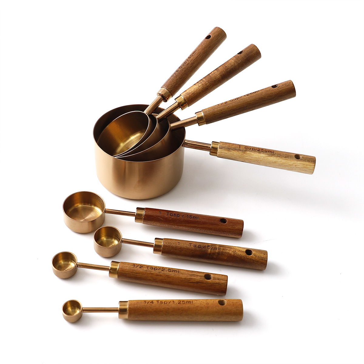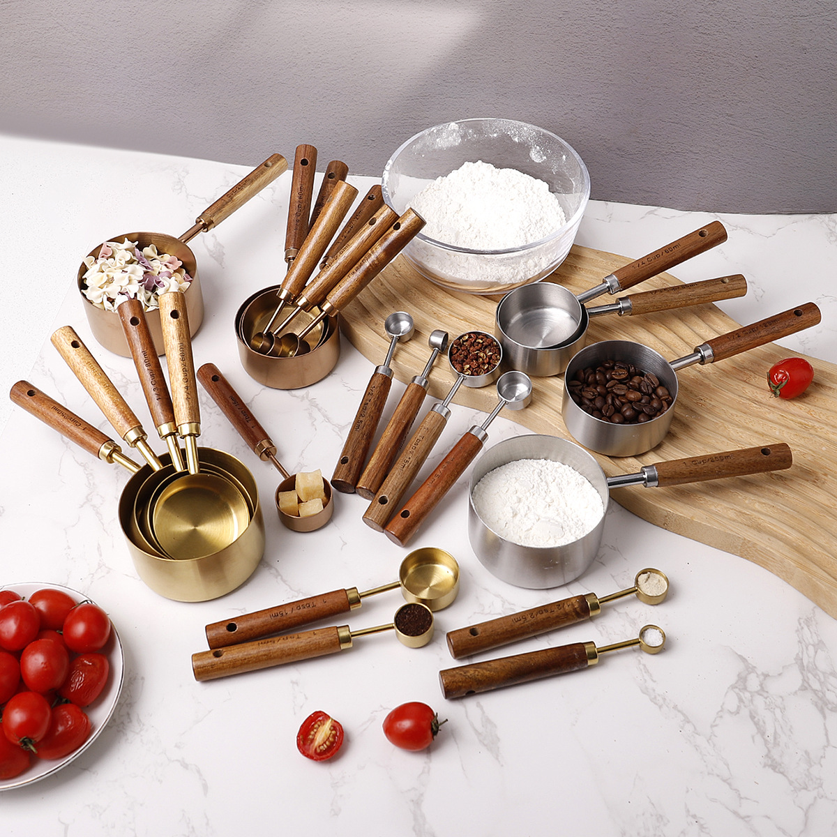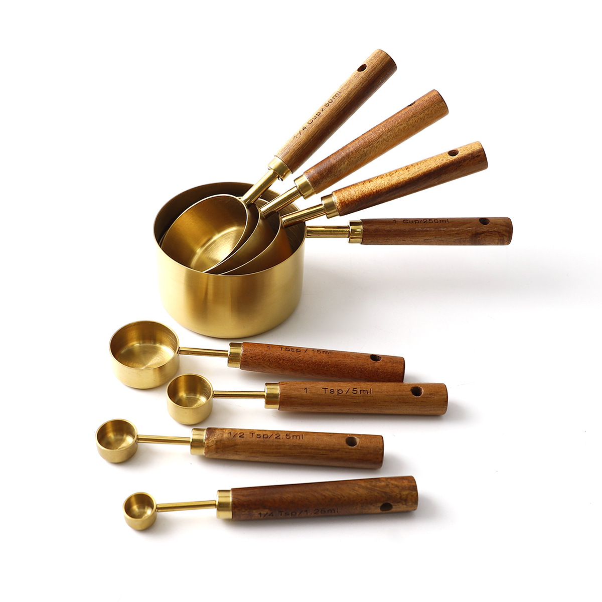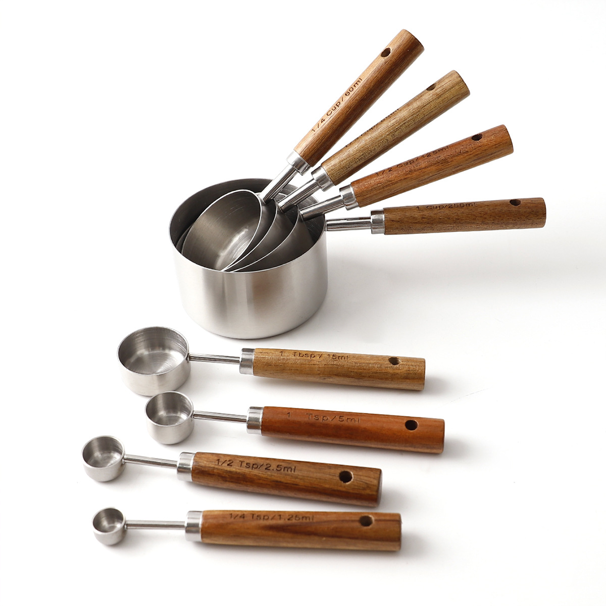 재고 도매 아카시아 나무 손잡이 측정 컵 스푼 8 개 세트 커피 측정 숟가락 측정 컵 베이킹 도구