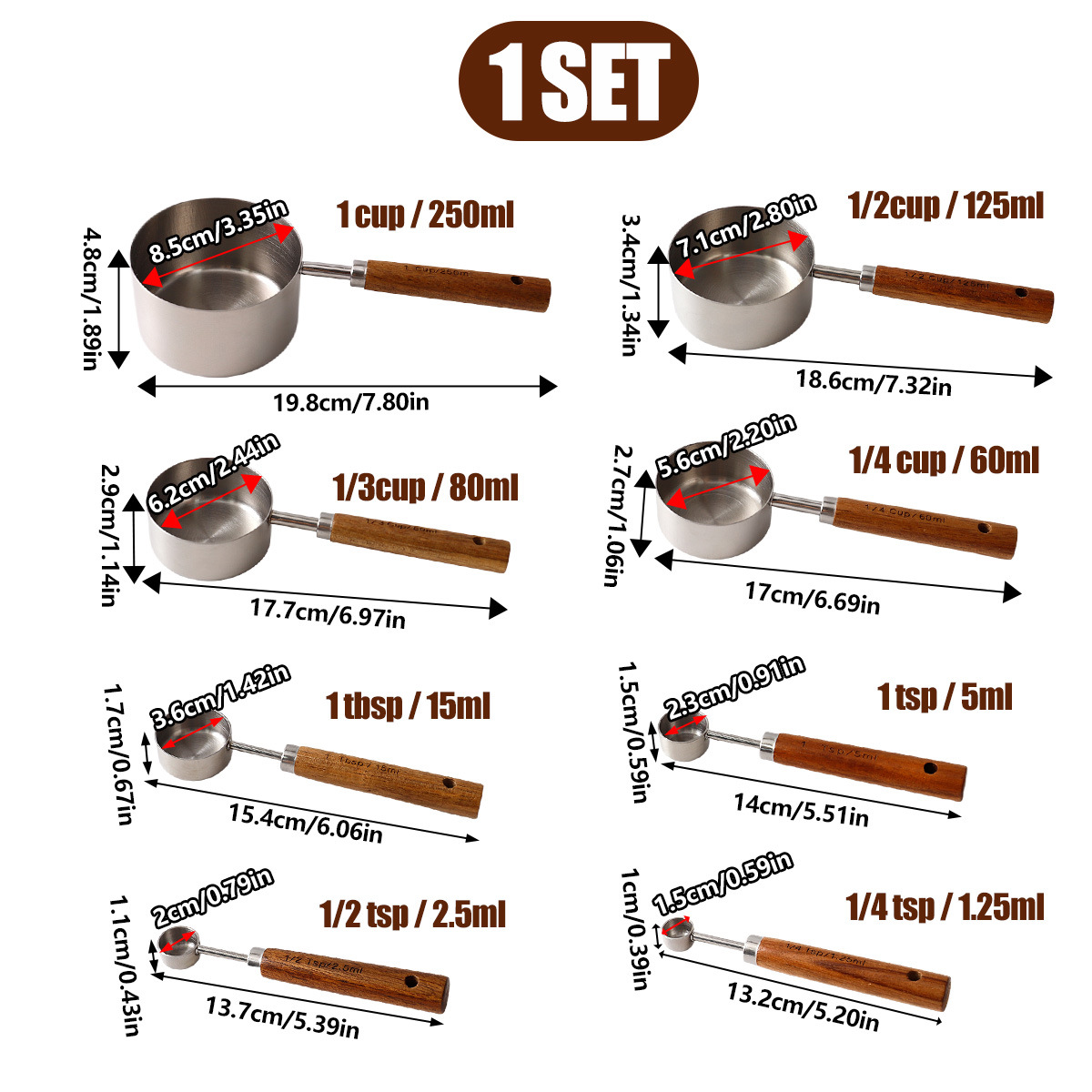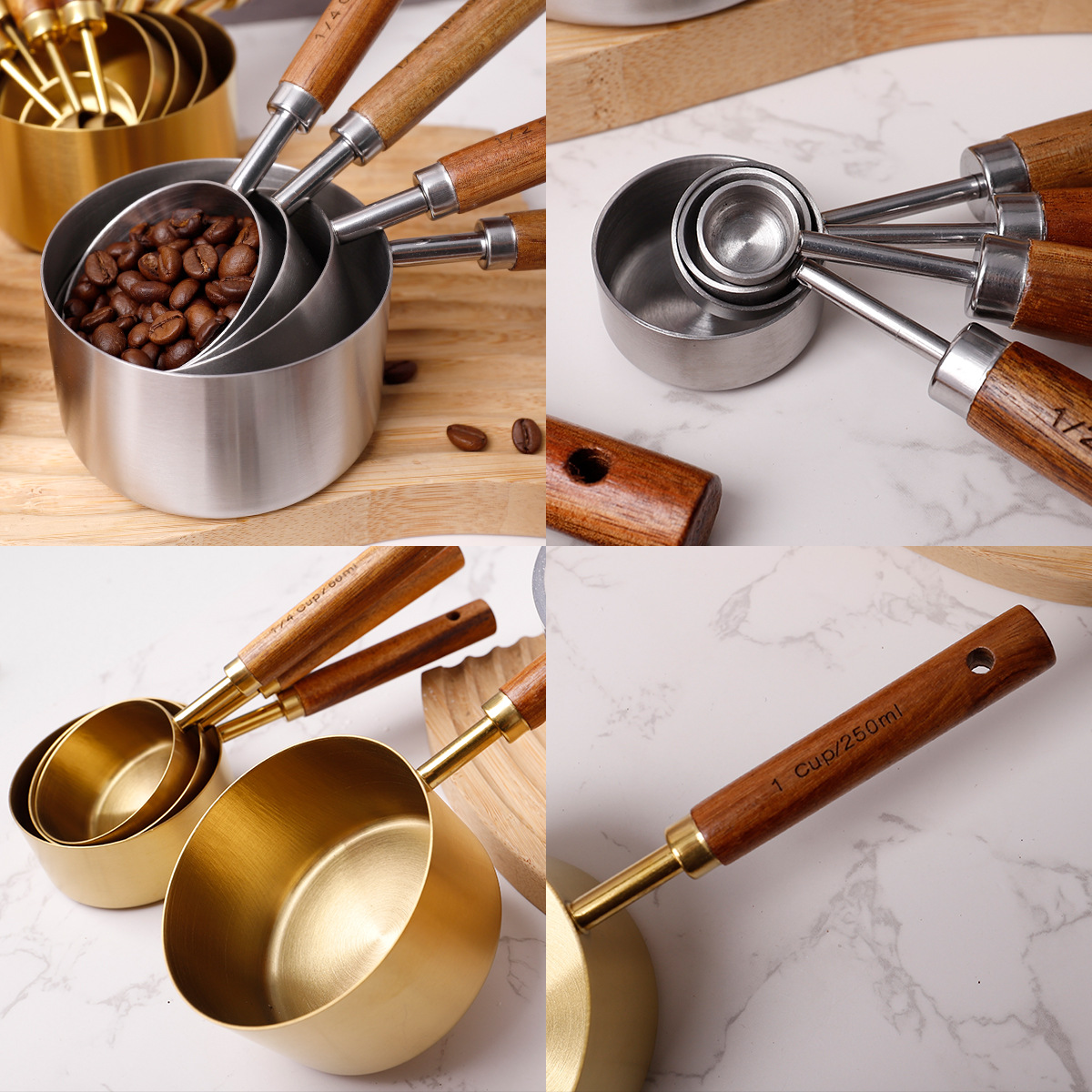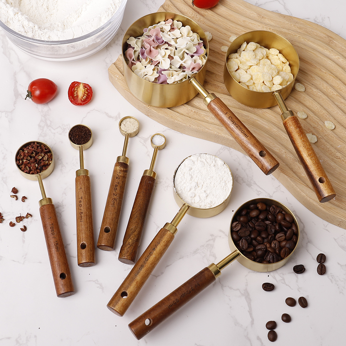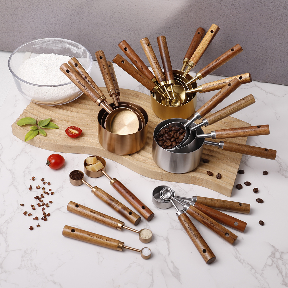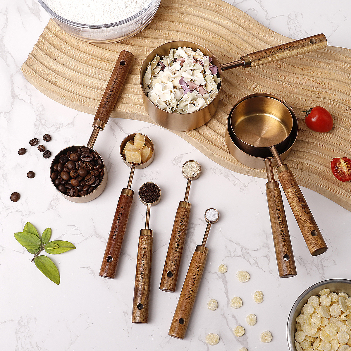 재고 도매 아카시아 나무 손잡이 측정 컵 스푼 8 개 세트 커피 측정 숟가락 측정 컵 베이킹 도구