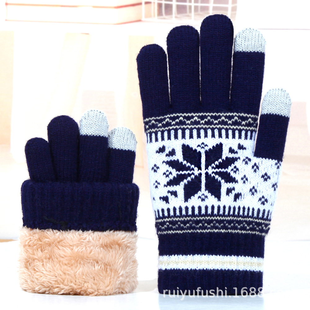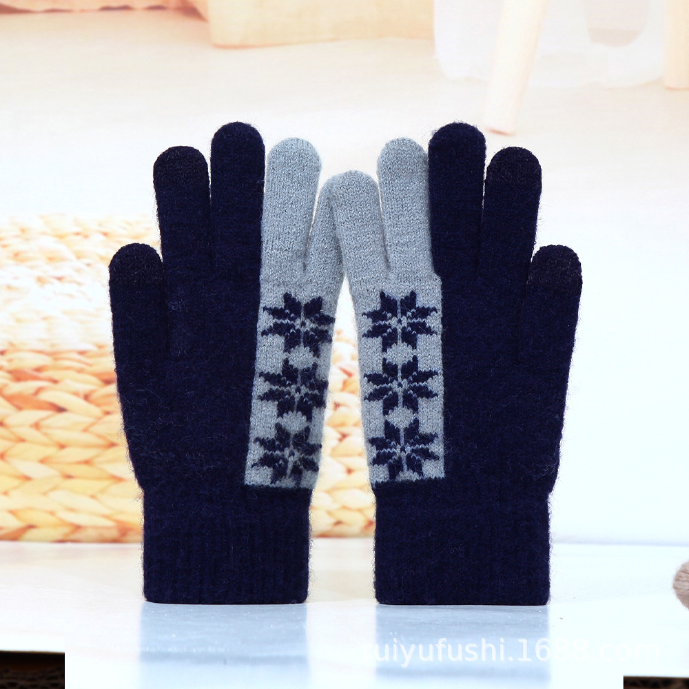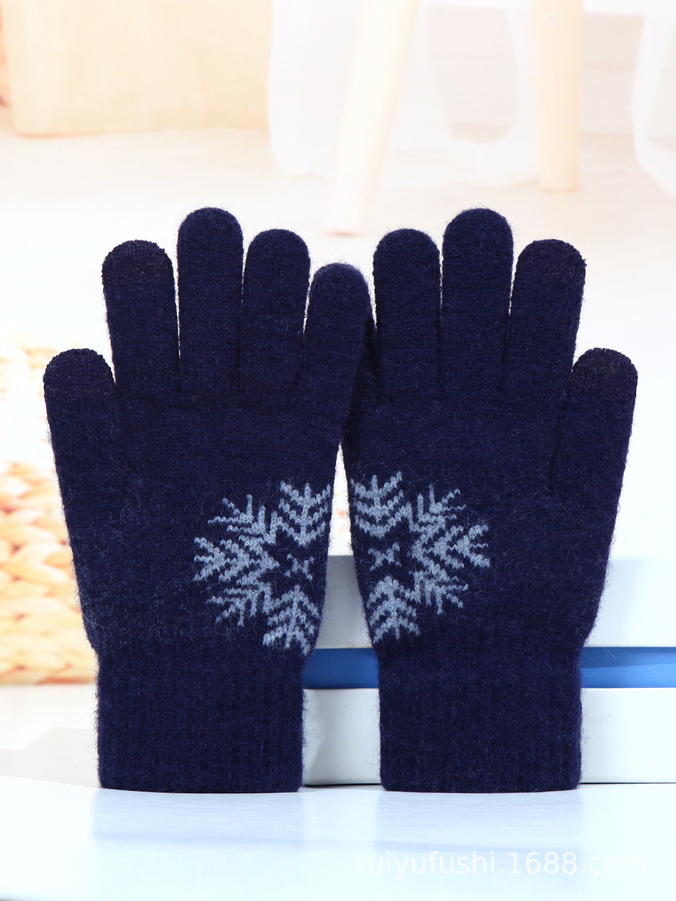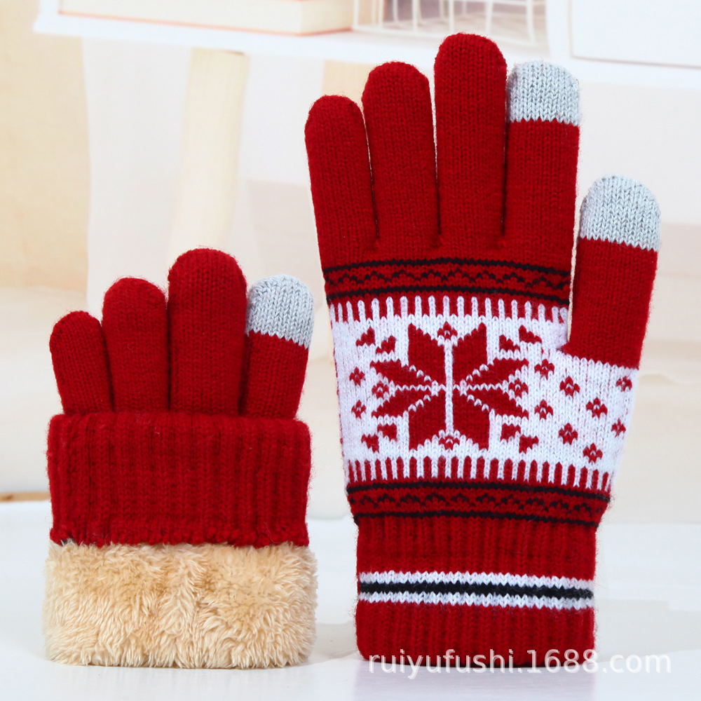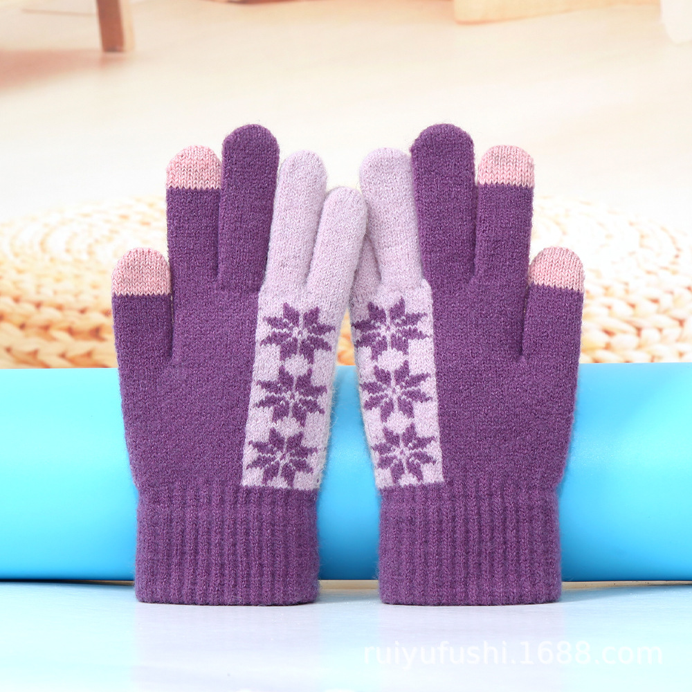 도매 기모 두꺼운 여성용 터치스크린 장갑 다섯 손가락 눈꽃 무늬 보온 니트 장갑 모직 니트 재고 정리스토어 가기