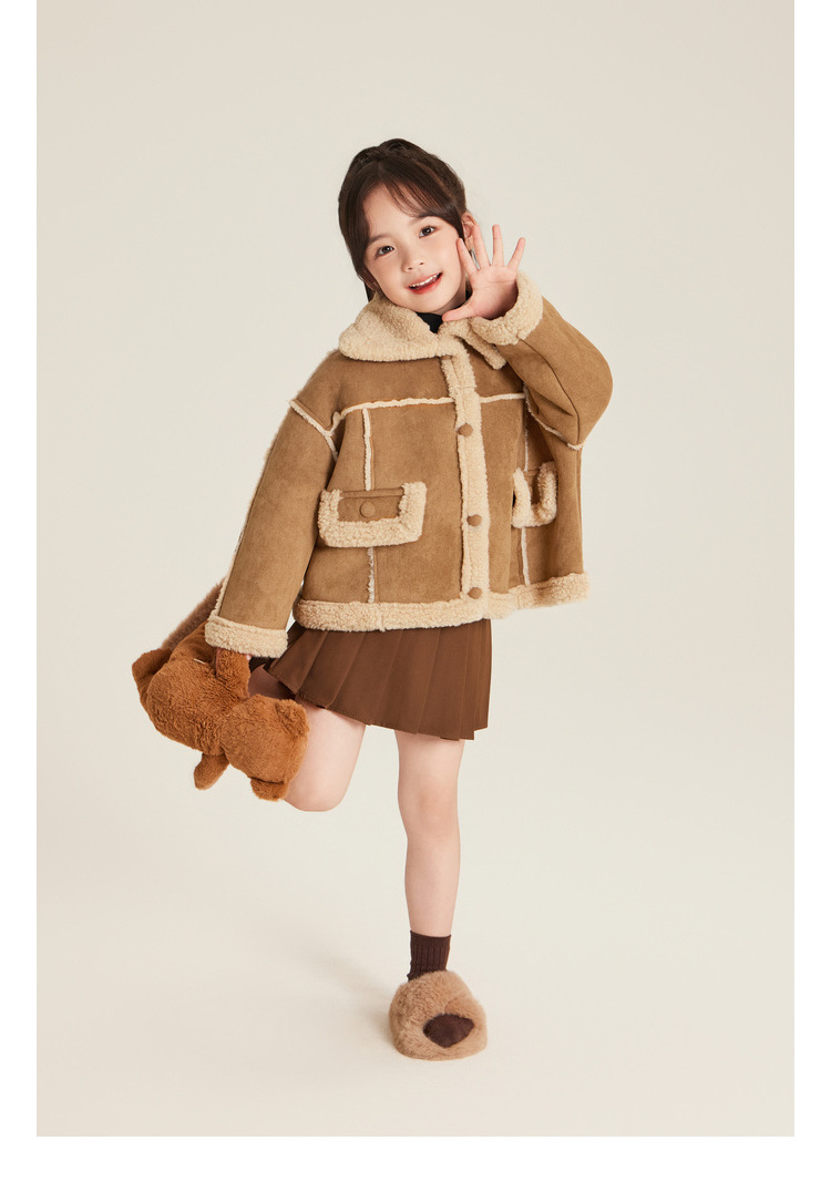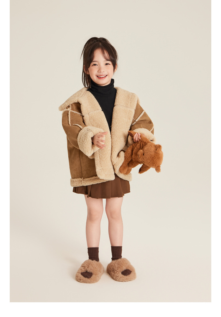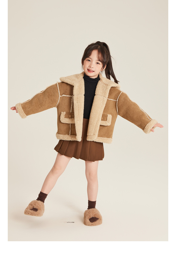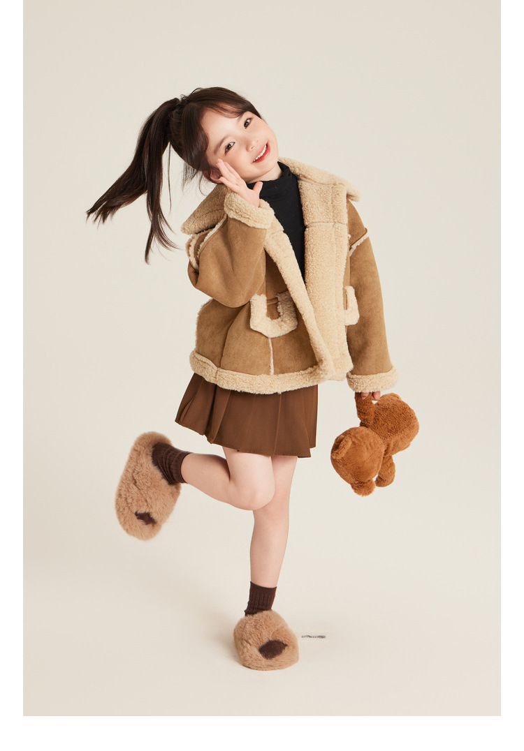 Amybaby Girls 'Top Winter 2024 새로운 어린이 복고풍 양모 따뜻한 모피 원피스 재킷스토어 가기