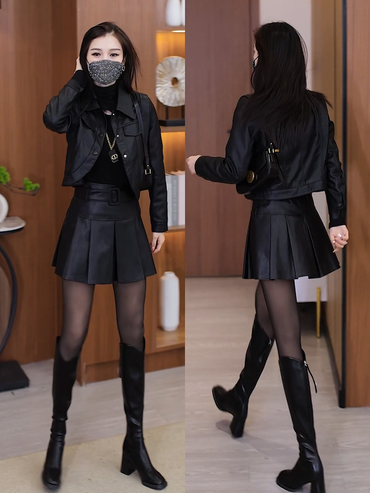 • 블랙 가죽 자켓 + 짧은 스커트 [슈트 - 벨벳 털이 없는 칼라]