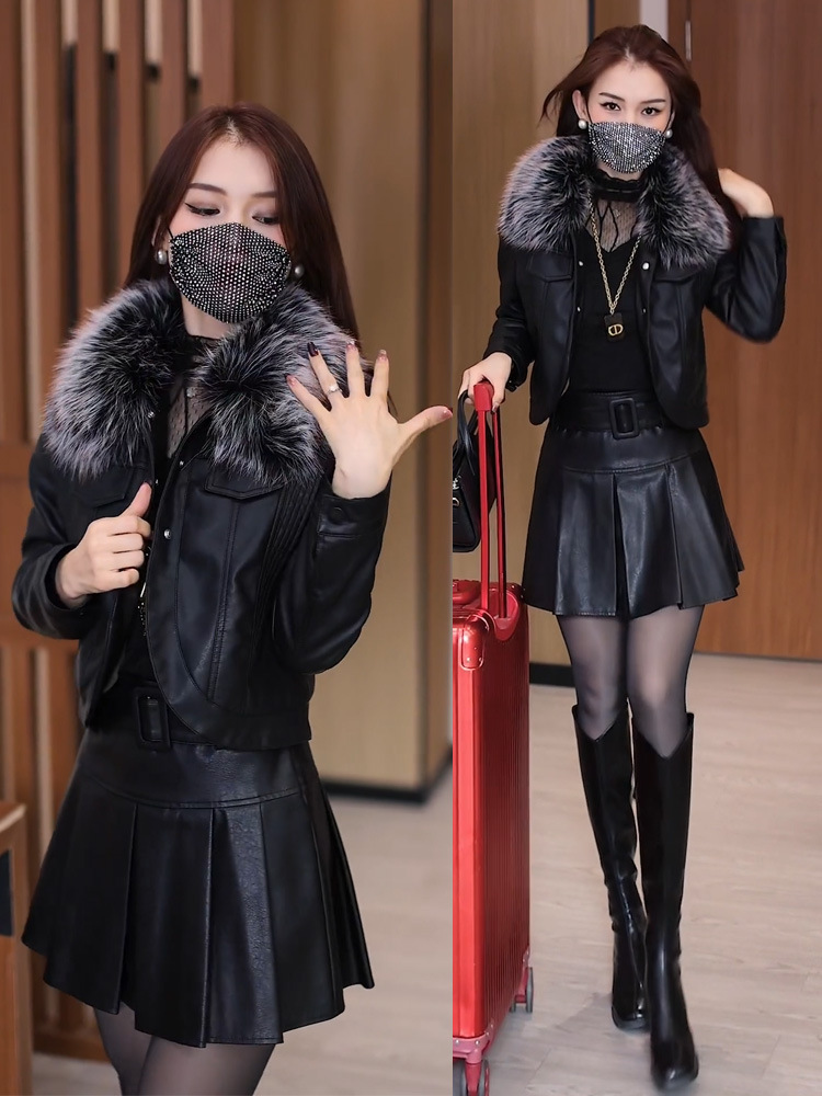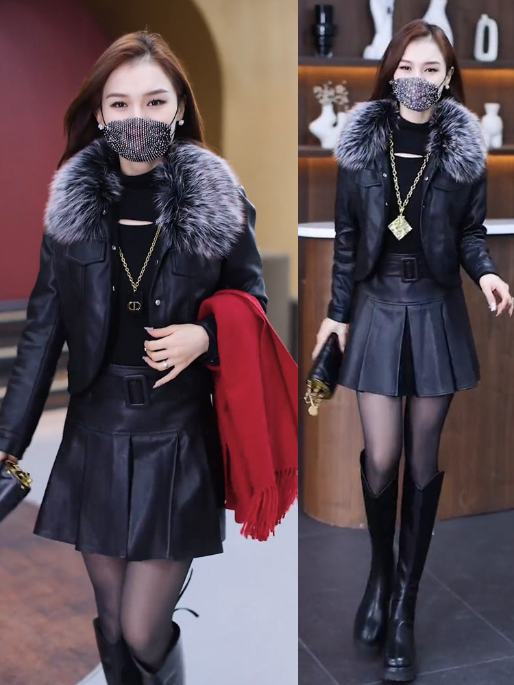 • 블랙 가죽 자켓 + 짧은 스커트 [벨벳과 퍼 칼라가 있는 슈트]