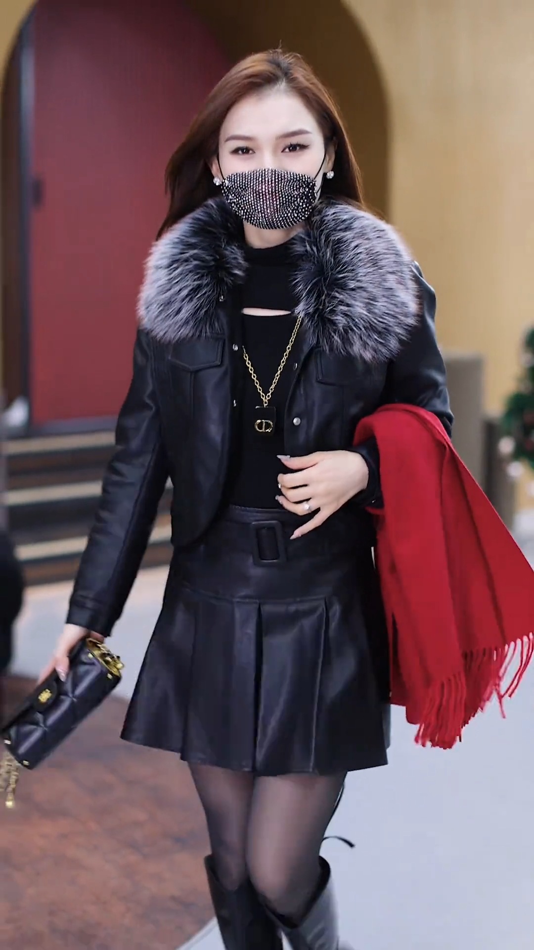• 앵커 레드 가죽 자켓 + 블랙 스커트 [벨벳과 퍼 칼라가 있는 슈트]
