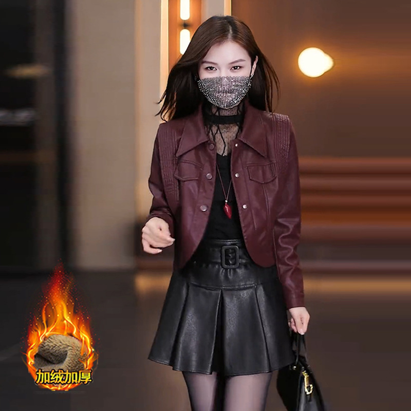 여성을 위한 패셔너블한 짧은 코트 2023 가을 겨울 새로운 스타일 플러스 벨벳 두꺼운 PU 가죽 코트 작은 사람들을 위한 완전한 세트스토어 가기