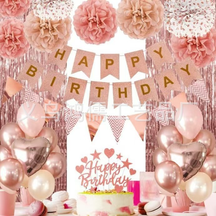 • 로즈 핑크 생일 깃발 나선형 풍선 세트