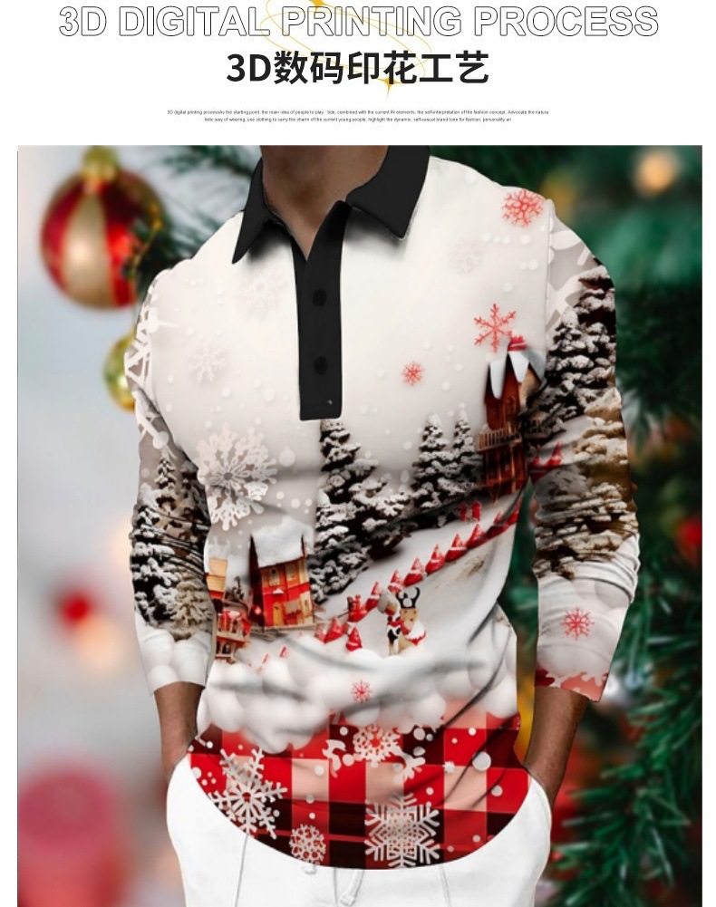 크로스 국경 3D 긴 소매 버튼 인쇄 폴로 셔츠 옷깃 남자의 크리스마스 동물 엘크 골프 셔츠 가을