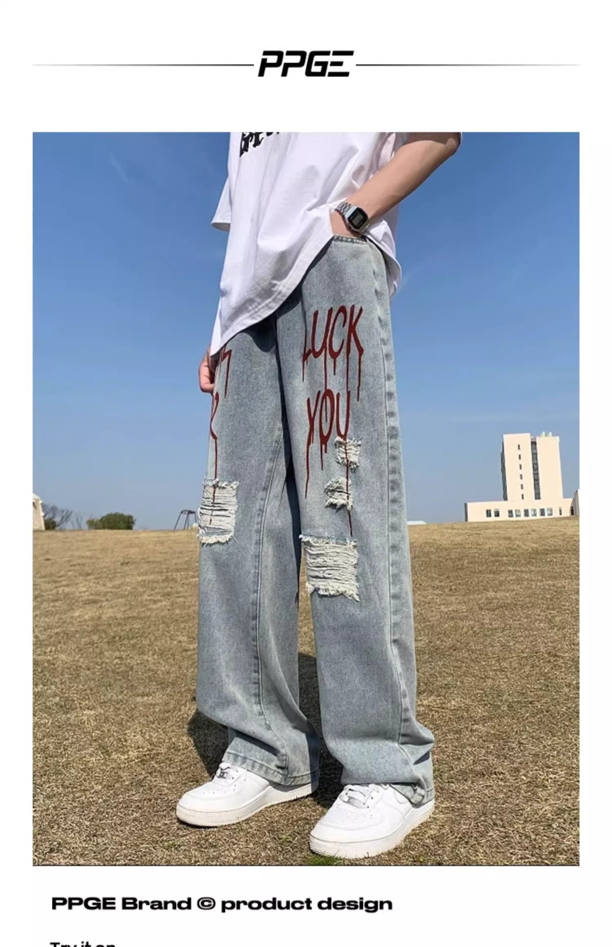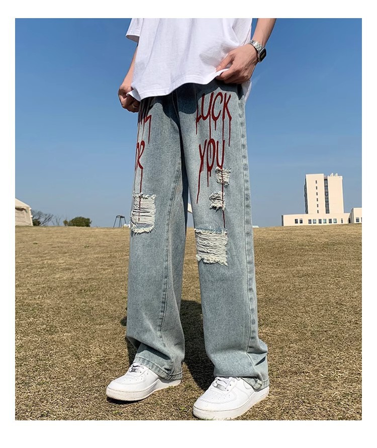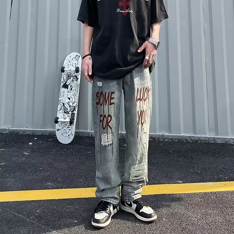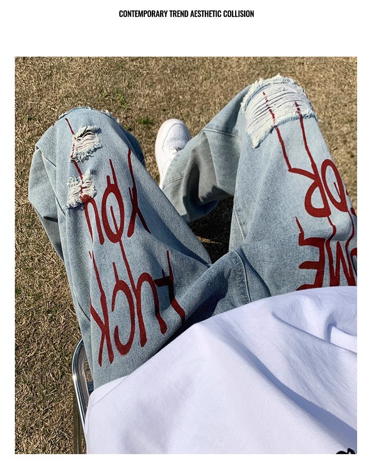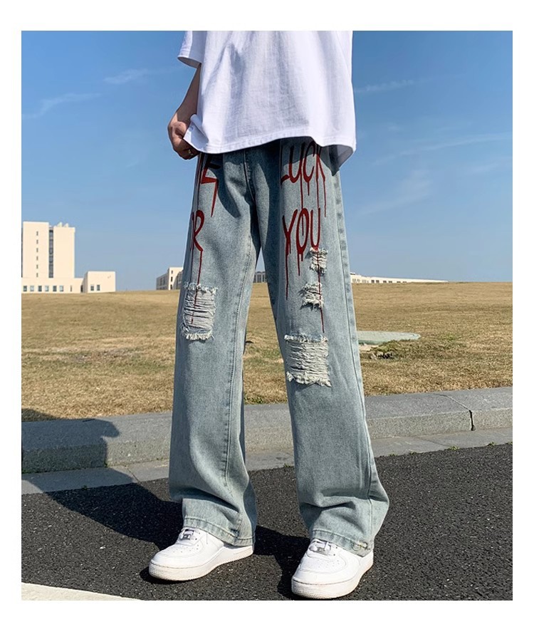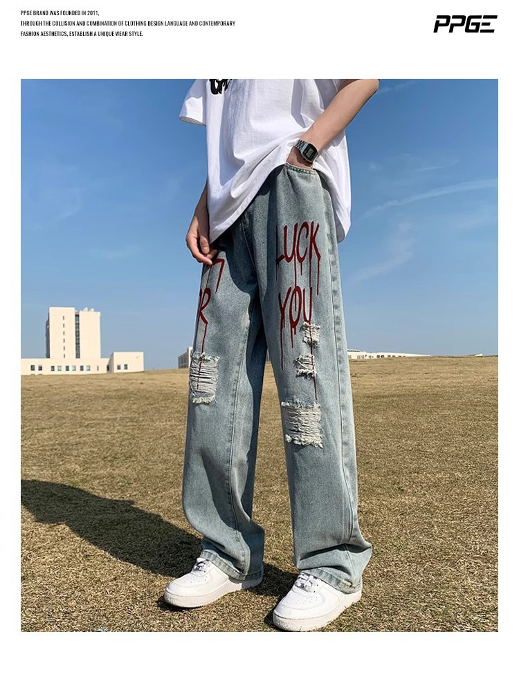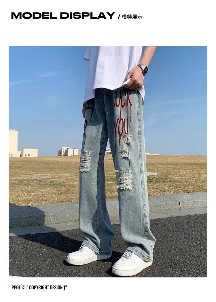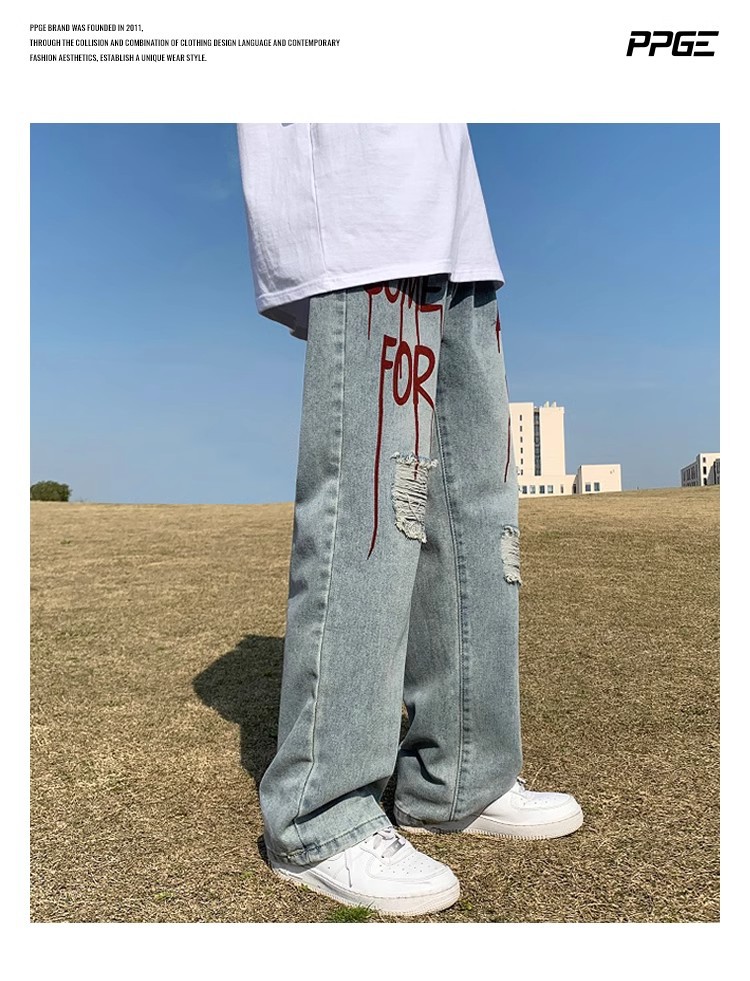 미국식 힙프 찢어진 청바지 남성 가을과 겨울 얇은 트렌디 브랜드 찢어진 분위기 스타일 하이 스트리트 느슨한 스트레이트 팬츠스토어 가기