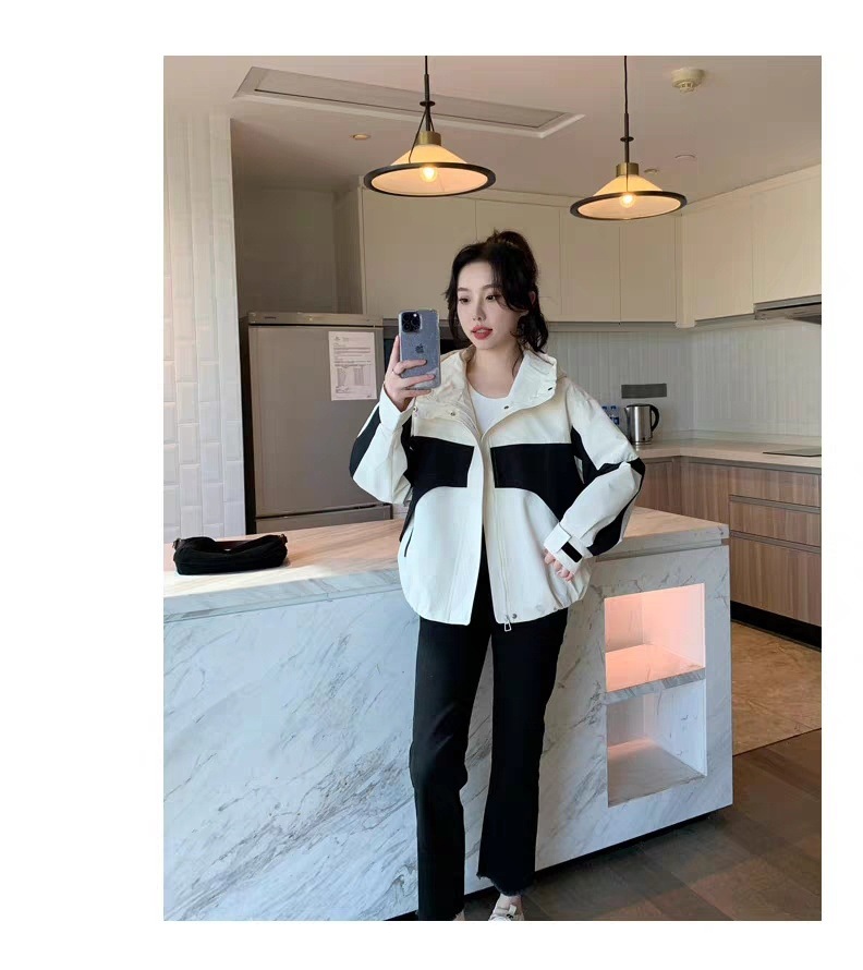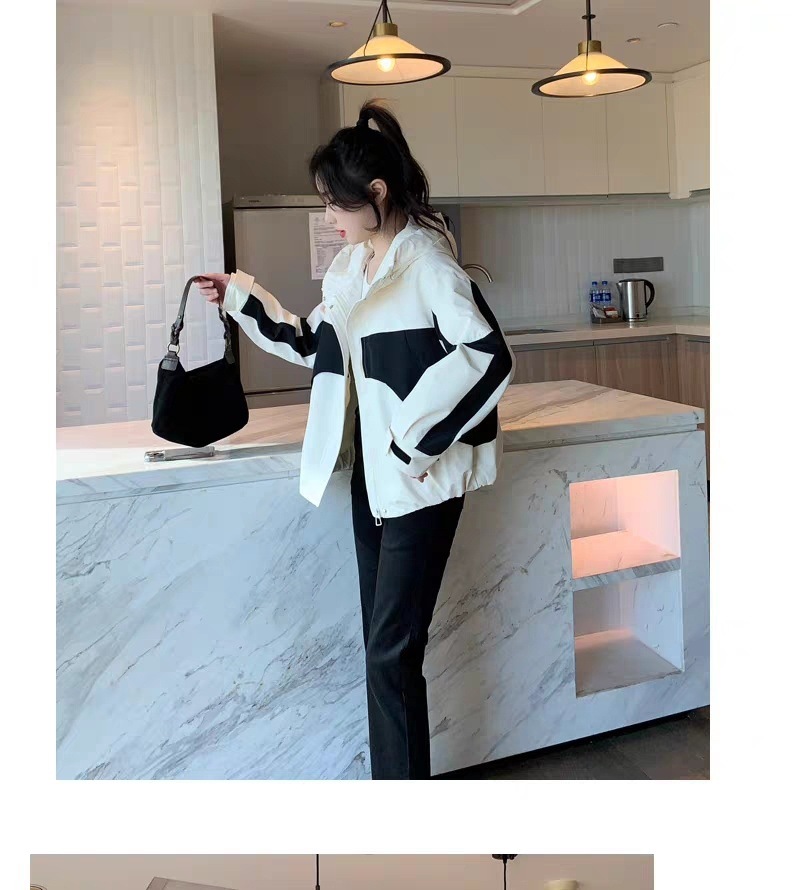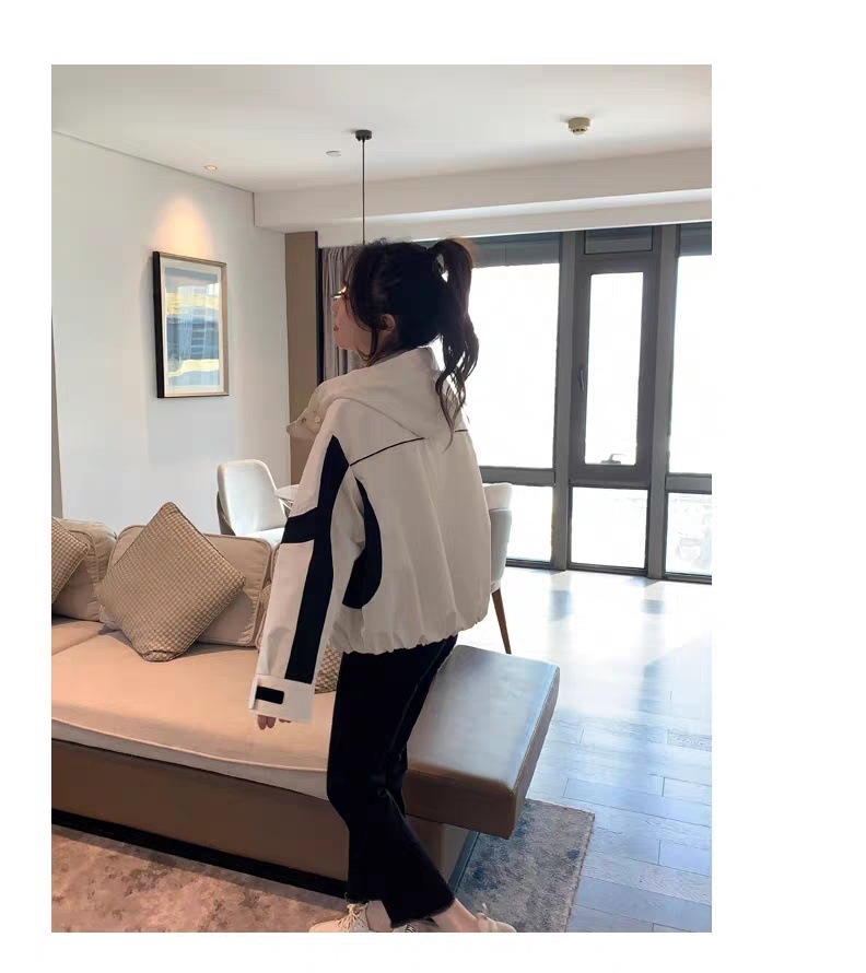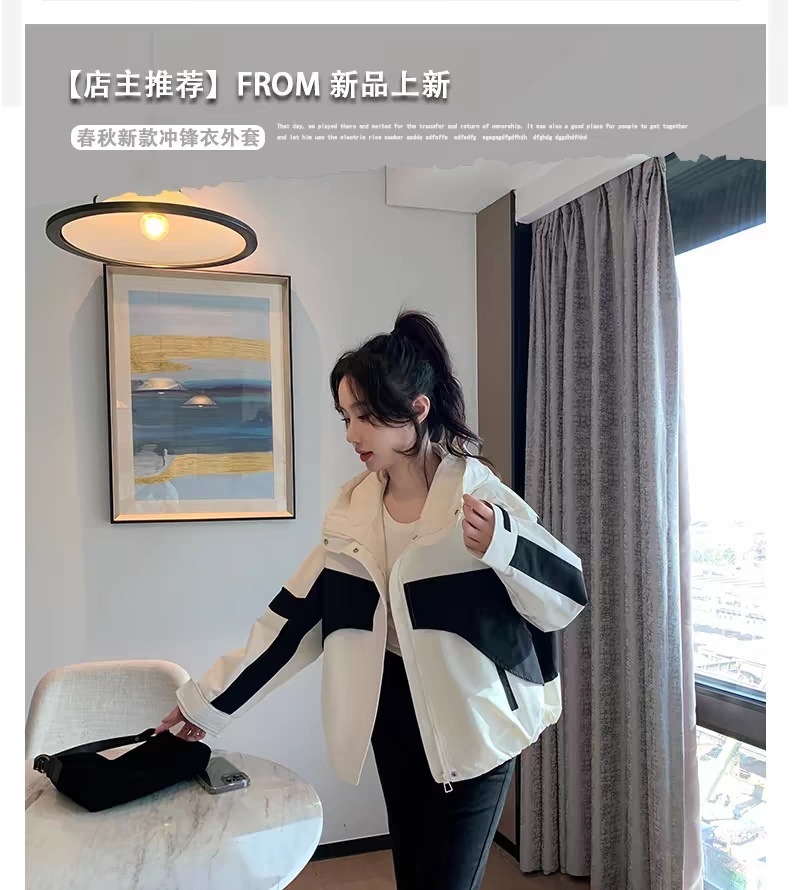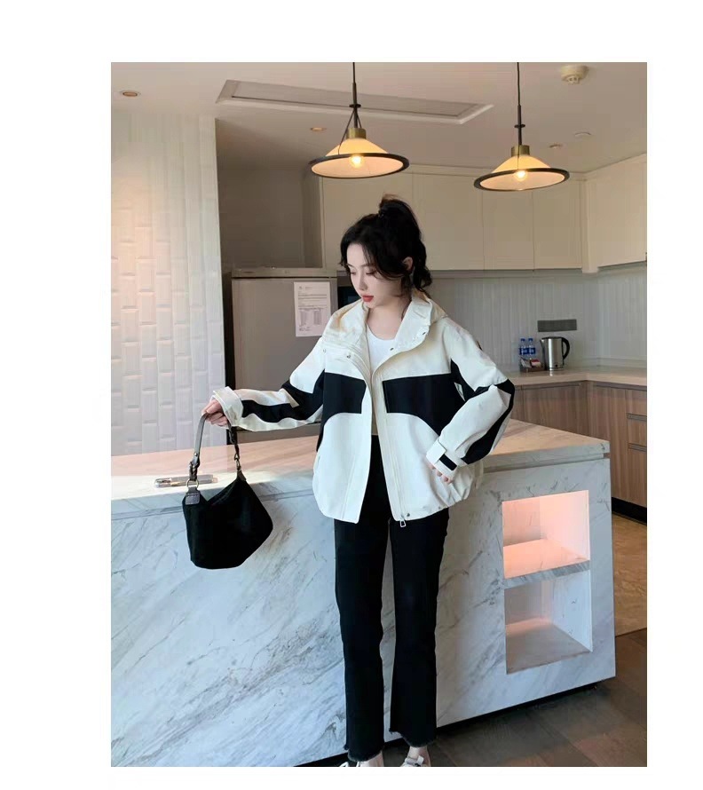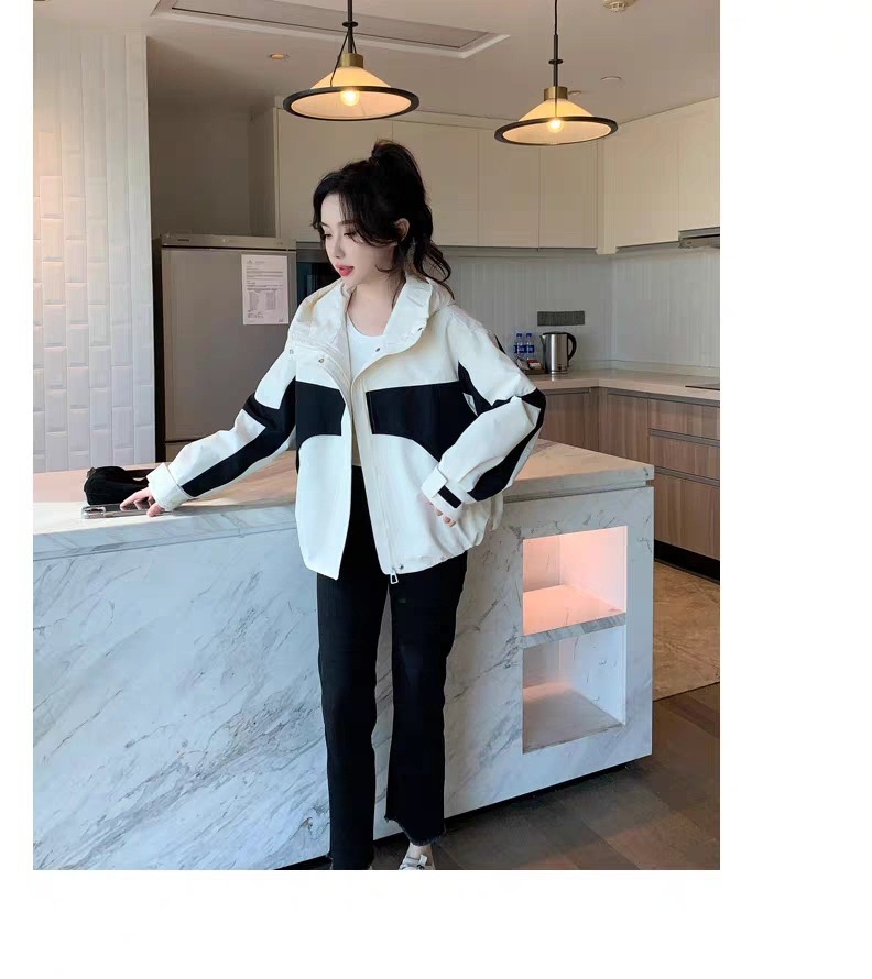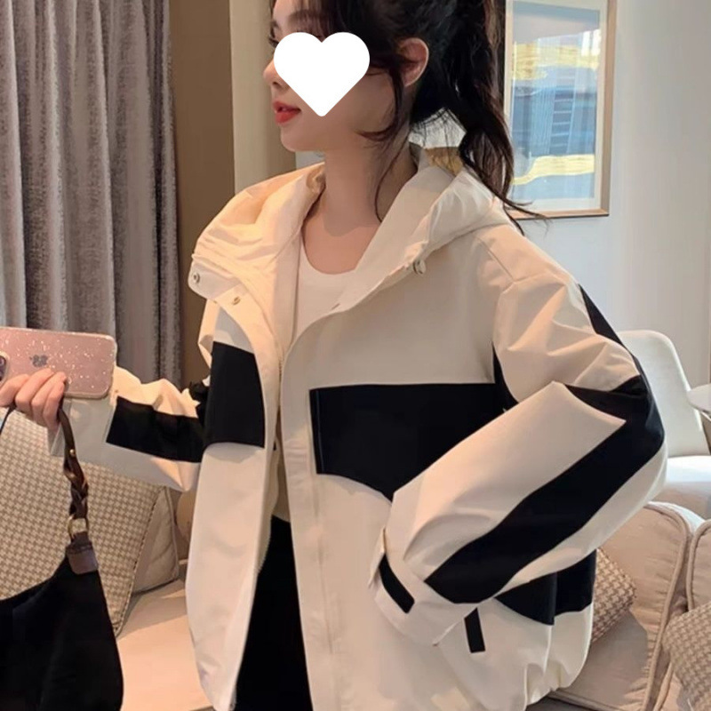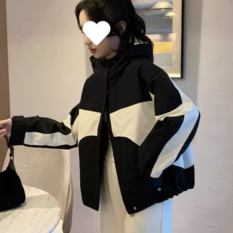 2024 봄과 가을 새로운 한국 스타일 블랙 컬러 블록 후드 재킷 코트 여성의 짧은 캐주얼 재킷 탑 트렌디스토어 가기
