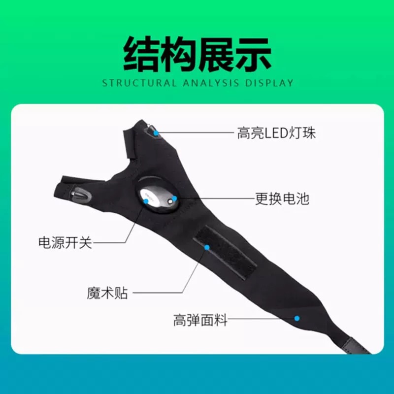 夜光手套,亮度好,在夜晚相当于一个手电,直接佩戴在手上,只需使用2颗CR2016纽扣电池,可以持续用14小时左右,小巧轻便,使用简单,充分解放双手,是户外照明好帮手。