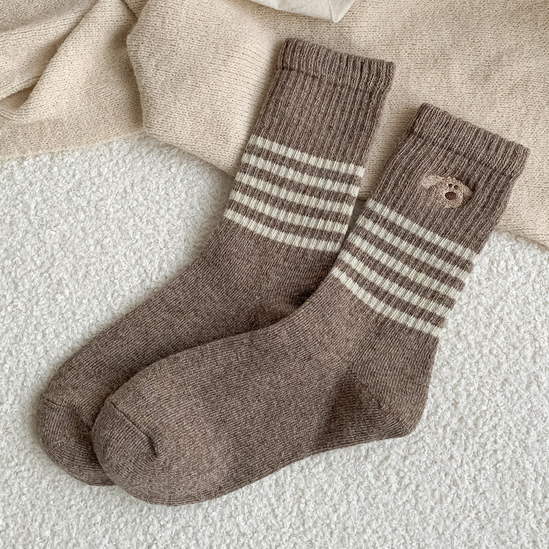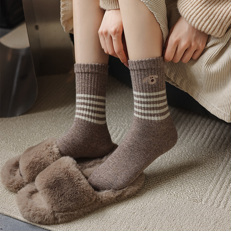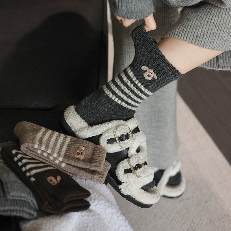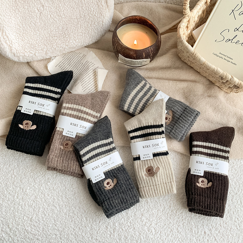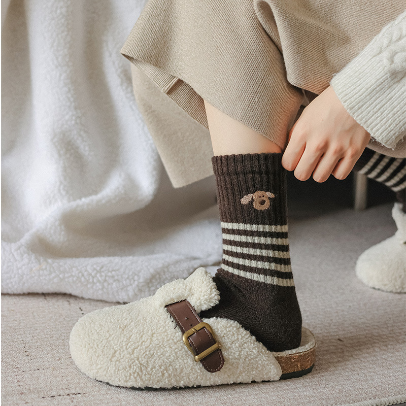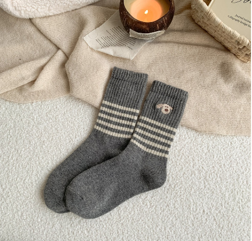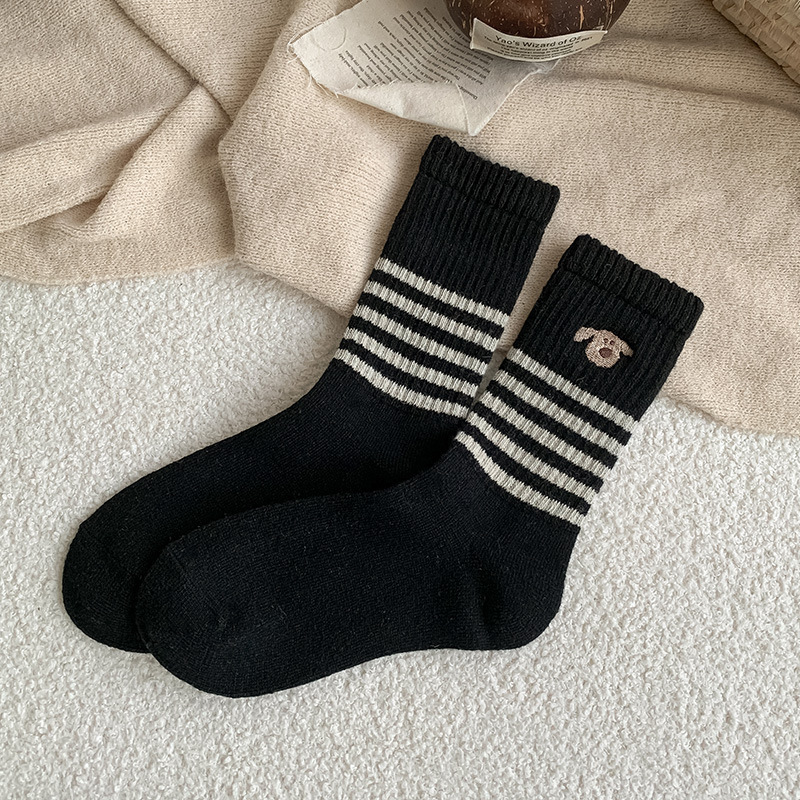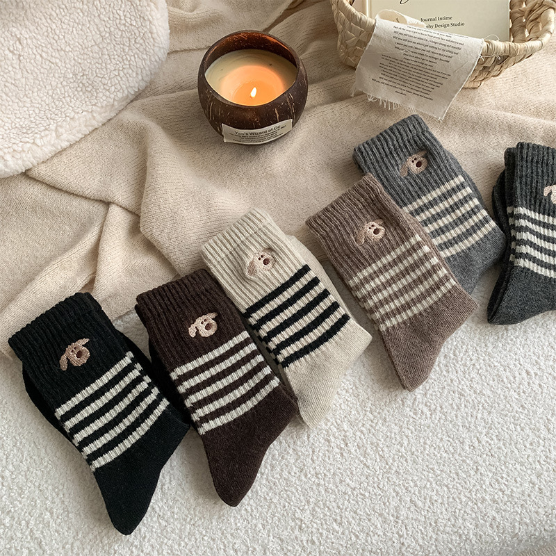 귀여운 강아지 자수 양모 양말 여성의 가을 겨울 두꺼운 따뜻한 중간 길이 양말 한국 아카데미 스타일 줄무늬 스택 양말