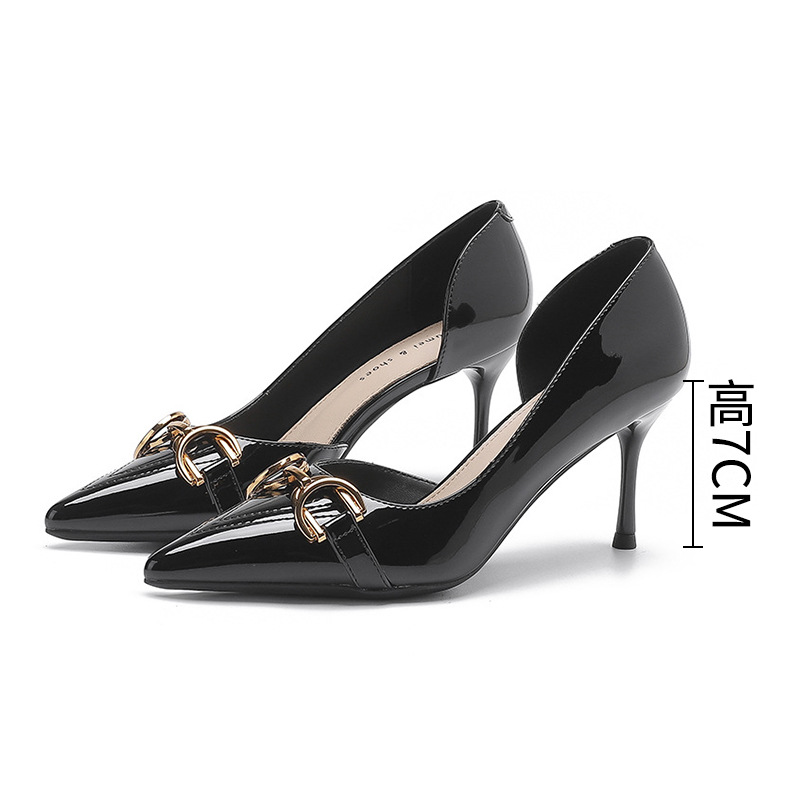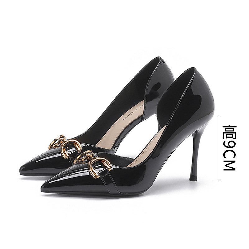 966-8C Baotou 사이드 빈 샌들 여성용 뾰족한 스틸레토 힐 여성 싱글 버튼 메탈 버클 전문 통근화스토어 가기