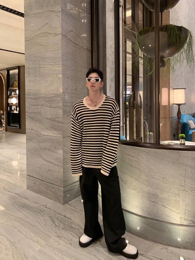 가을 빈티지 크로 셰 뜨개질 스트라이프 빈 스웨터 긴팔 남성 디자인 센스 게으른 스타일 캐주얼베이스 셔츠 탑
