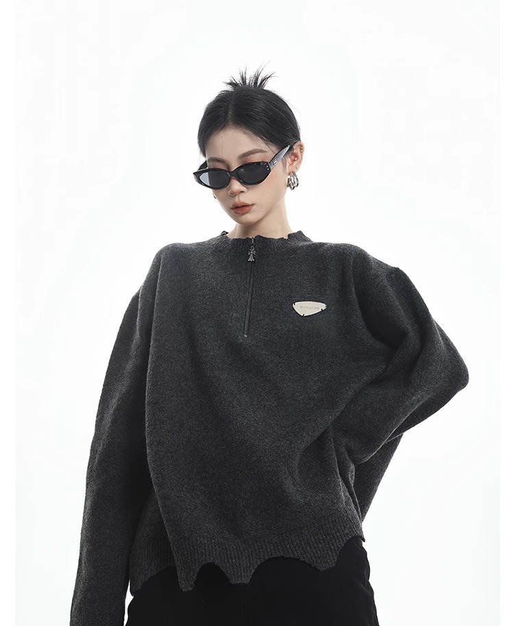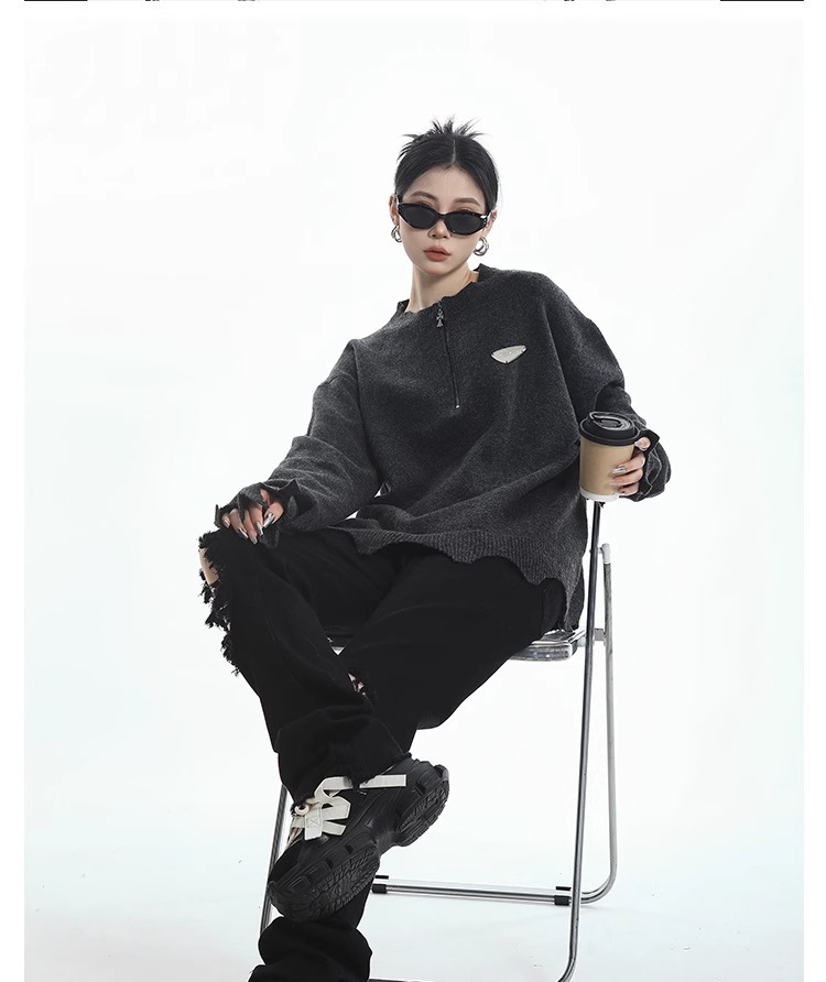 2024 년 가을과 겨울 새로운 미국 스타일의 하이 스트리트 하프 지퍼 파괴 스웨터 세탁 풀오버 루즈 니트 긴팔 최고 트렌디