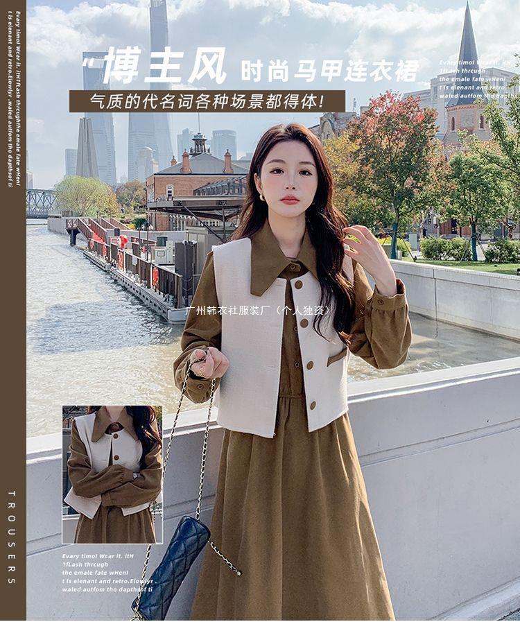 올해 인기있는 원피스 세트 여성의 가을 2024 새로운 긴 소매 Maillard는 조끼 셔츠 스커트 투피스 세트를 착용합니다.스토어 가기