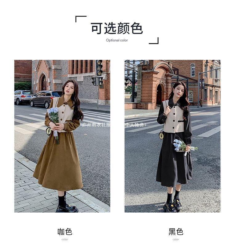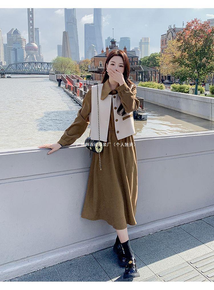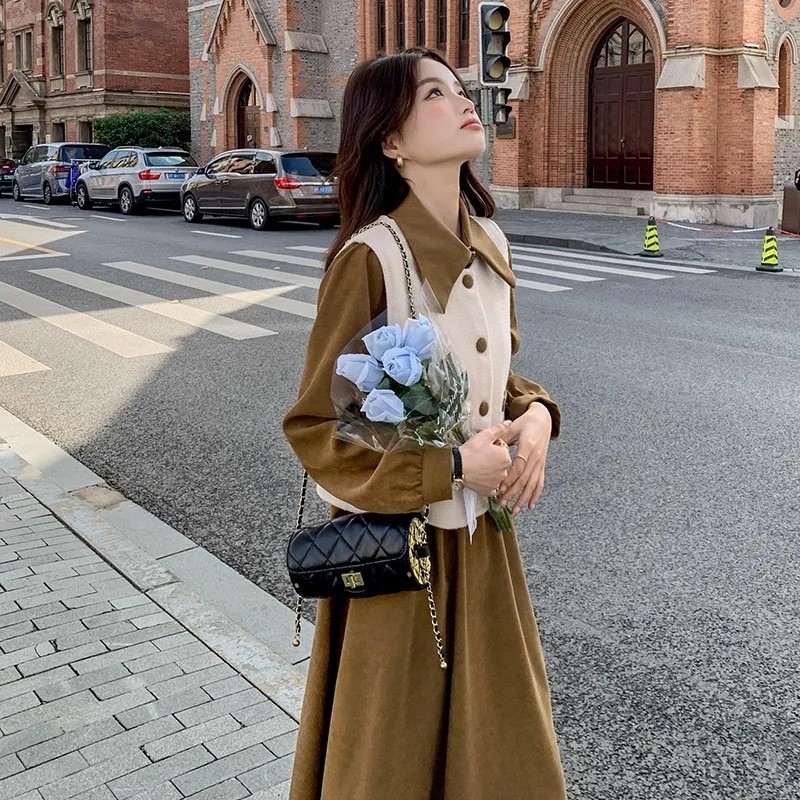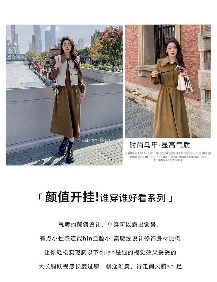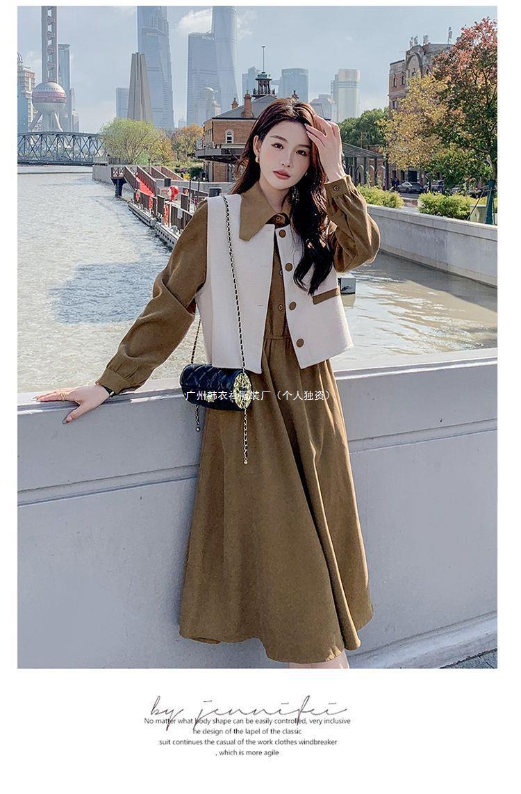 올해 인기있는 원피스 세트 여성의 가을 2024 새로운 긴 소매 Maillard는 조끼 셔츠 스커트 투피스 세트를 착용합니다.