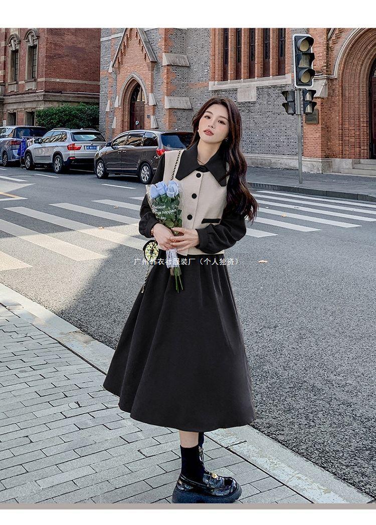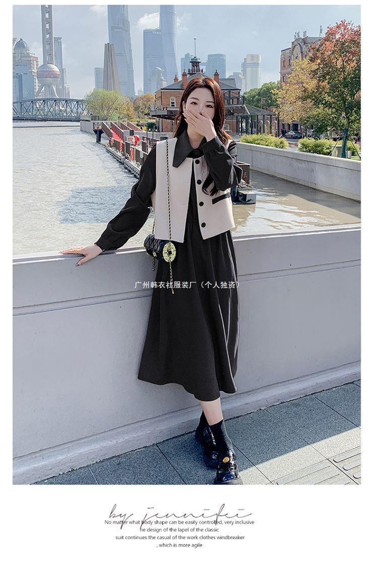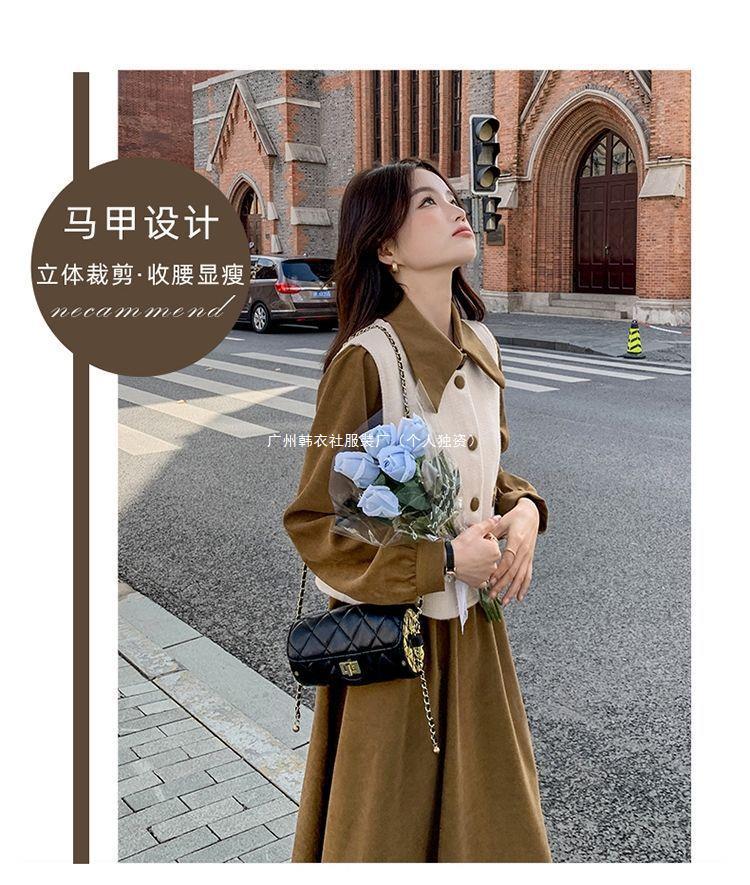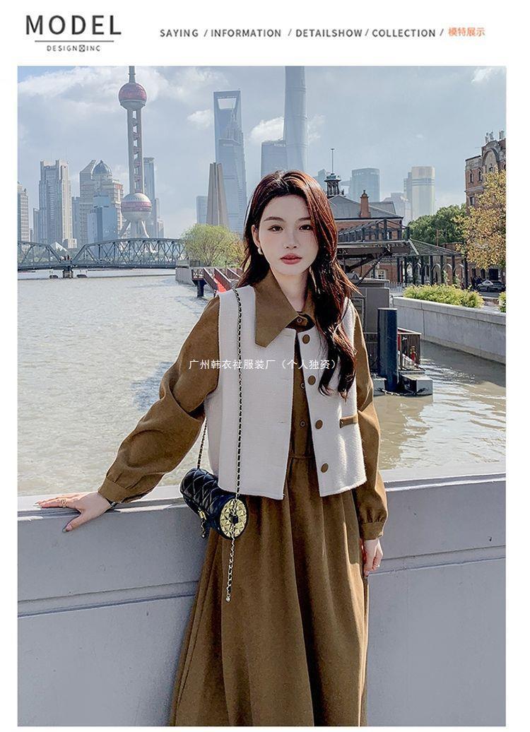 올해 인기있는 원피스 세트 여성의 가을 2024 새로운 긴 소매 Maillard는 조끼 셔츠 스커트 투피스 세트를 착용합니다.