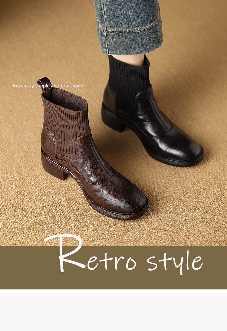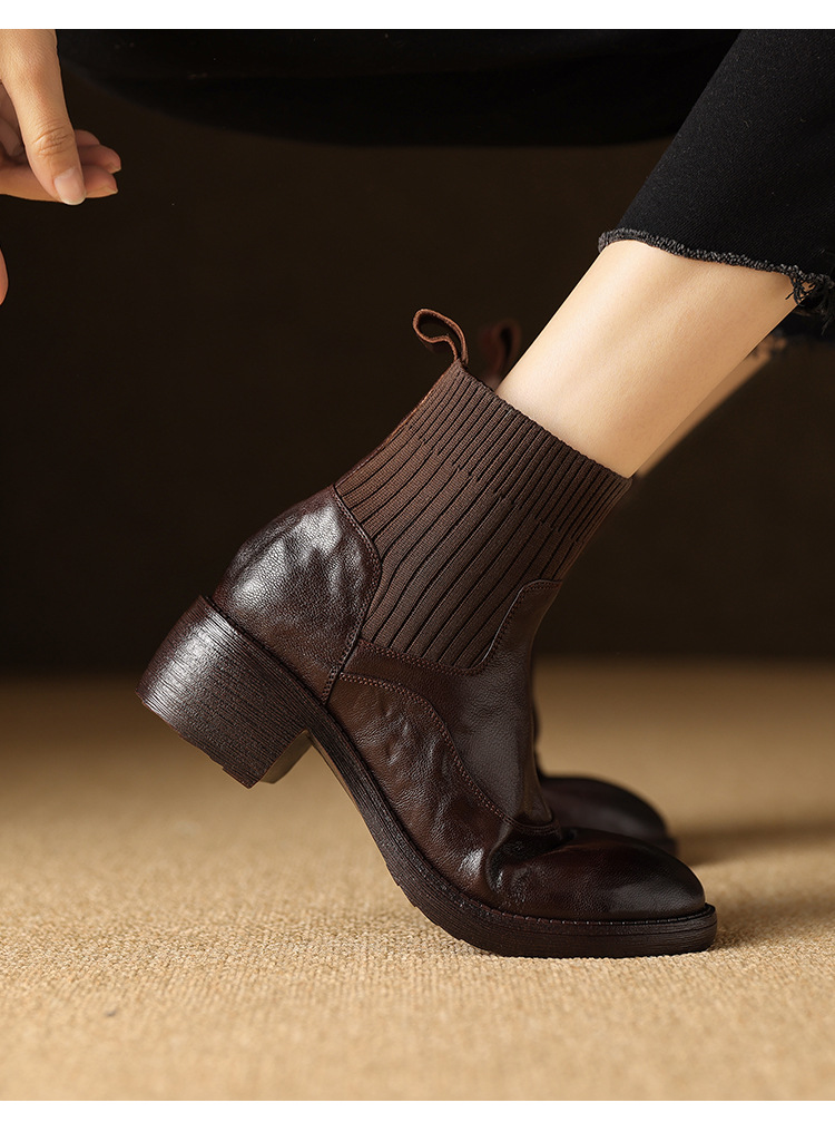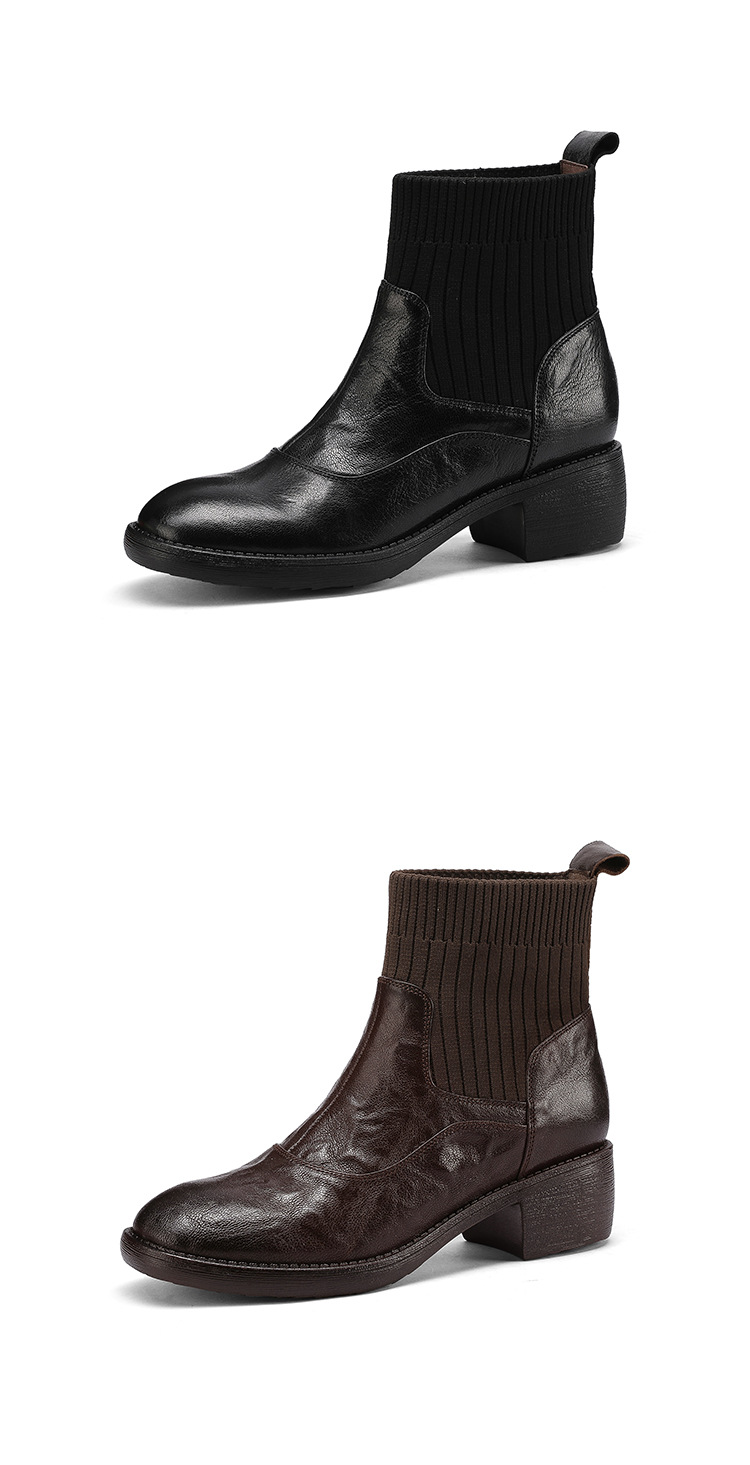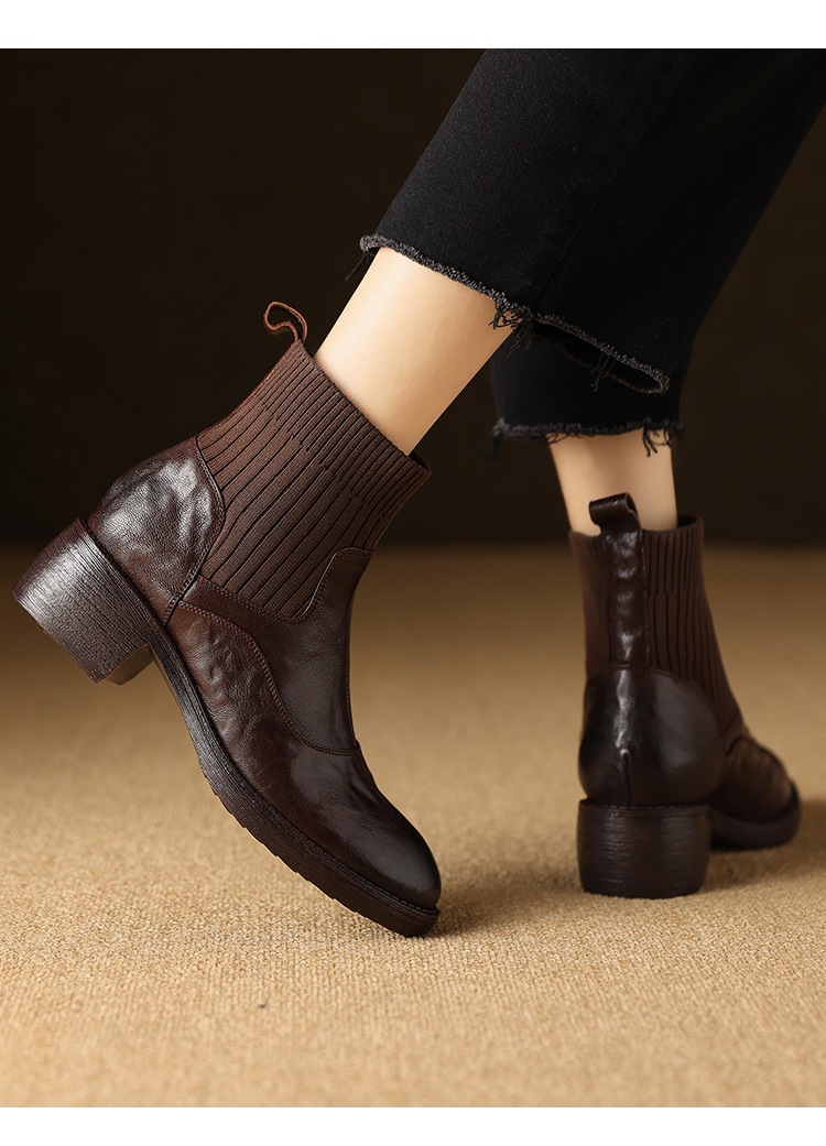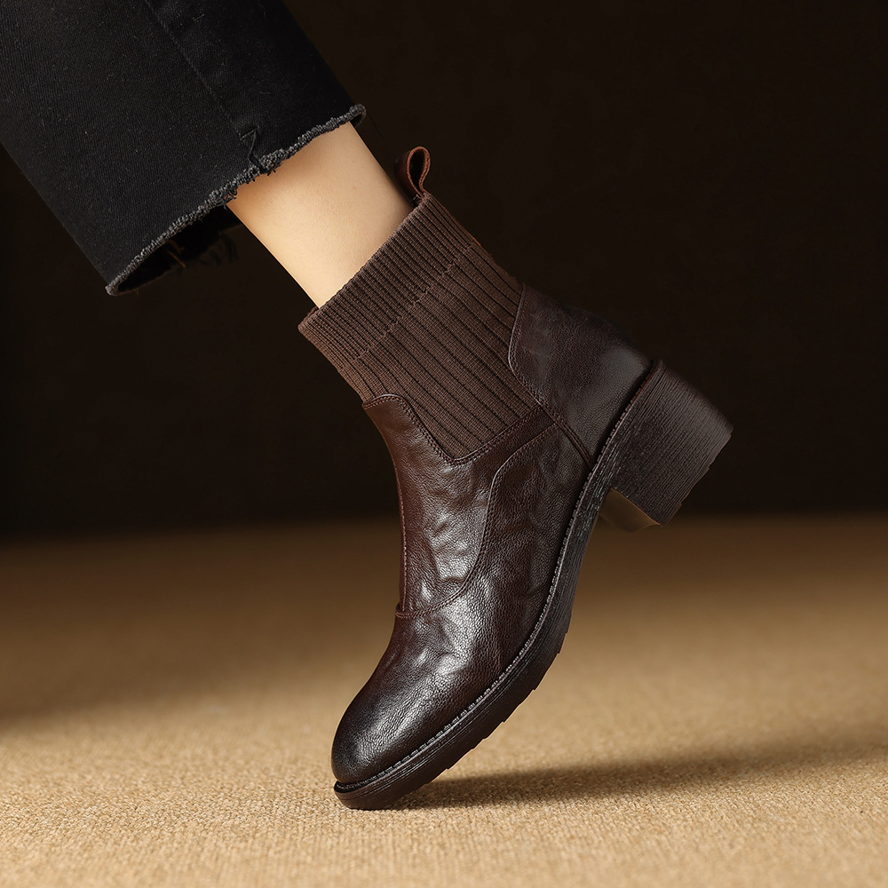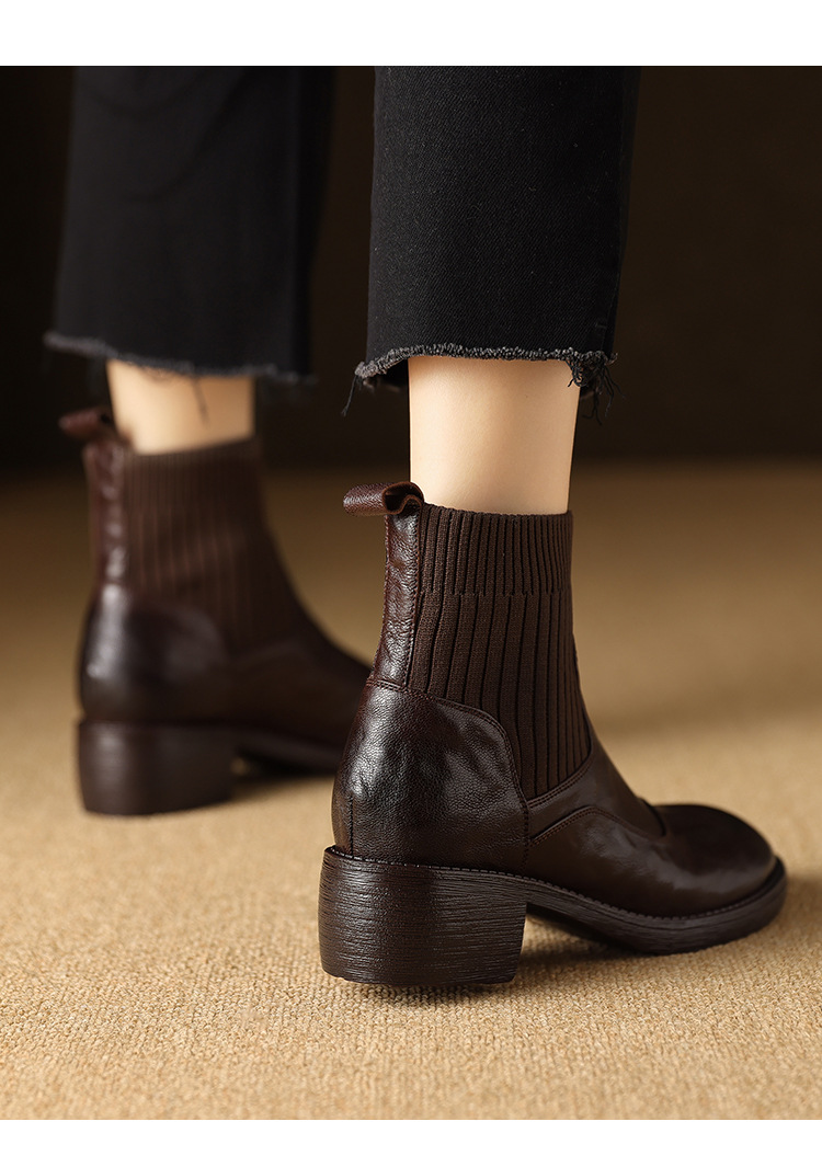 2024 가을 및 겨울 새로운 라운드 발가락 마틴 부츠 여자 미드 힐 쇼트 부츠 두꺼운 힐 니트 울 부츠 다크 브라운 양털 부츠
