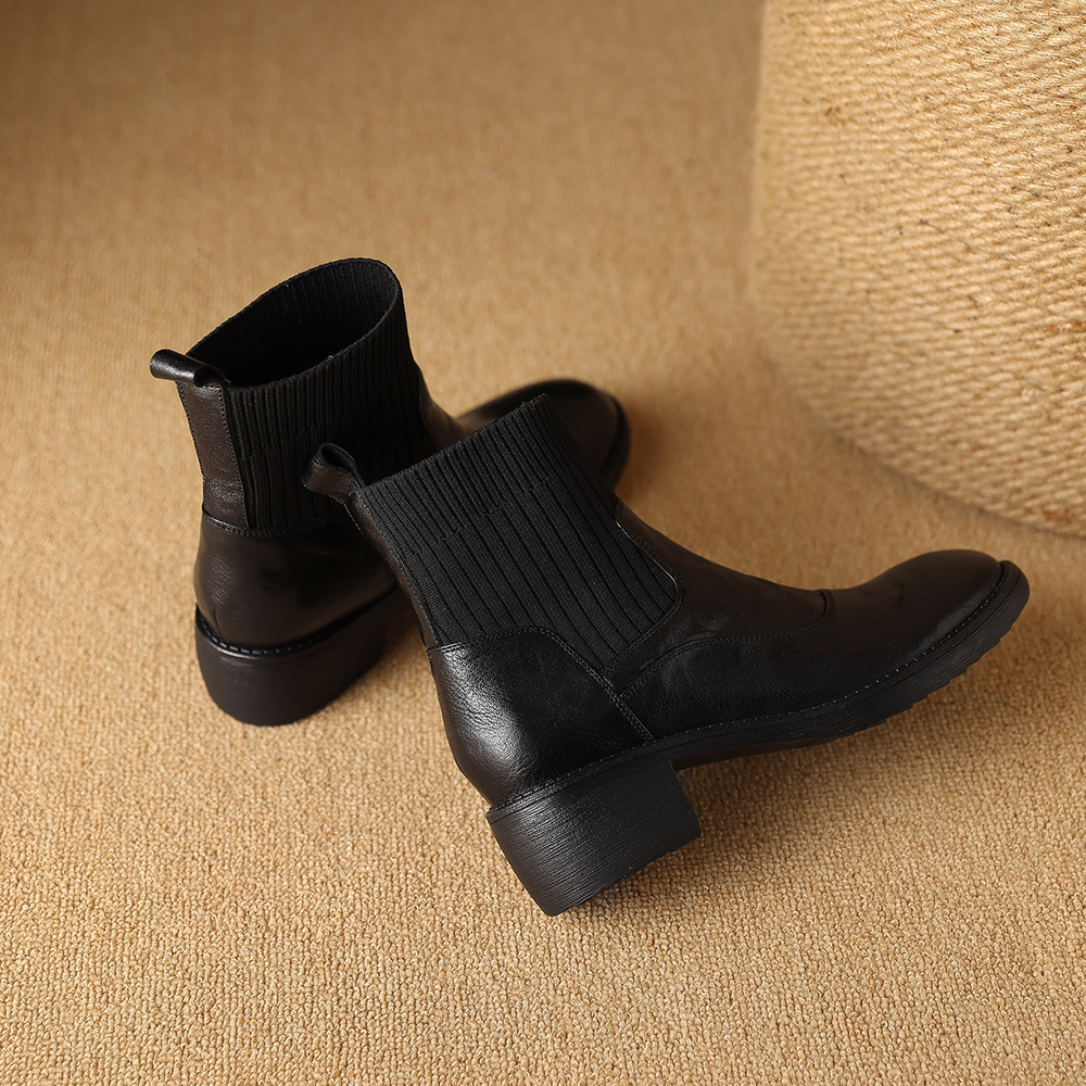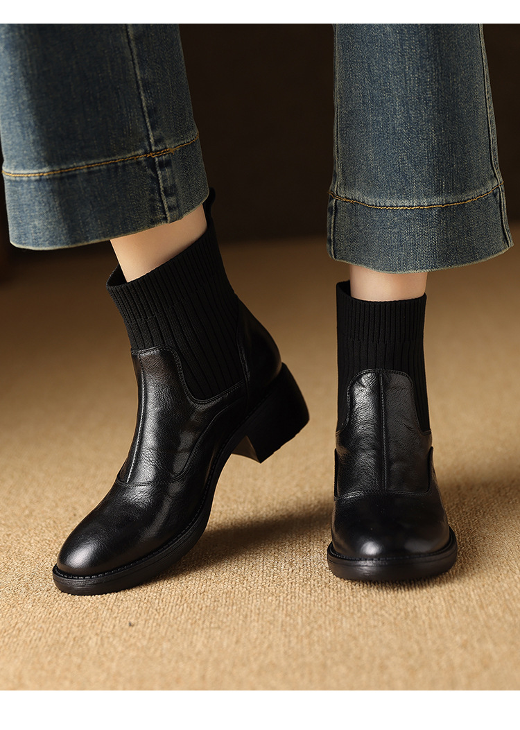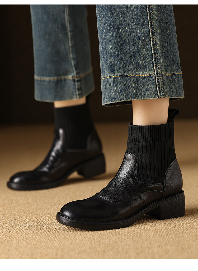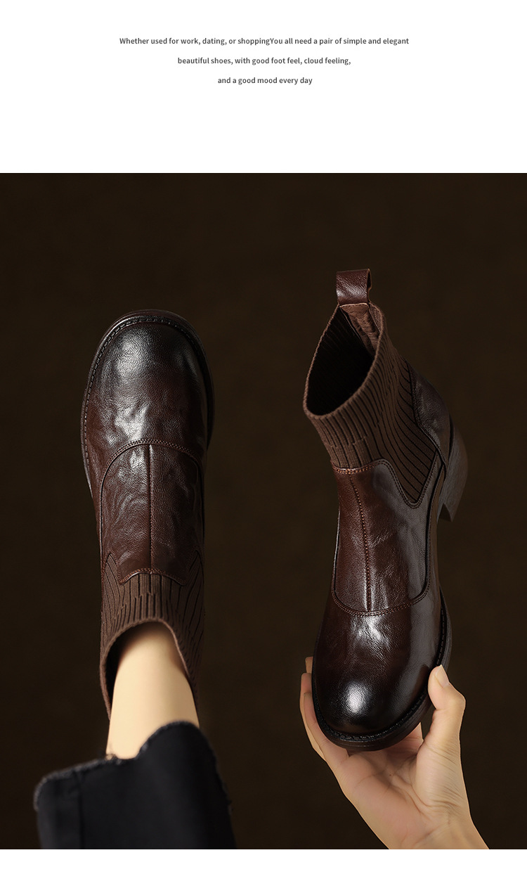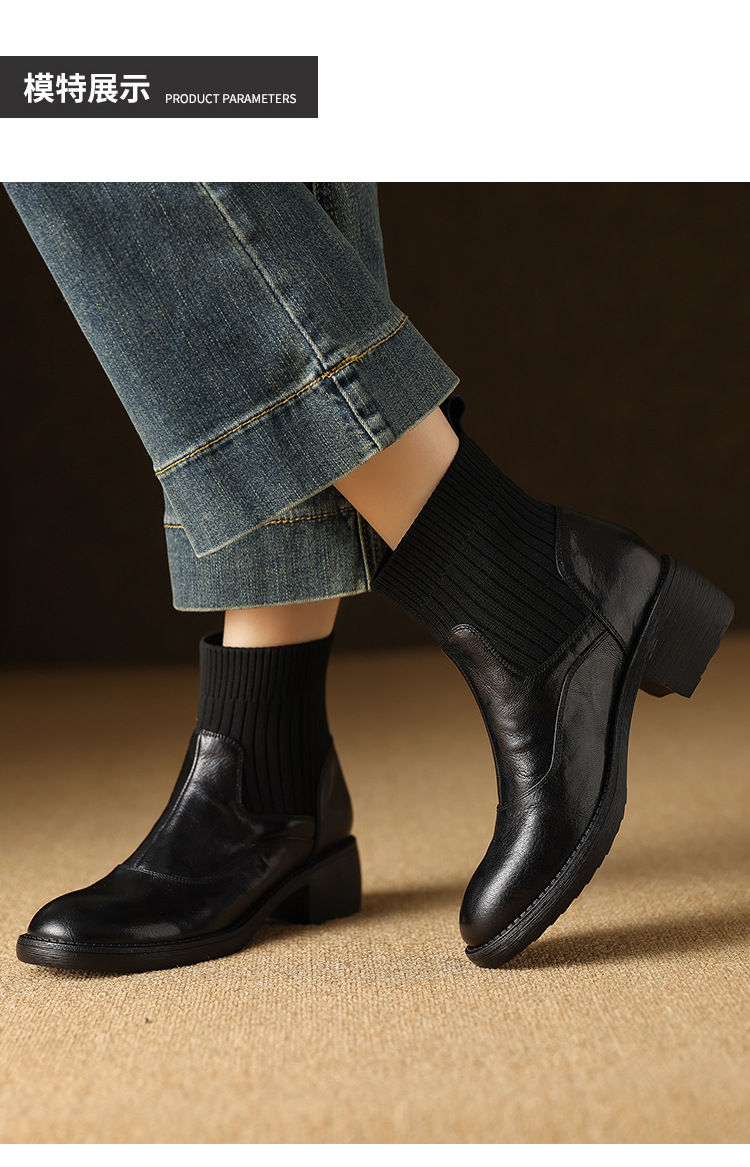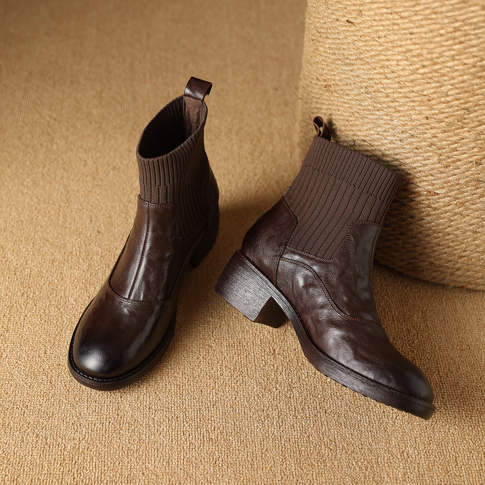 2024 가을 및 겨울 새로운 라운드 발가락 마틴 부츠 여자 미드 힐 쇼트 부츠 두꺼운 힐 니트 울 부츠 다크 브라운 양털 부츠