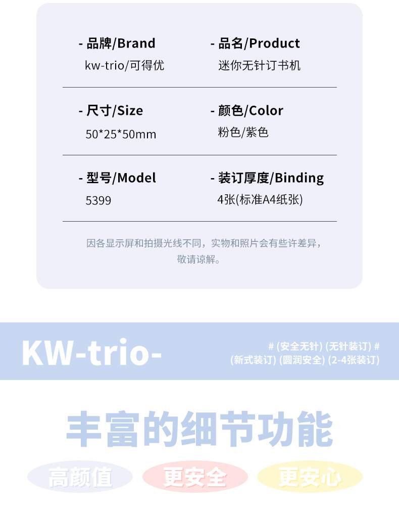 KW-TRIO 5399 스테이플러 바늘없는 스테이플러 안전 노동 절약 어린이 학생 스테이플러