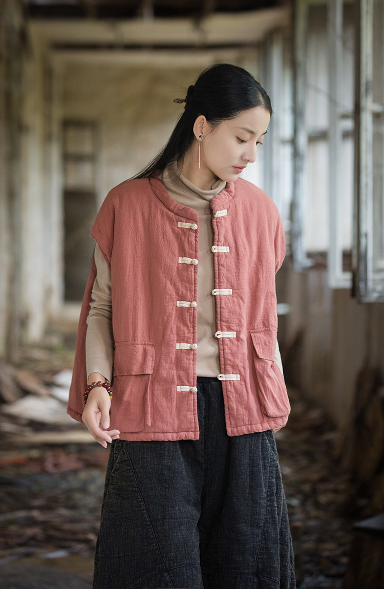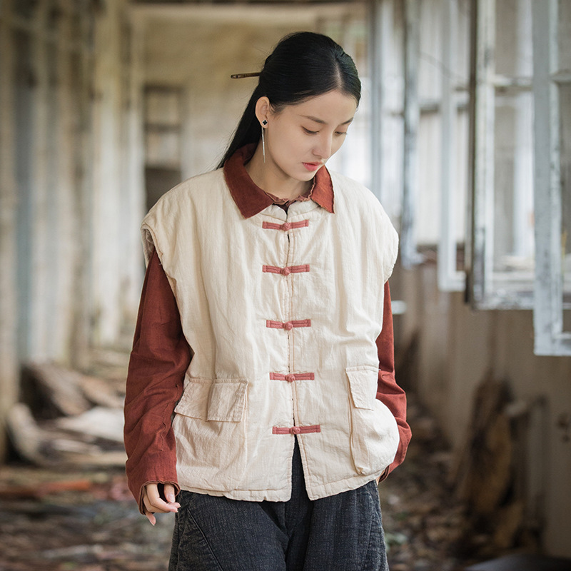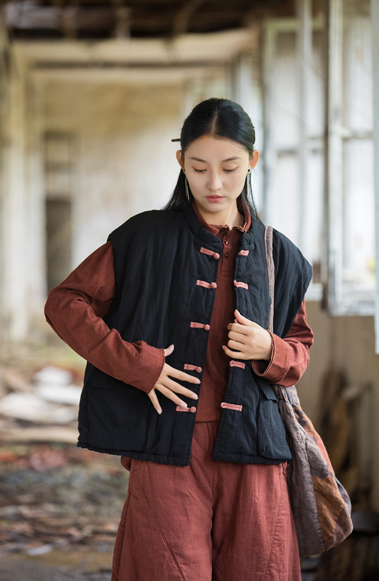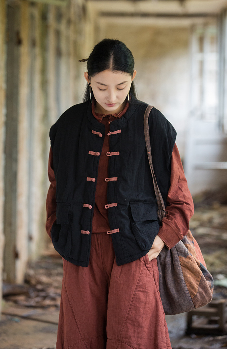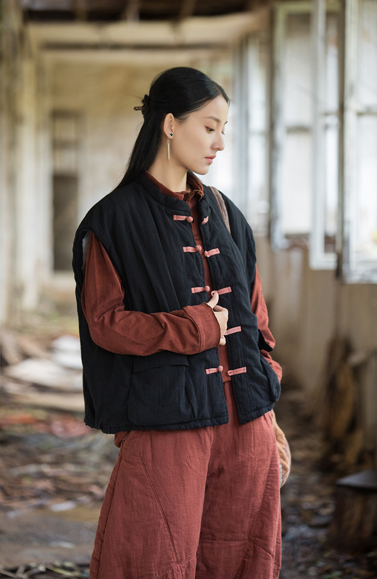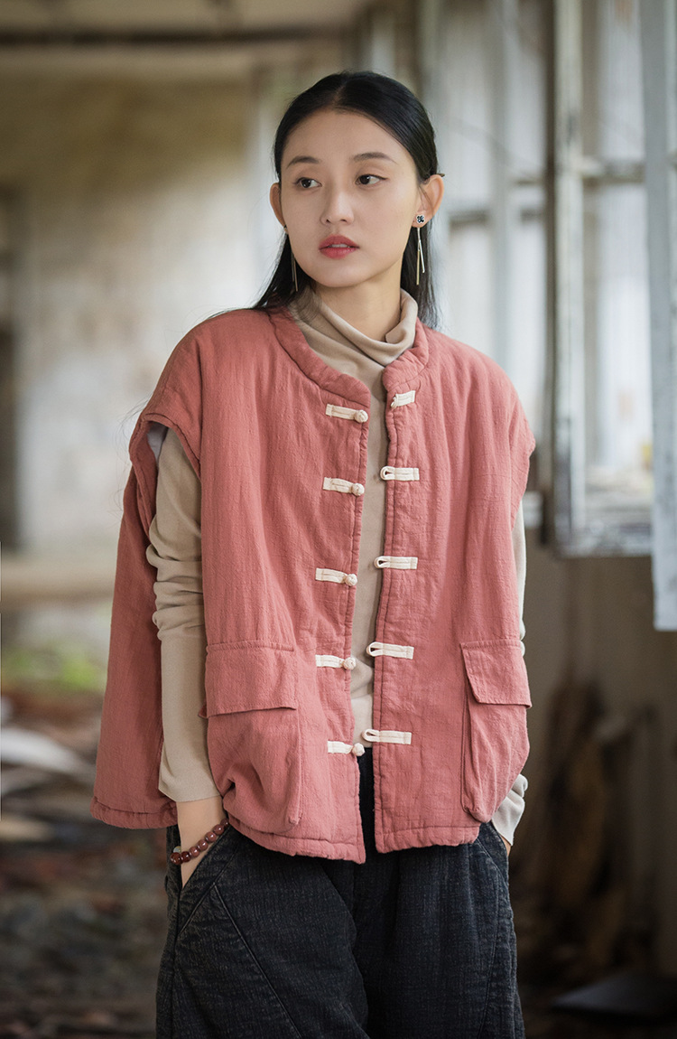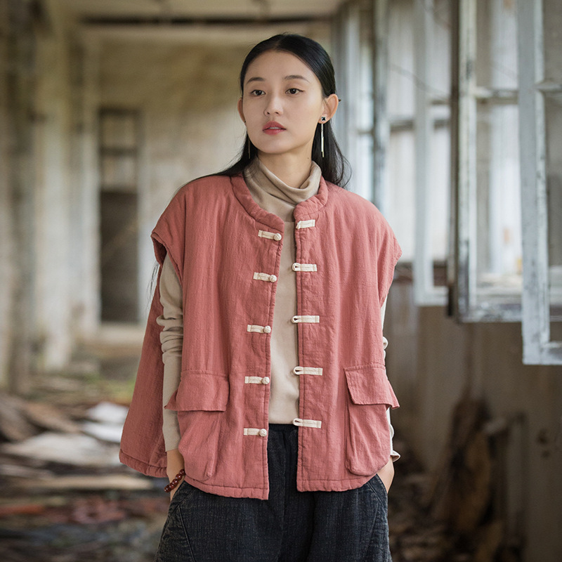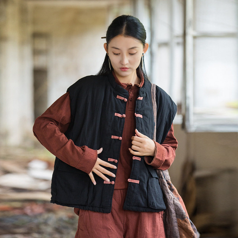 25 겨울 여성복 신상 오리지널 개량형 신중국풍 누빔 면조끼 문예 감성 단추 여성용 면조끼스토어 가기