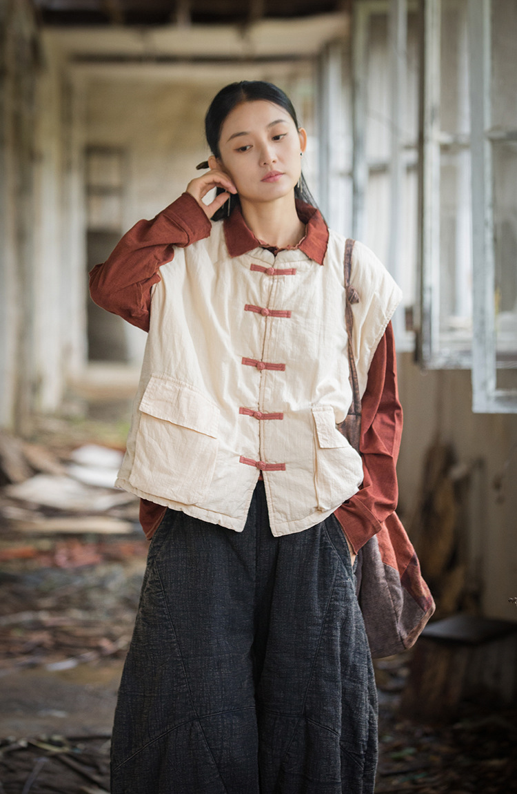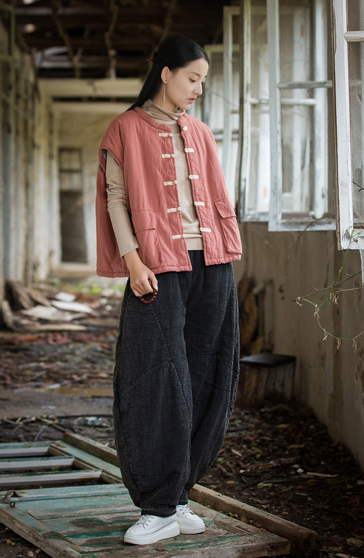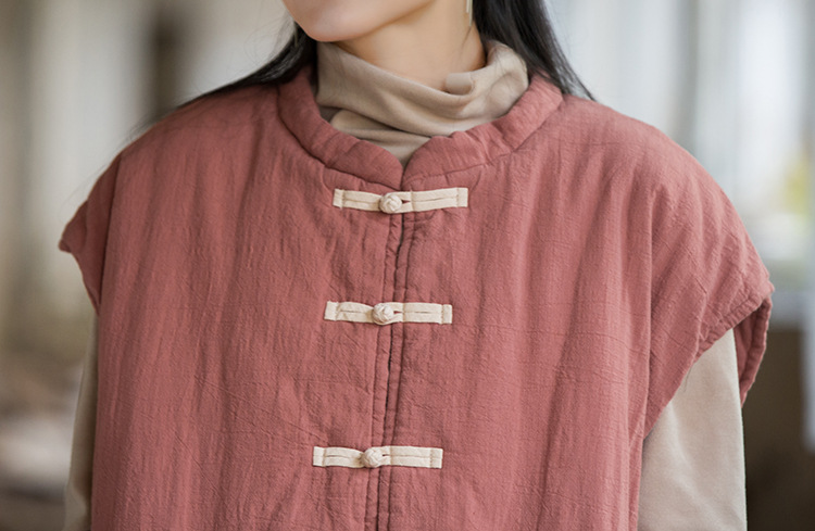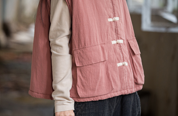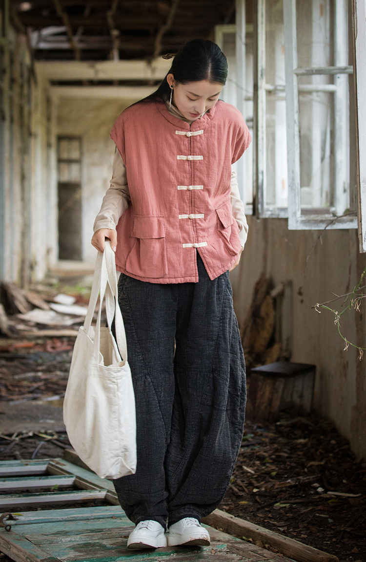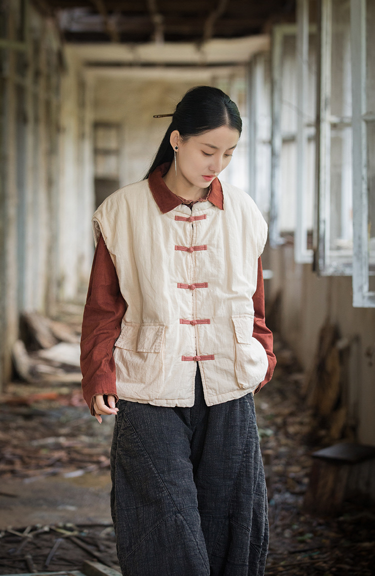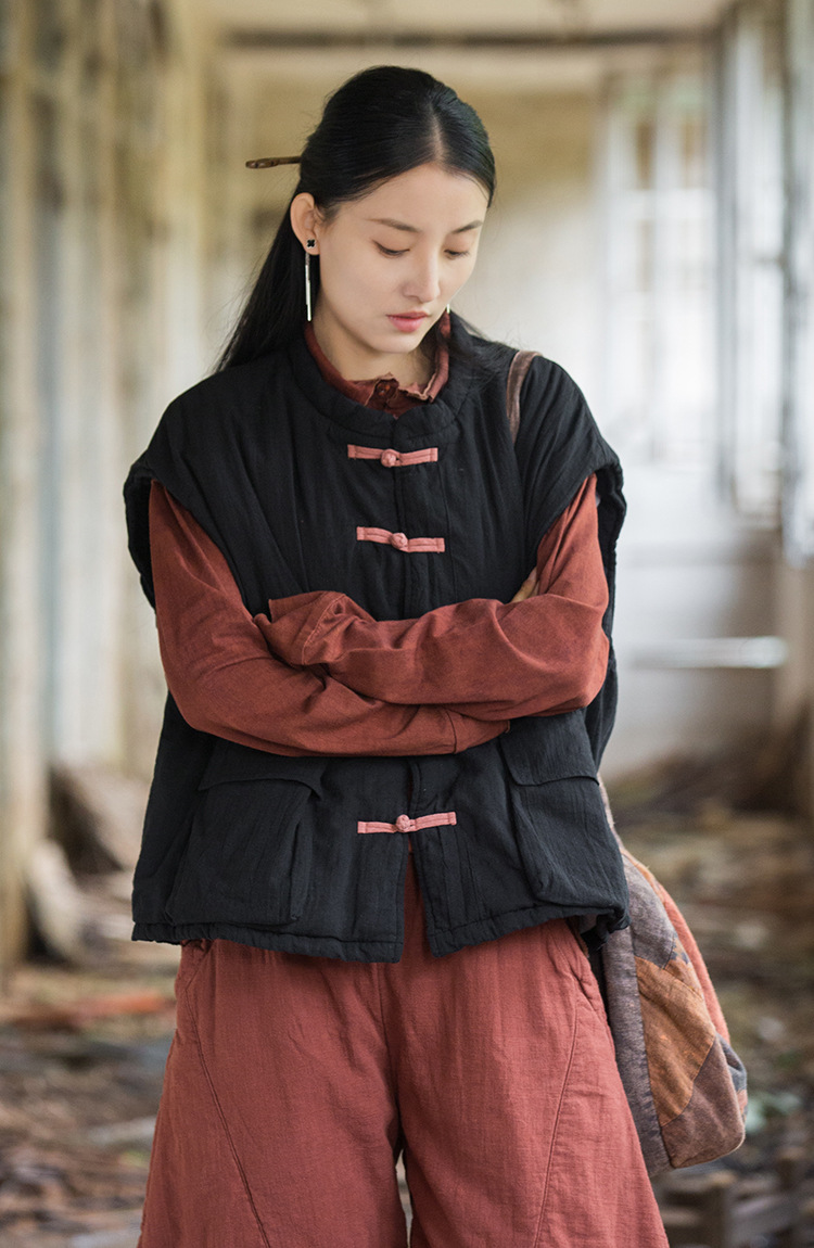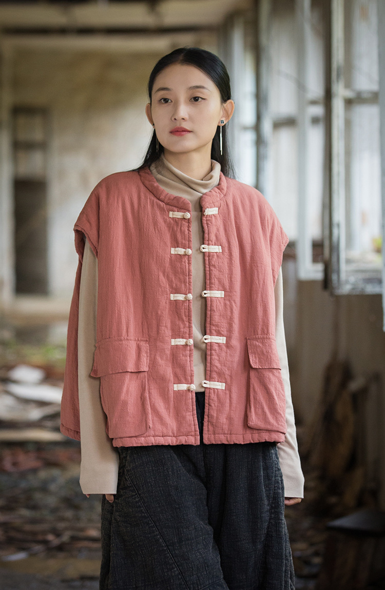 25 겨울 여성복 신상 오리지널 개량형 신중국풍 누빔 면조끼 문예 감성 단추 여성용 면조끼스토어 가기
