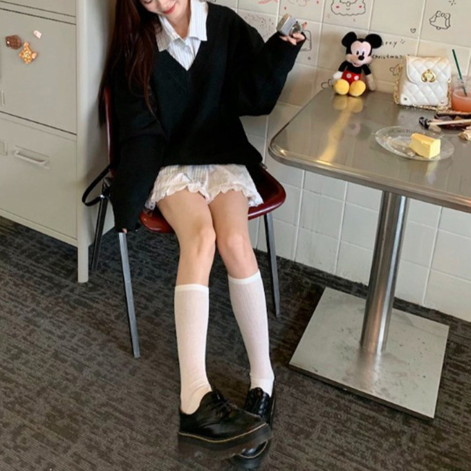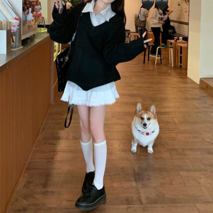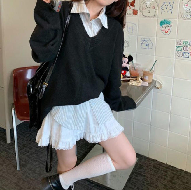 대학 스타일의 나이를 줄이는 세트 여성의 아름다운 스웨터 줄무늬 셔츠 탑 A 자형 스커트 3 피스 세트 패션 세트스토어 가기