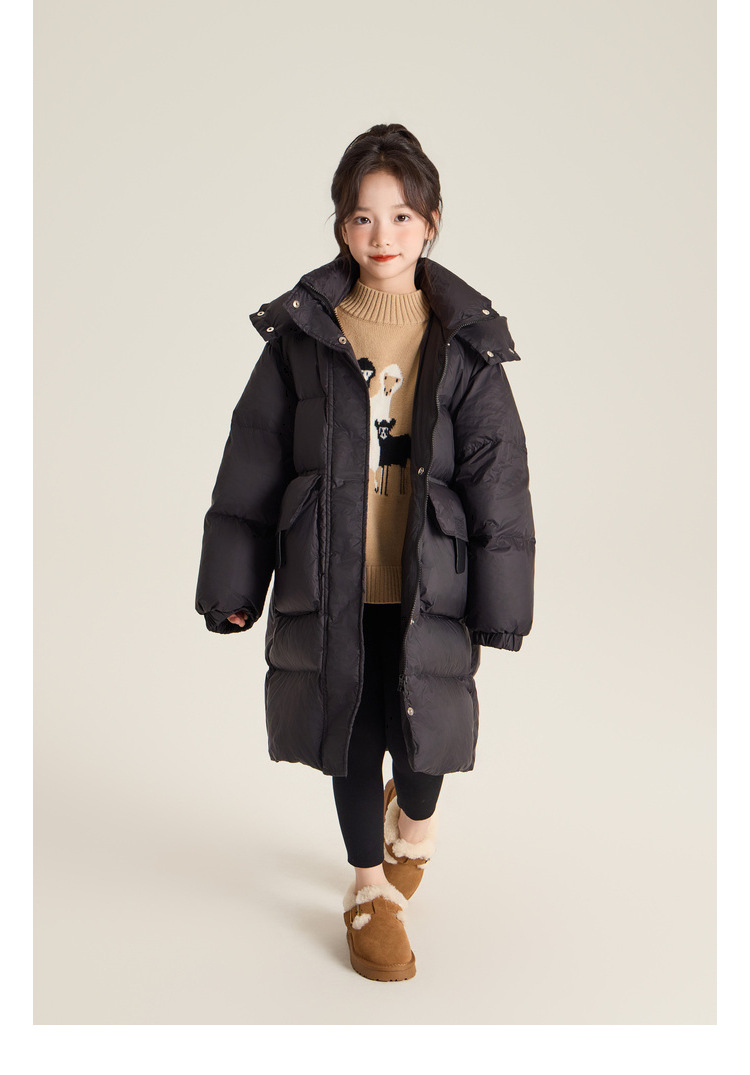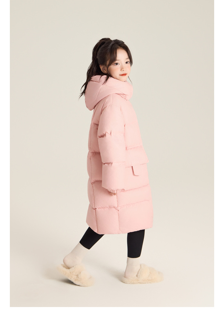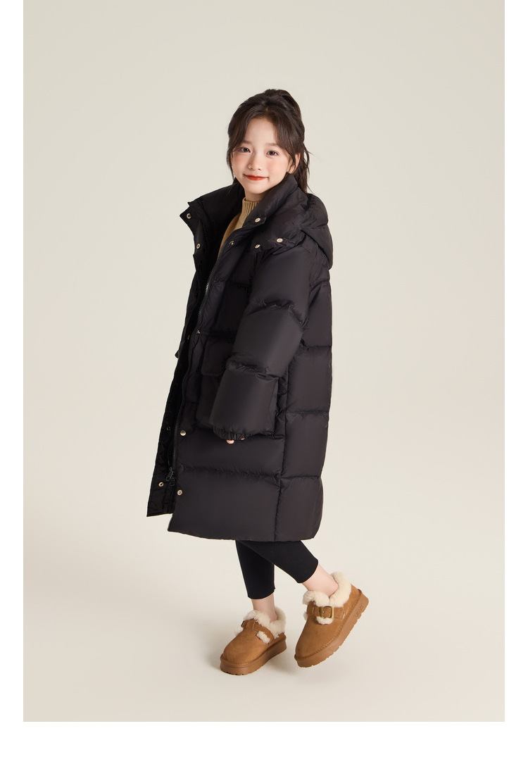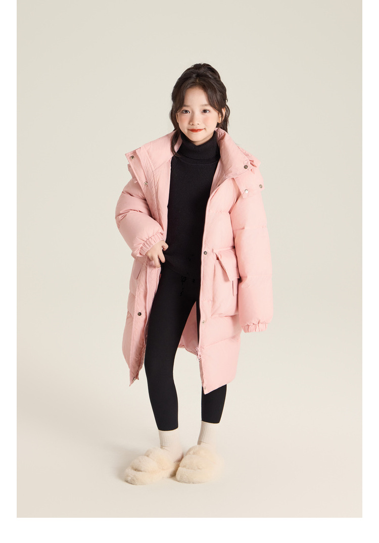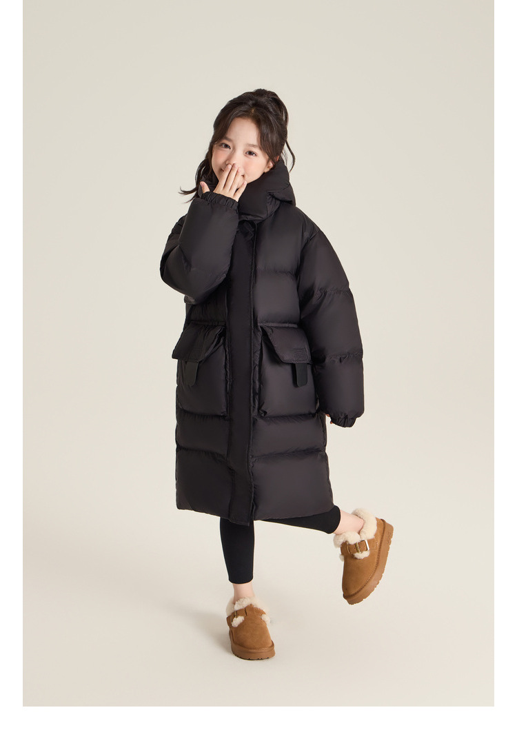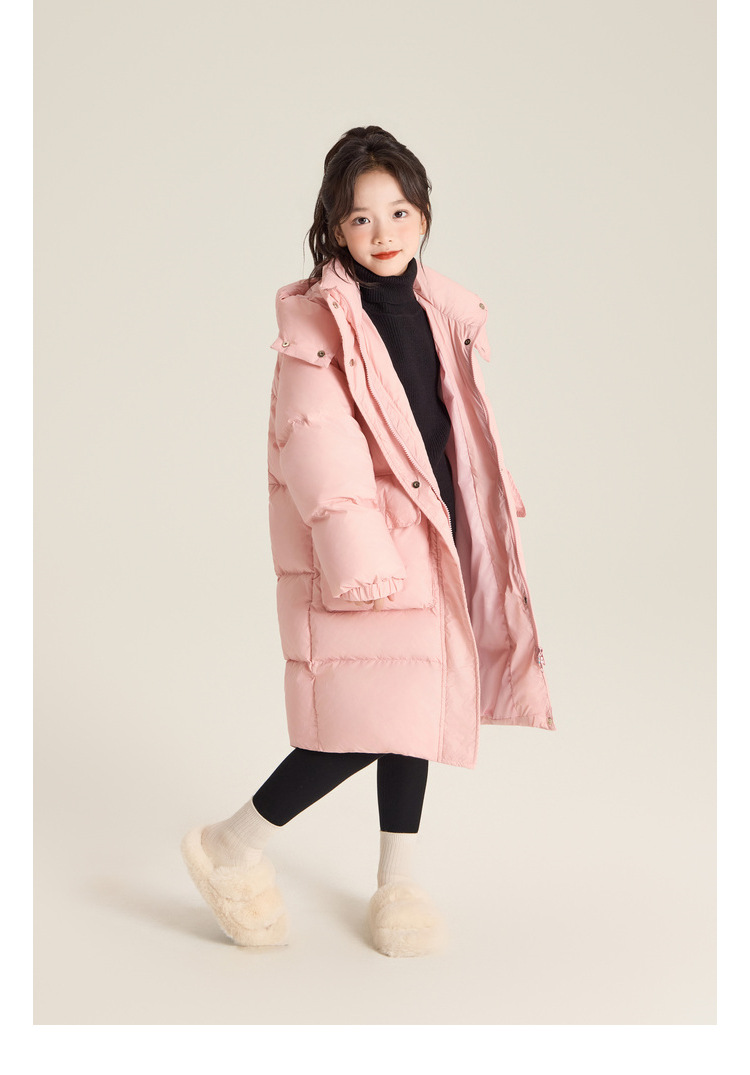 Amybaby 소녀 다운 재킷 겨울 2024 새로운 한국 부드러운 단색 후드 캐주얼 롱 다운 재킷스토어 가기