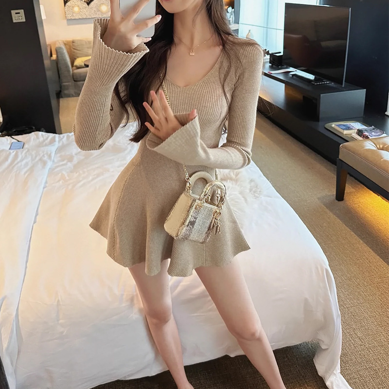 히비스커스 초가을 긴팔 허리 V 넥 니트 원피스 여성용 슬림 슬리밍 우아한 내부 짧은 치마 스파이스 걸스 틈새