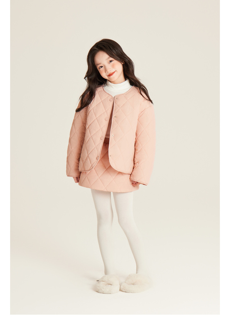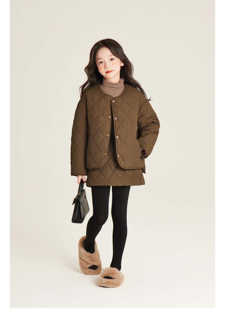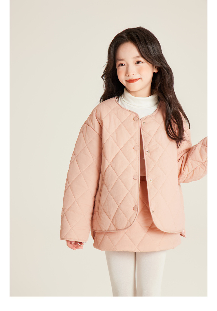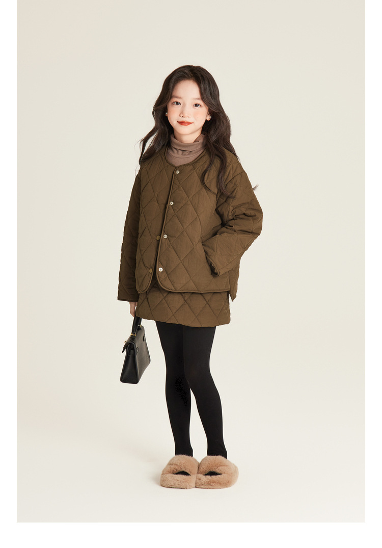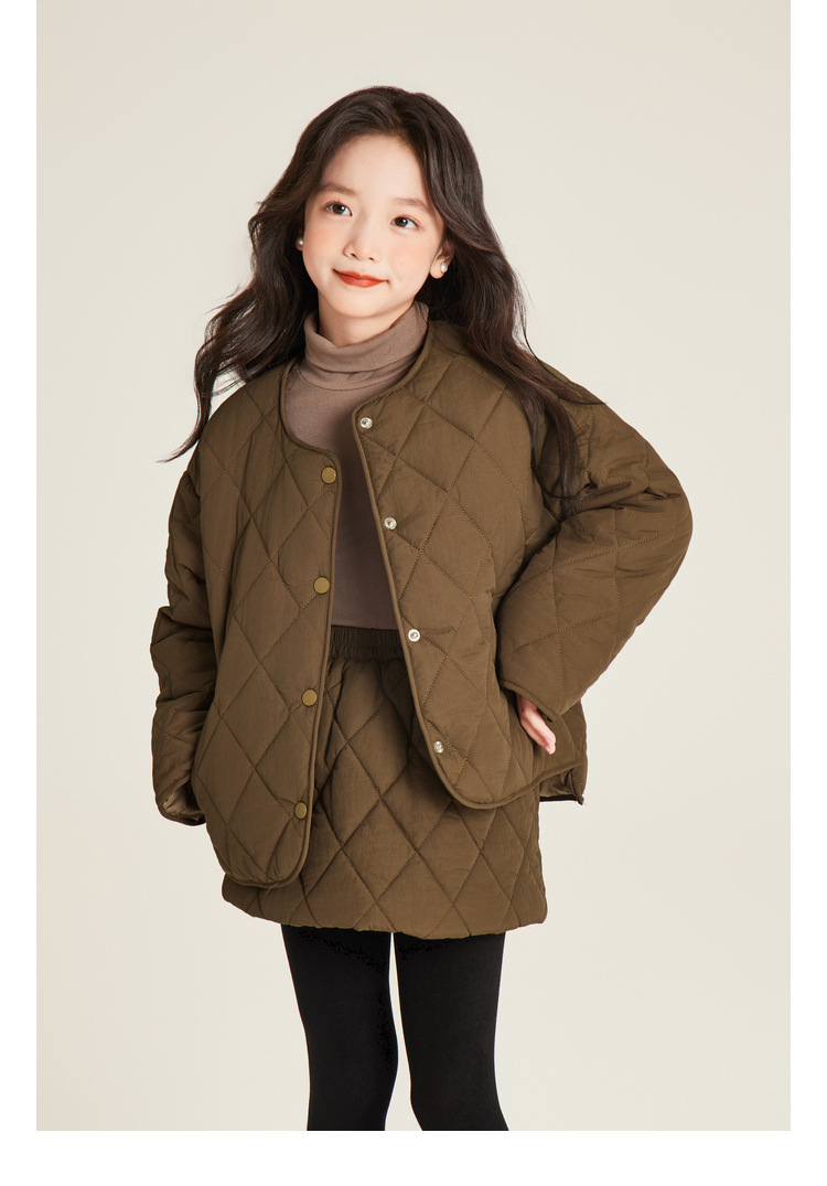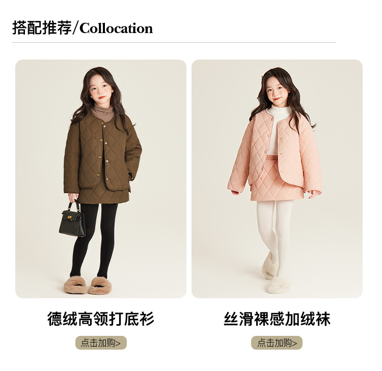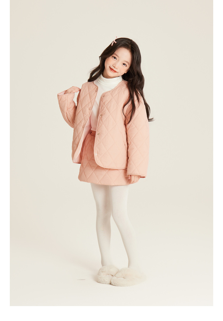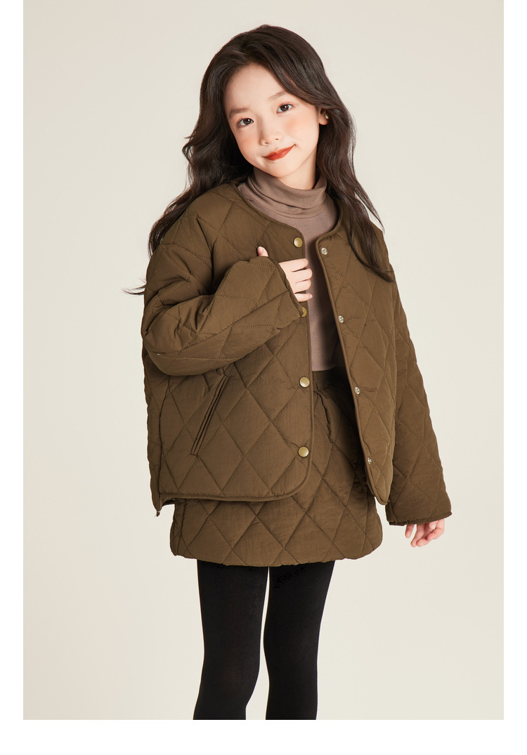 Amybaby 소녀 세트 겨울 2024 새로운 다이아몬드 체크 무늬 단색 둥근 목 따뜻한면 패딩 재킷 스커트스토어 가기