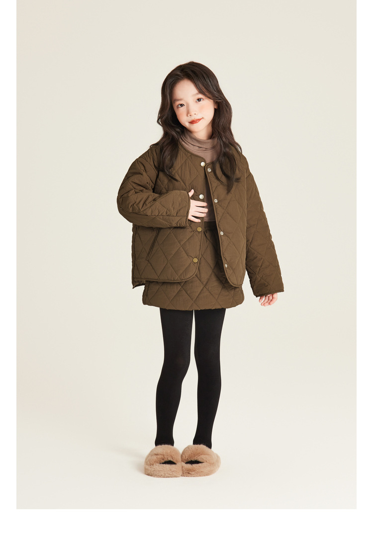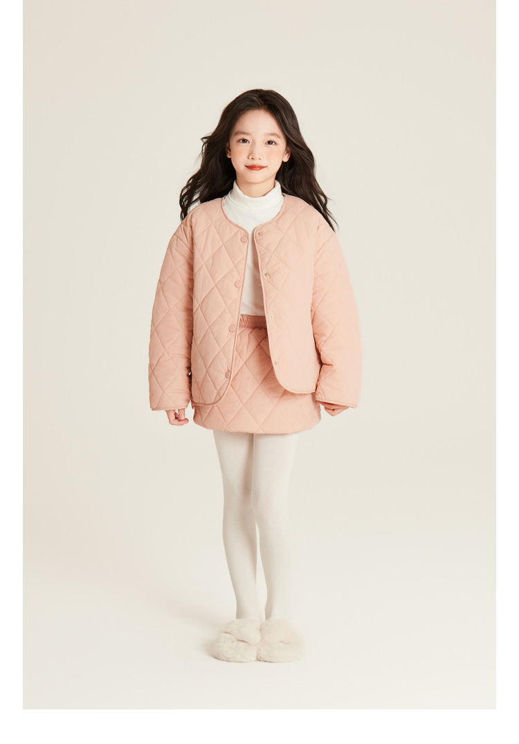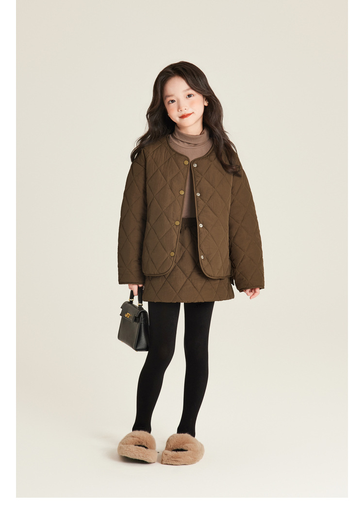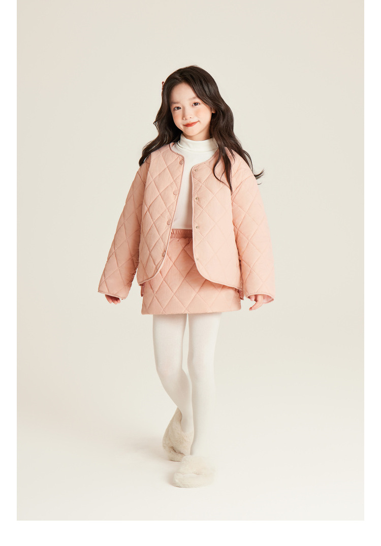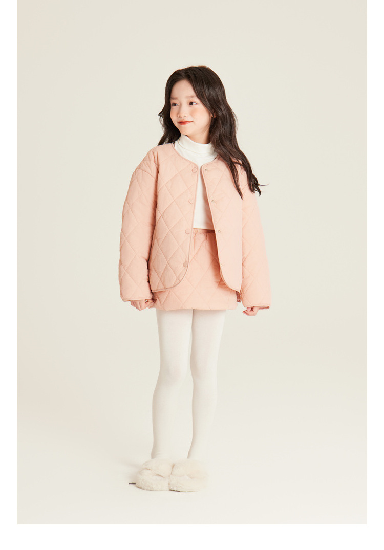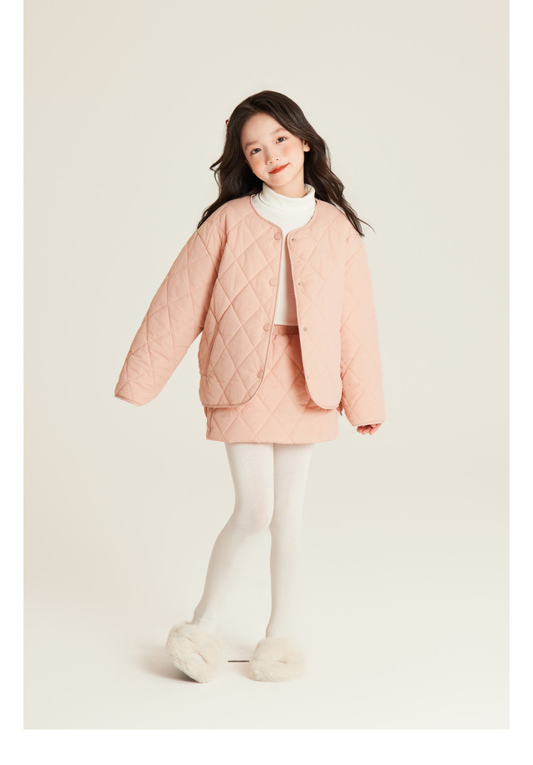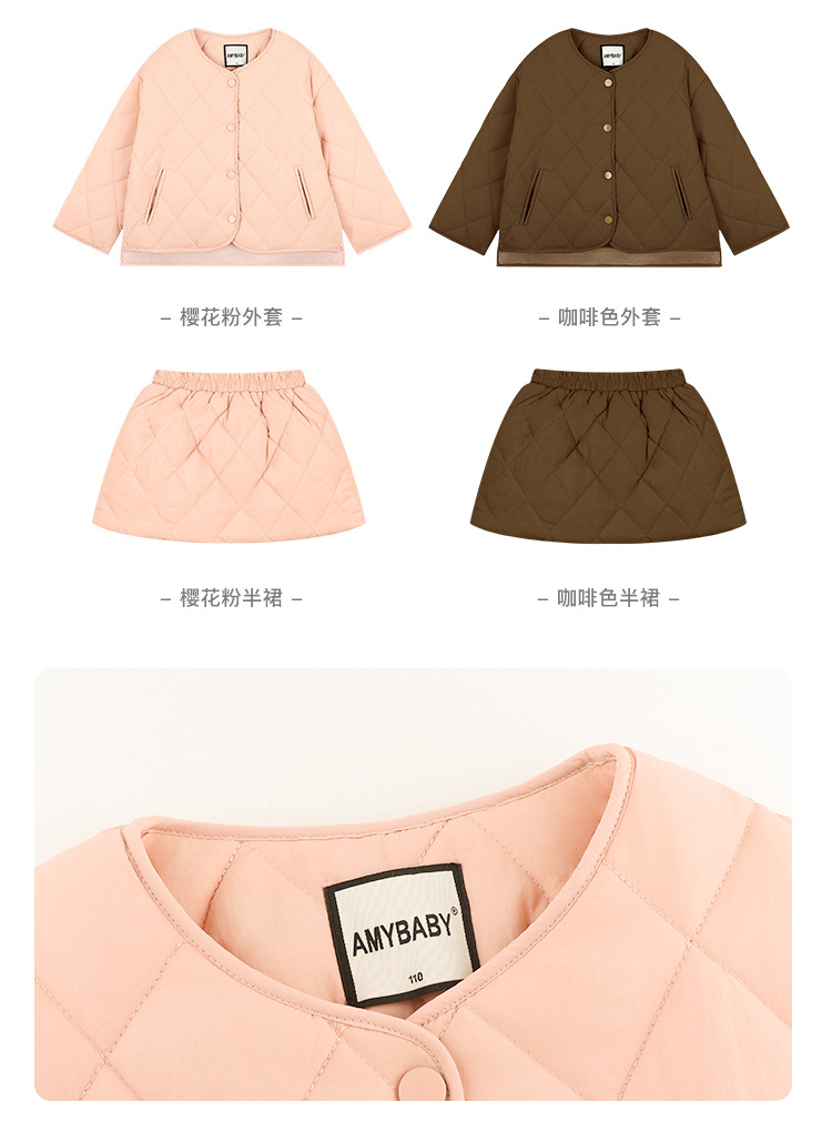 Amybaby 소녀 세트 겨울 2024 새로운 다이아몬드 체크 무늬 단색 둥근 목 따뜻한면 패딩 재킷 스커트스토어 가기