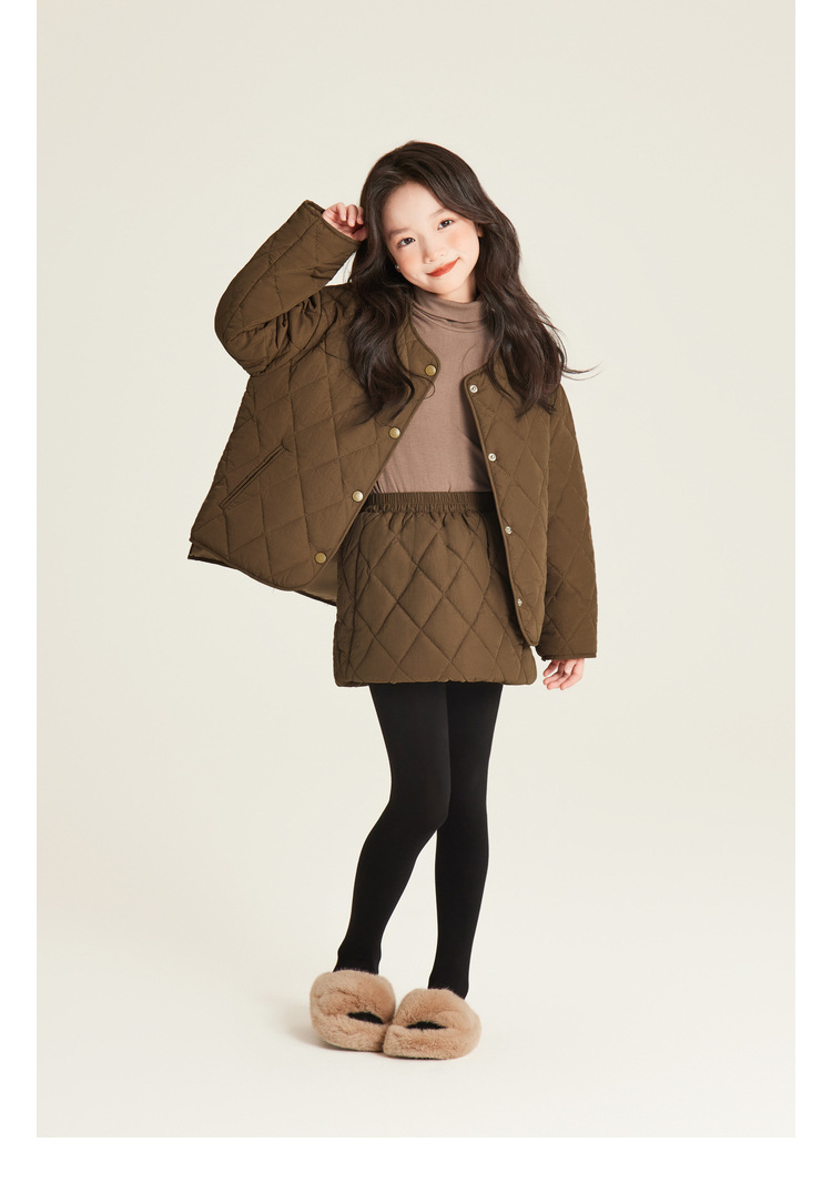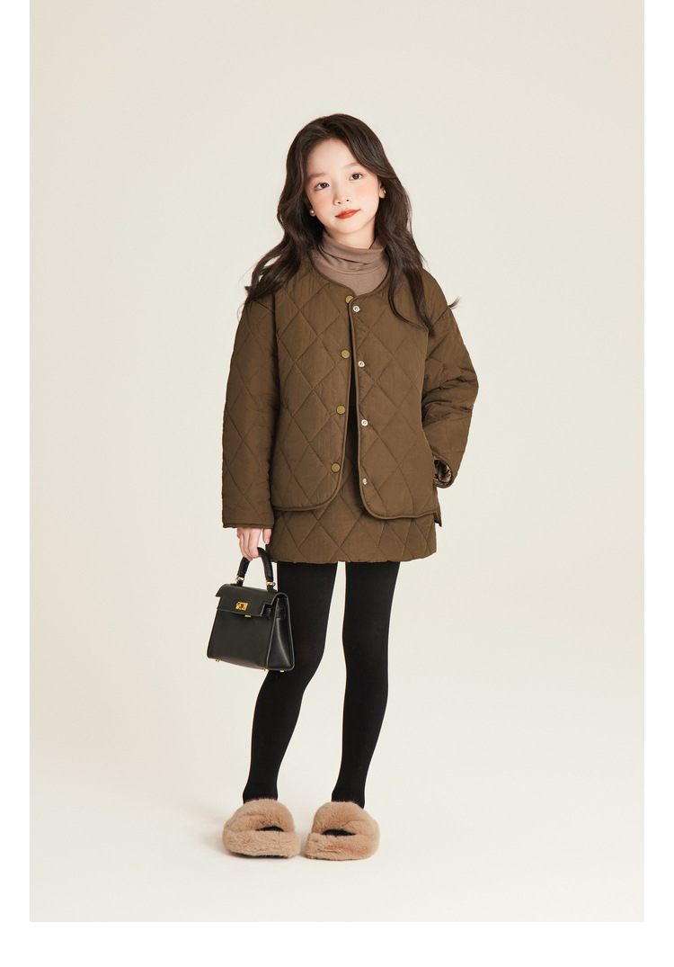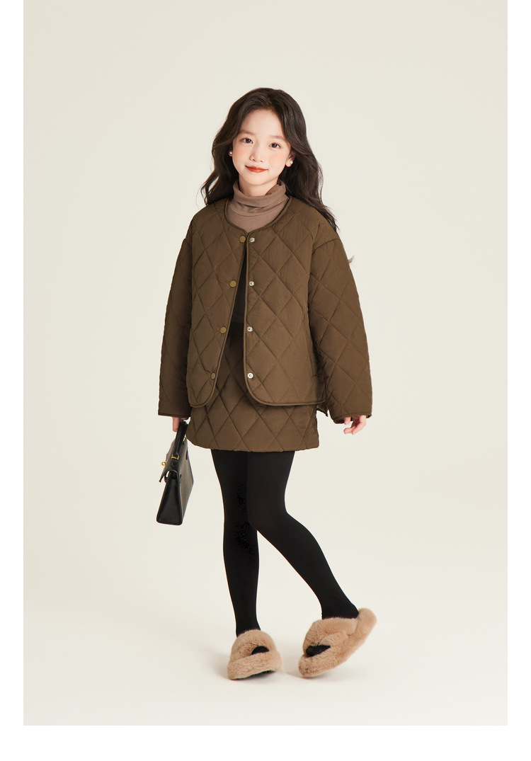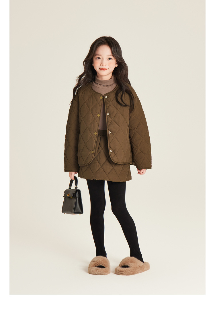 Amybaby 소녀 세트 겨울 2024 새로운 다이아몬드 체크 무늬 단색 둥근 목 따뜻한면 패딩 재킷 스커트