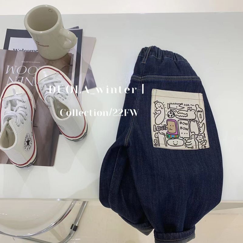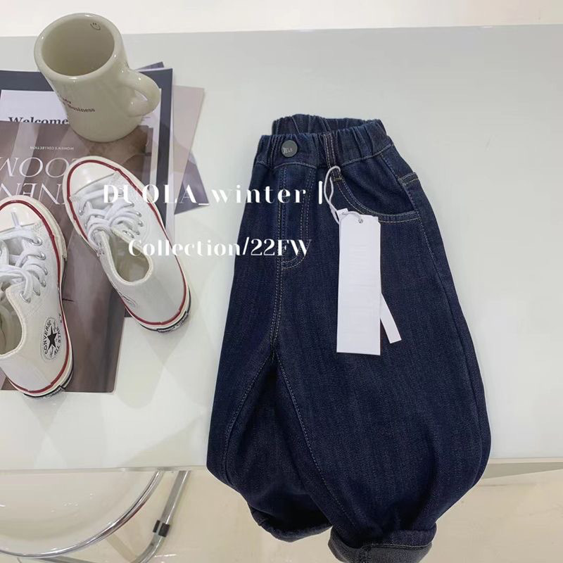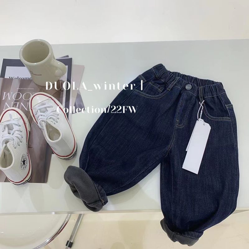 2024 새로운 소년 기모 두꺼운 청바지 부드러운 한국 어린이 소녀 아기 원피스 벨벳 캐주얼 바지 트렌디스토어 가기
