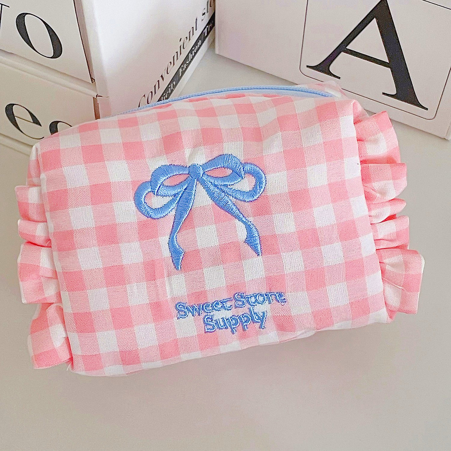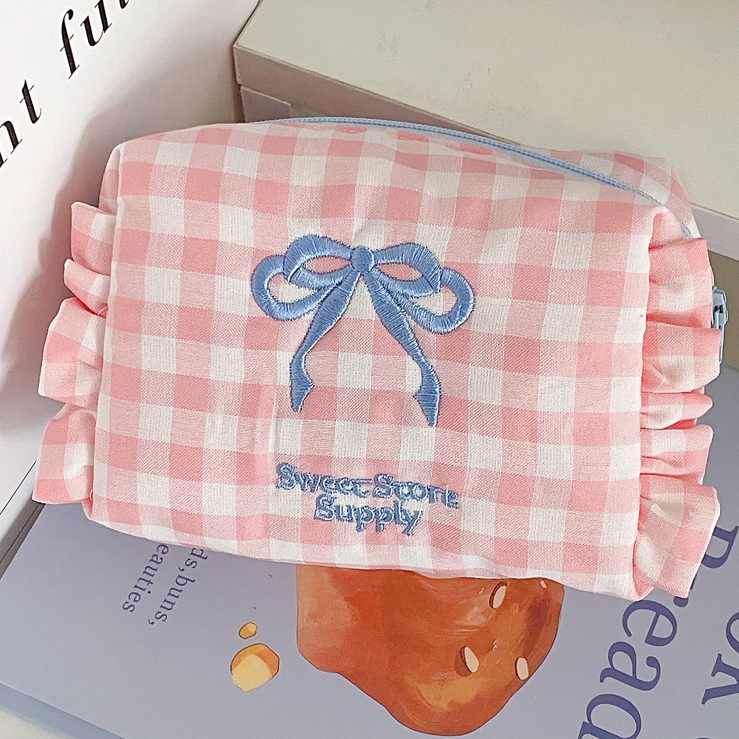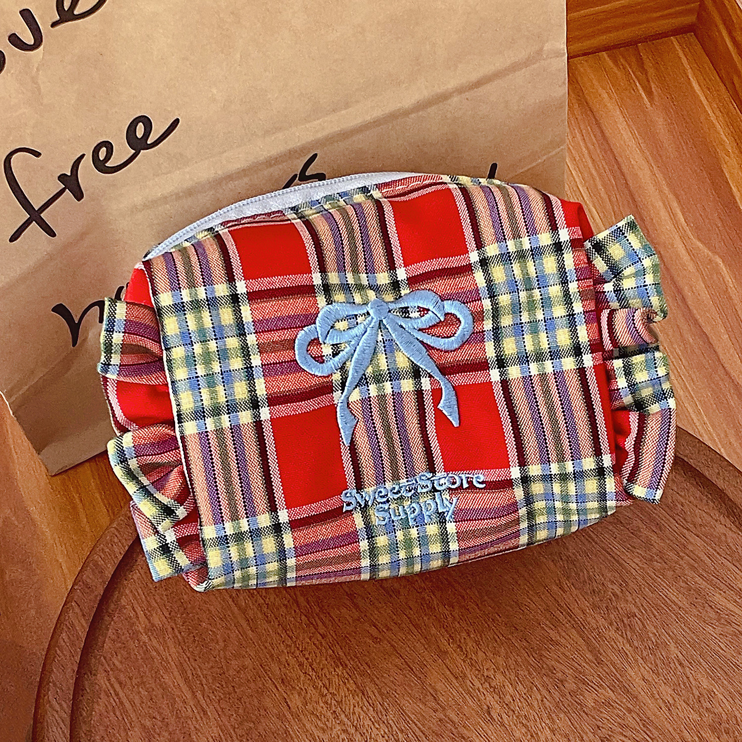 格纹蝴蝶结收纳包学生甜美荷叶边旅行便携绣花洗漱包 产品尺寸:12.5*7*9