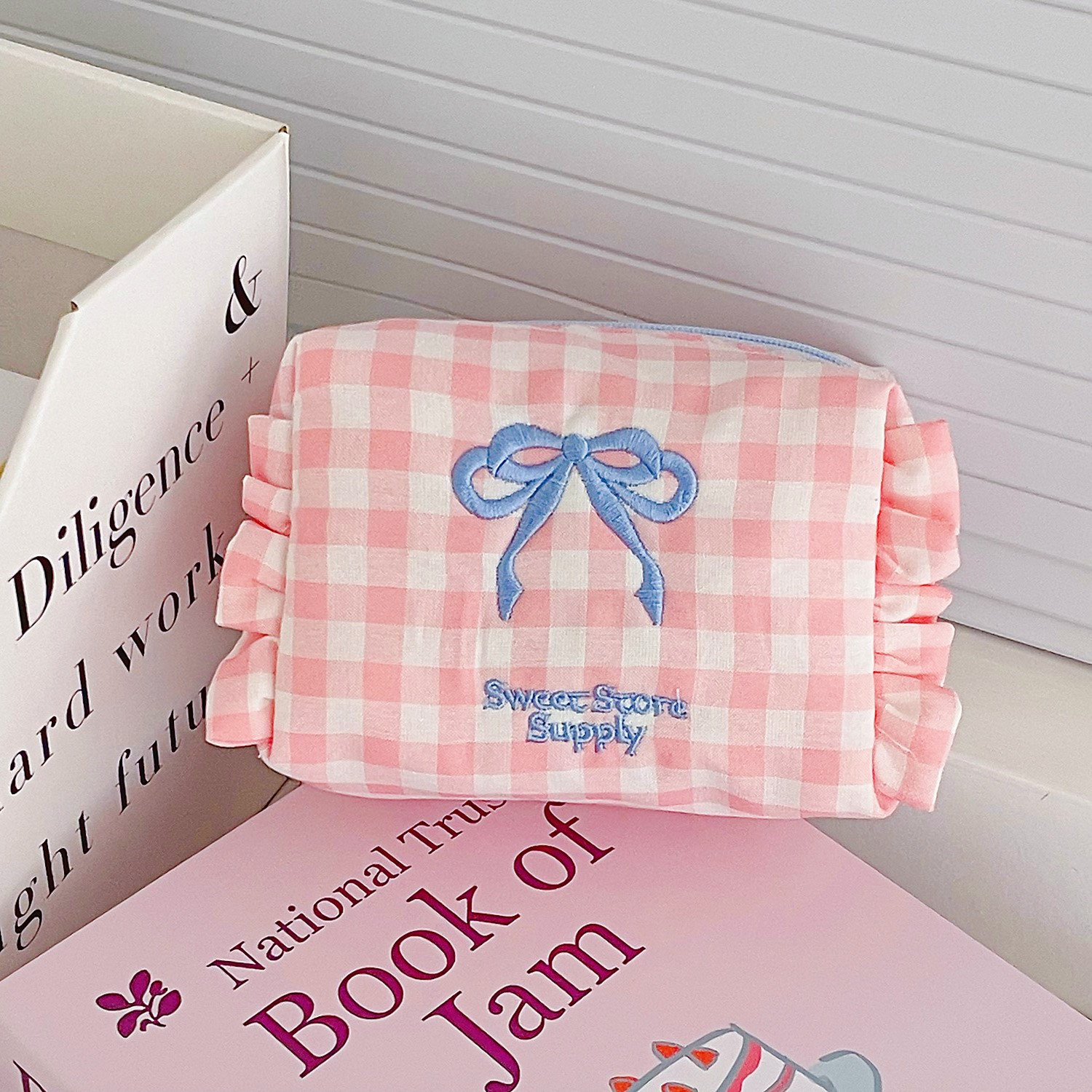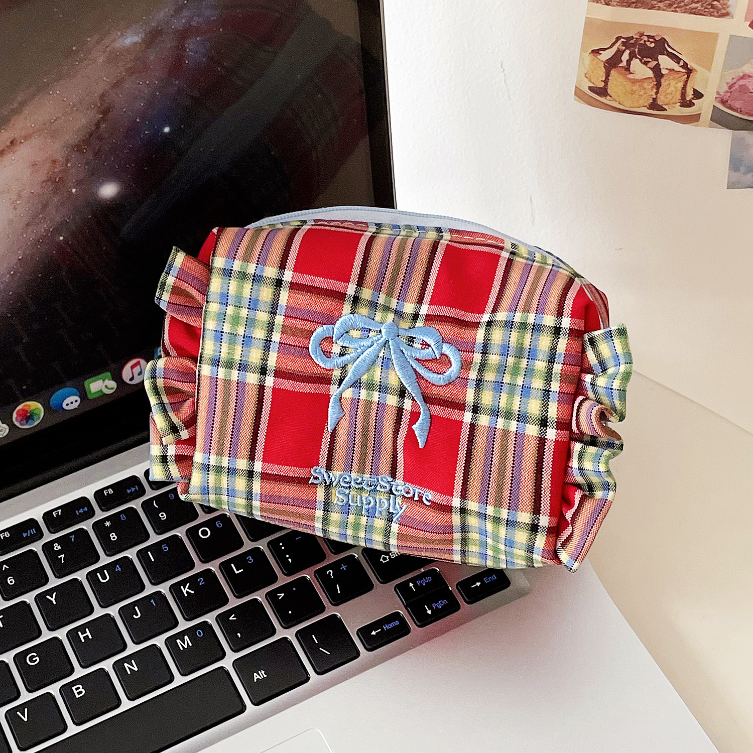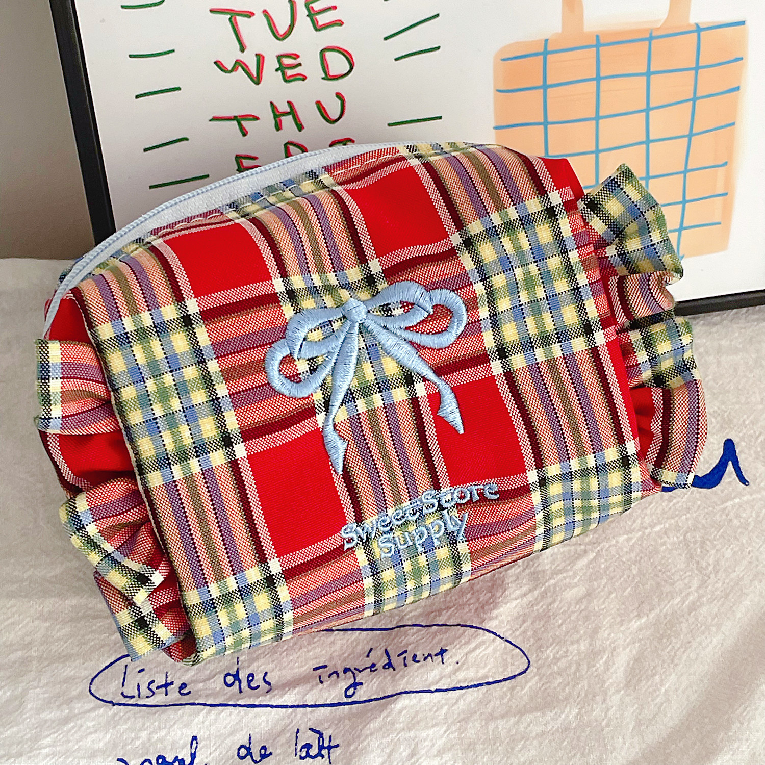 格纹蝴蝶结收纳包学生甜美荷叶边旅行便携绣花洗漱包 产品尺寸:12.5*7*9