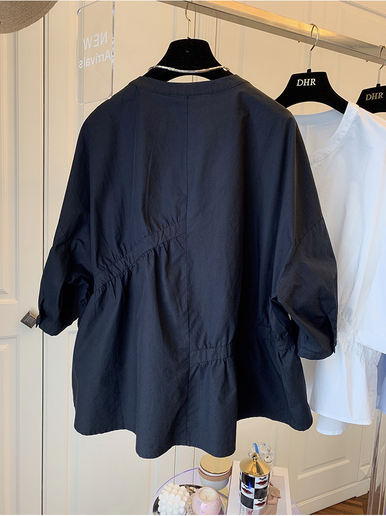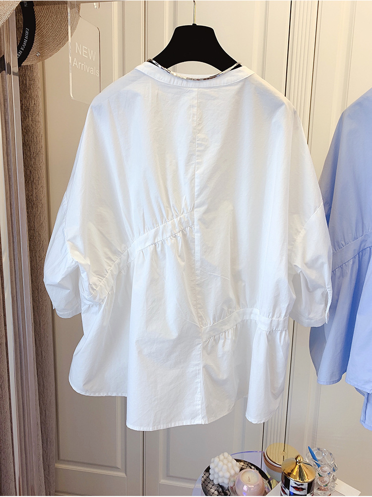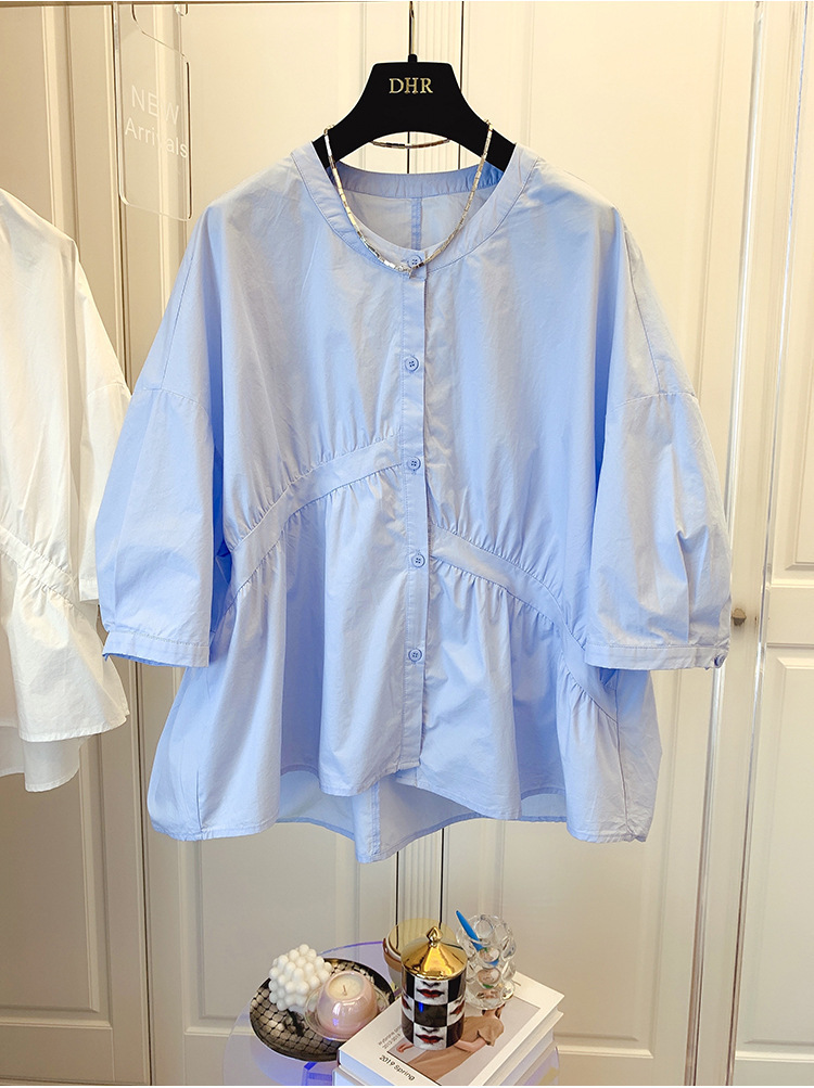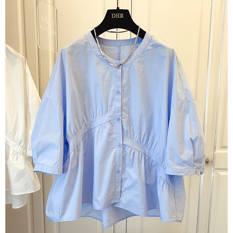 2024 새로운 디자인 감각 한국 느슨한 비대칭 주름 패치 워크 인형 셔츠