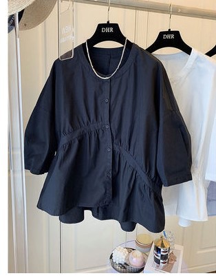 2024 새로운 디자인 감각 한국 느슨한 비대칭 주름 패치 워크 인형 셔츠스토어 가기