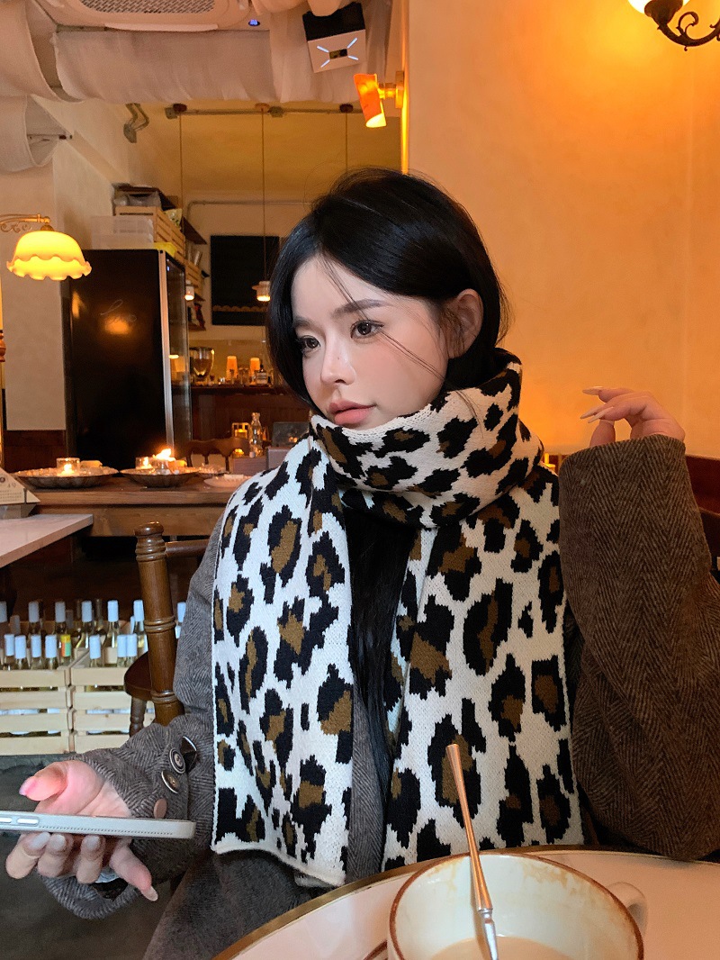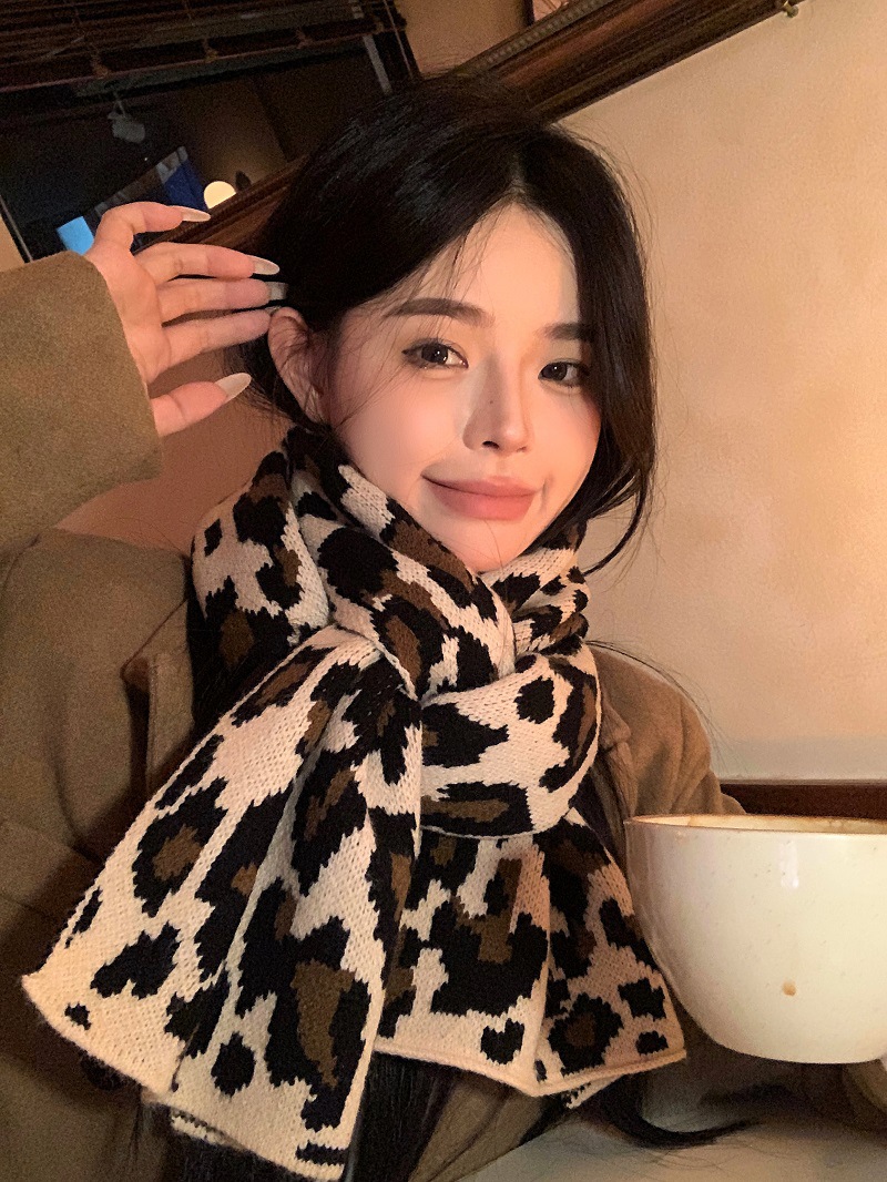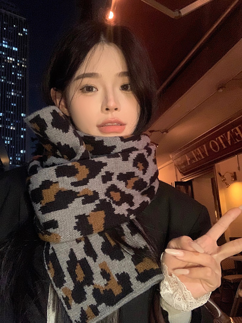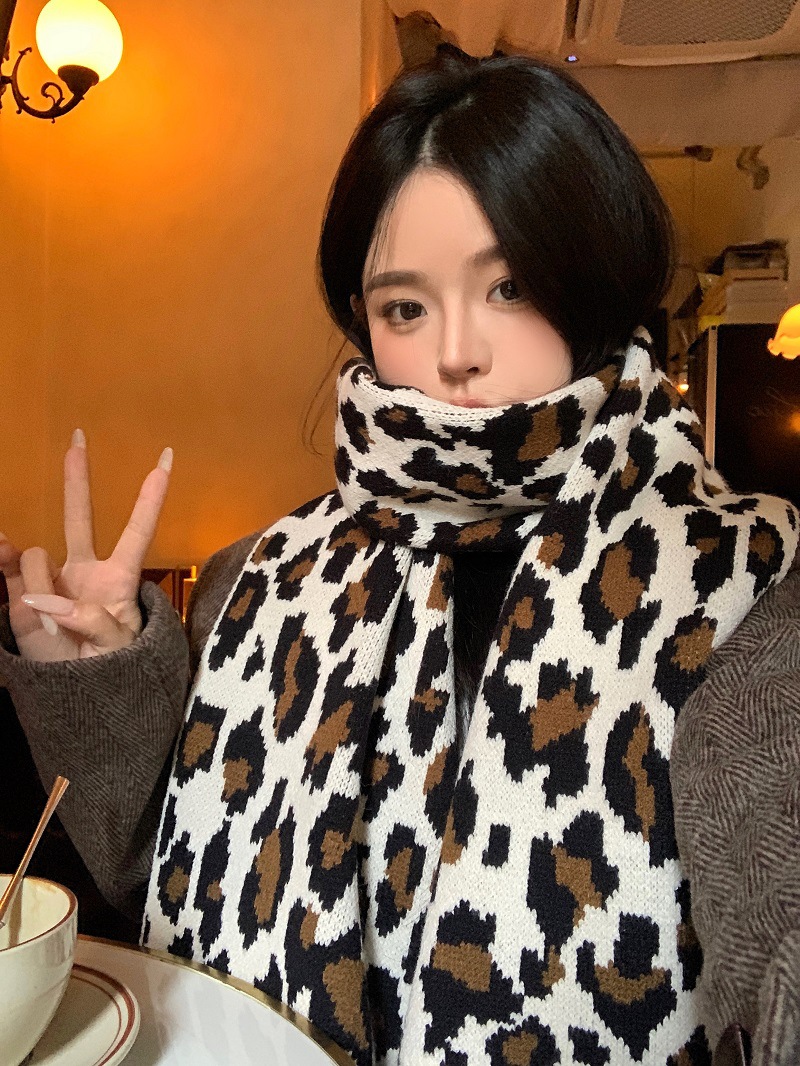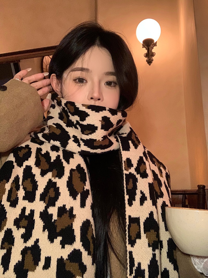 레오파드 울 니트 스카프 여자 가을 겨울 2024 새로운 한국식 올매치 따뜻한 고급 학술 스타일 스카프