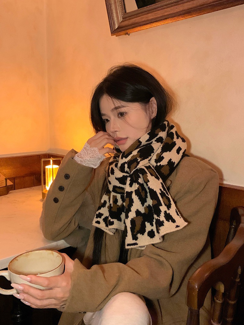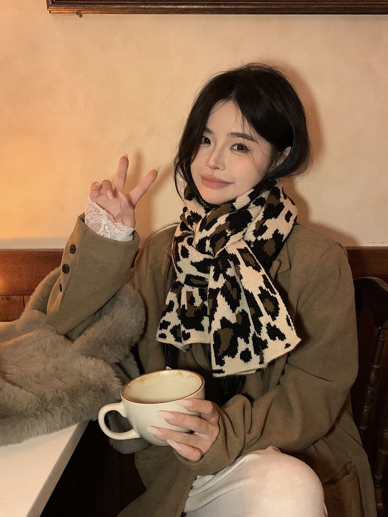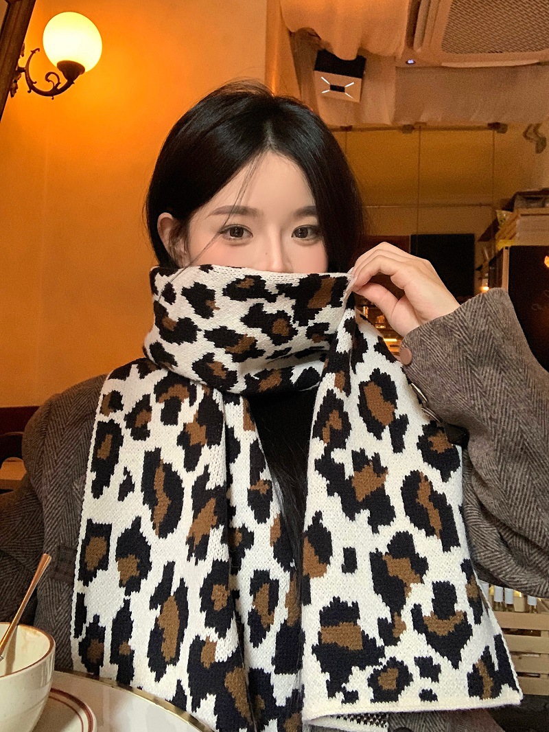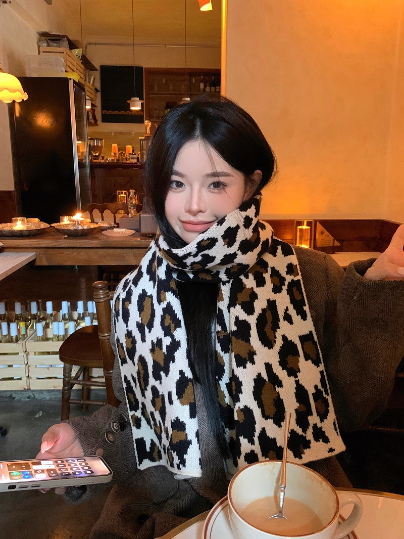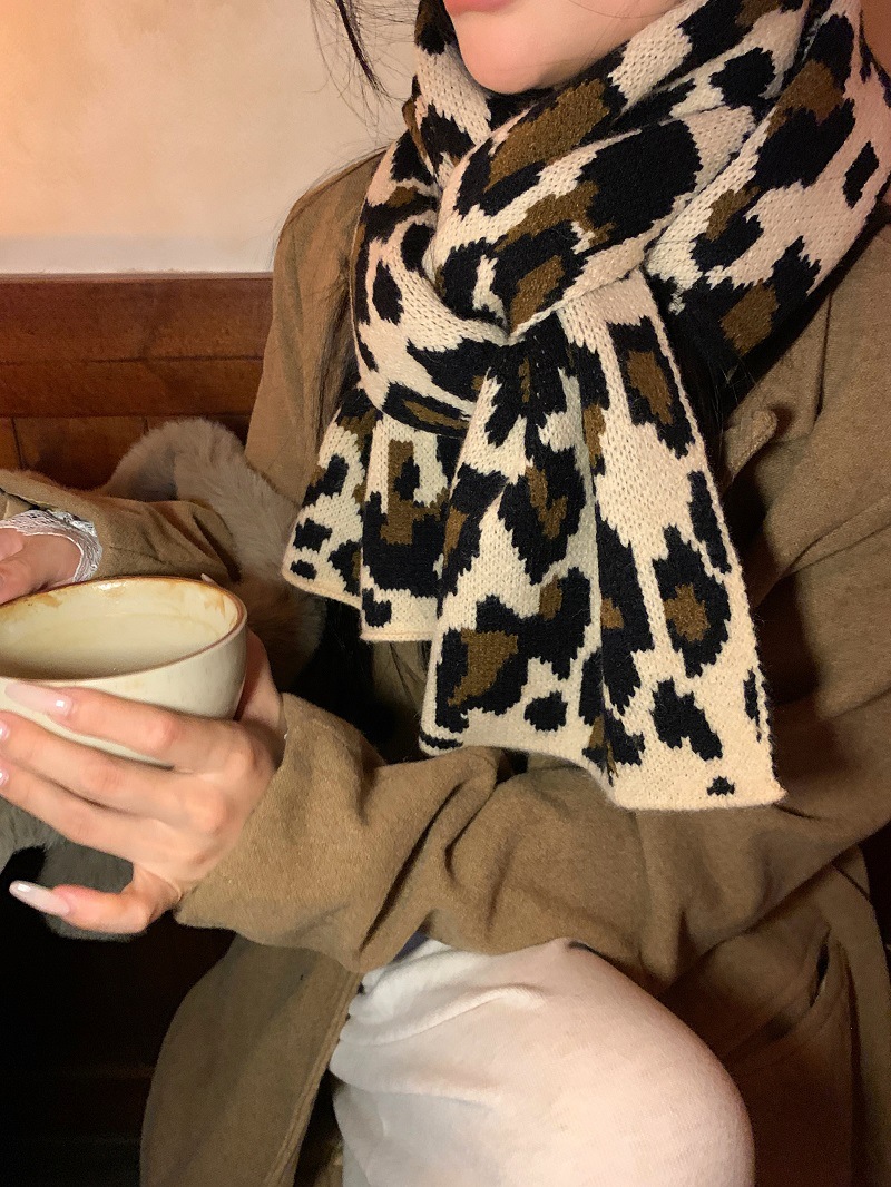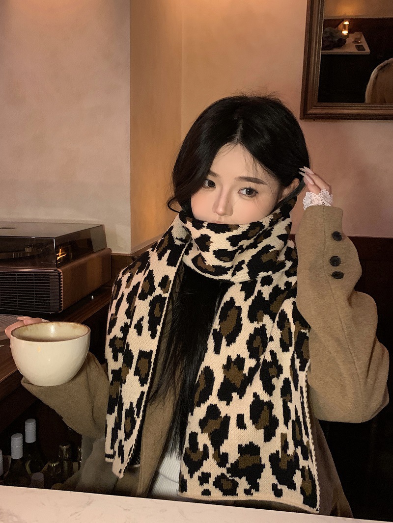레오파드 울 니트 스카프 여자 가을 겨울 2024 새로운 한국식 올매치 따뜻한 고급 학술 스타일 스카프