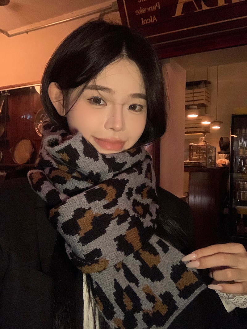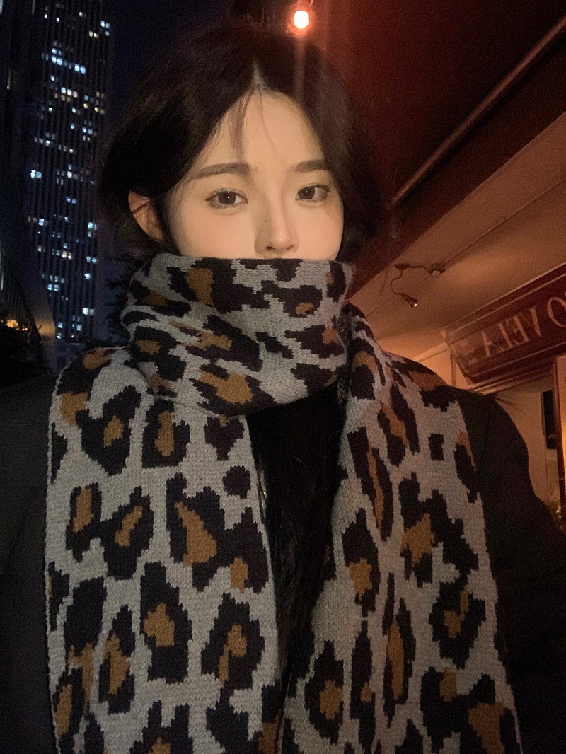 레오파드 울 니트 스카프 여자 가을 겨울 2024 새로운 한국식 올매치 따뜻한 고급 학술 스타일 스카프스토어 가기
