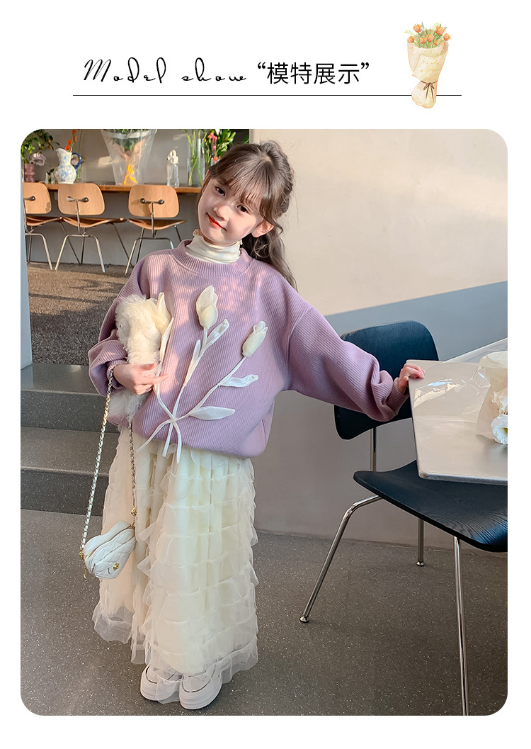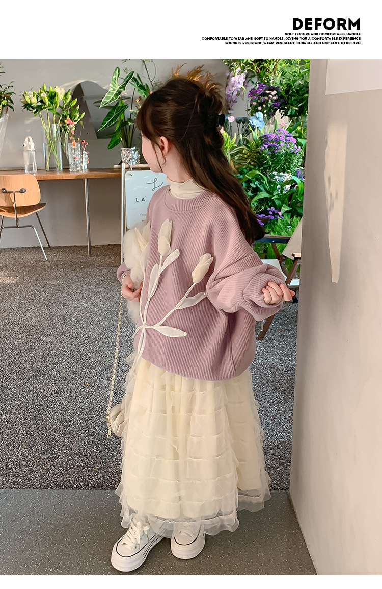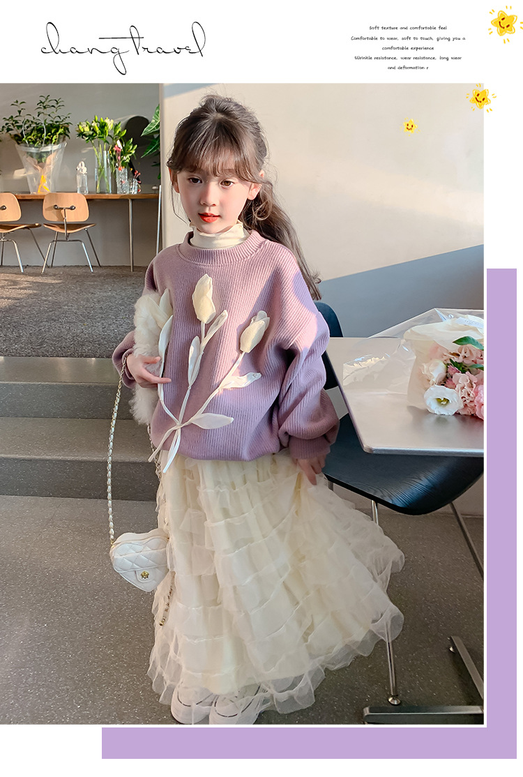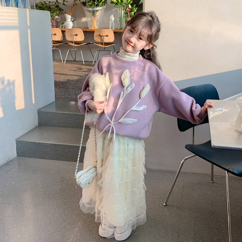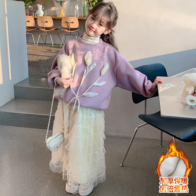 여자 세트 가을 겨울 새로운 어린이 입체 꽃 스웨터 기모 한국 공주 원사 스커트 투피스 세트